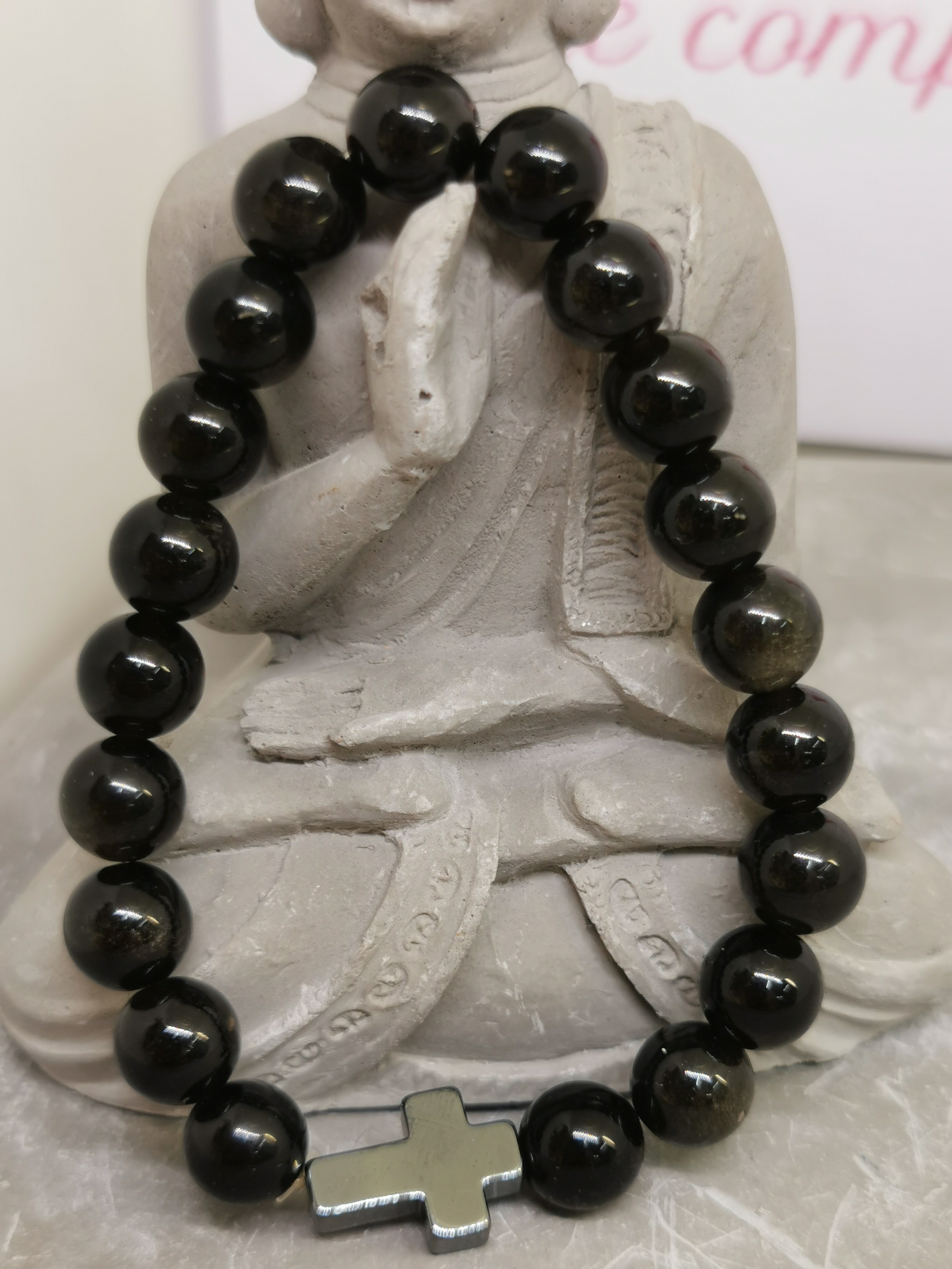 Bracelet Obsidienne Dorée & Croix en Hématite