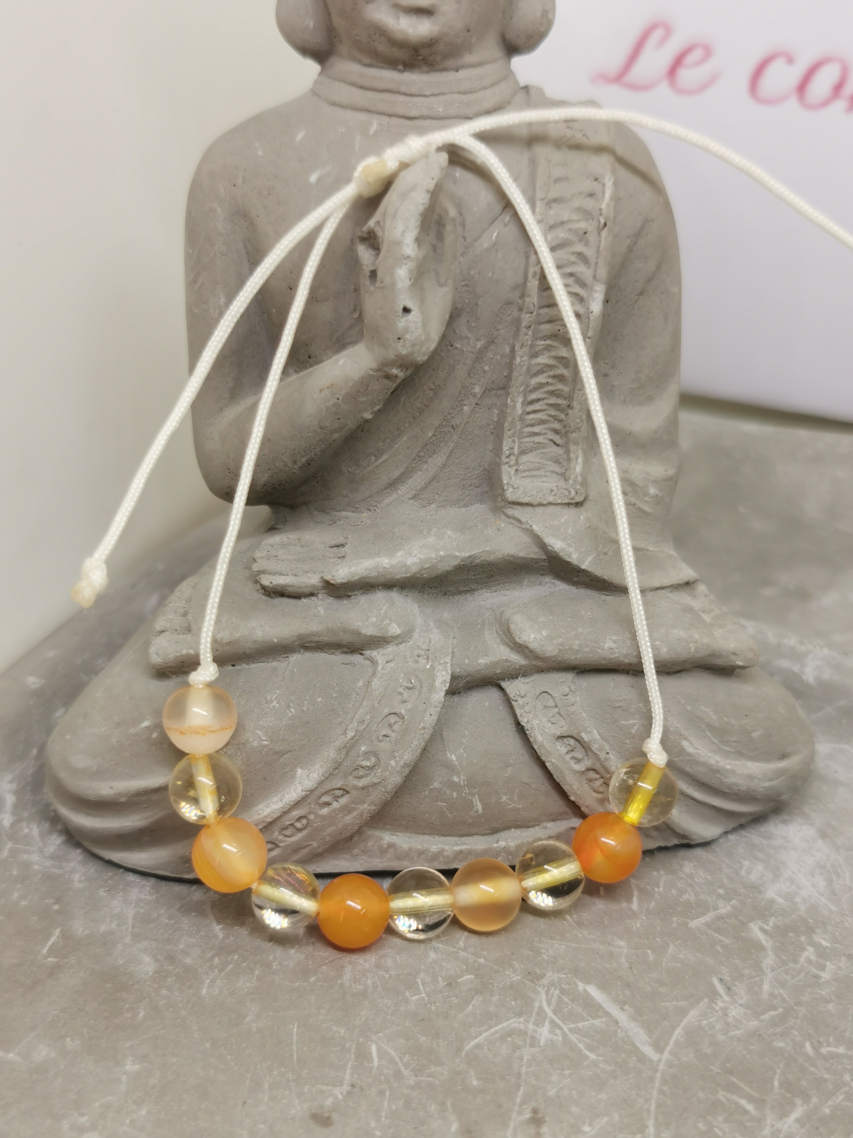 Composé de citrine et de cornaline, il agit comme un soutien symbolique pour favoriser l’apaisement, la détente et l’harmonie du corps. Son cordon blanc réglable lui confère une légèreté et une discrétion idéales pour un port quotidien.