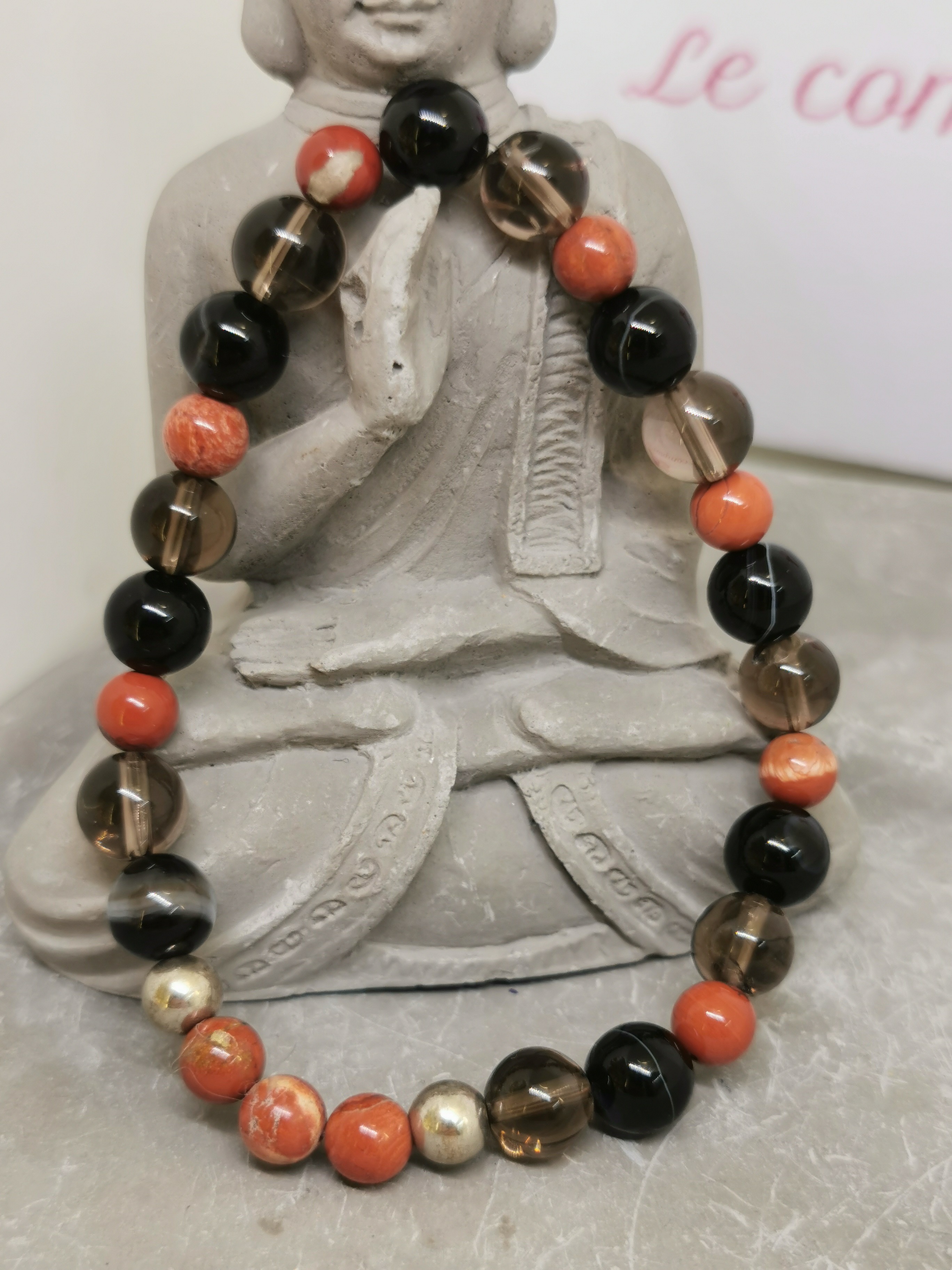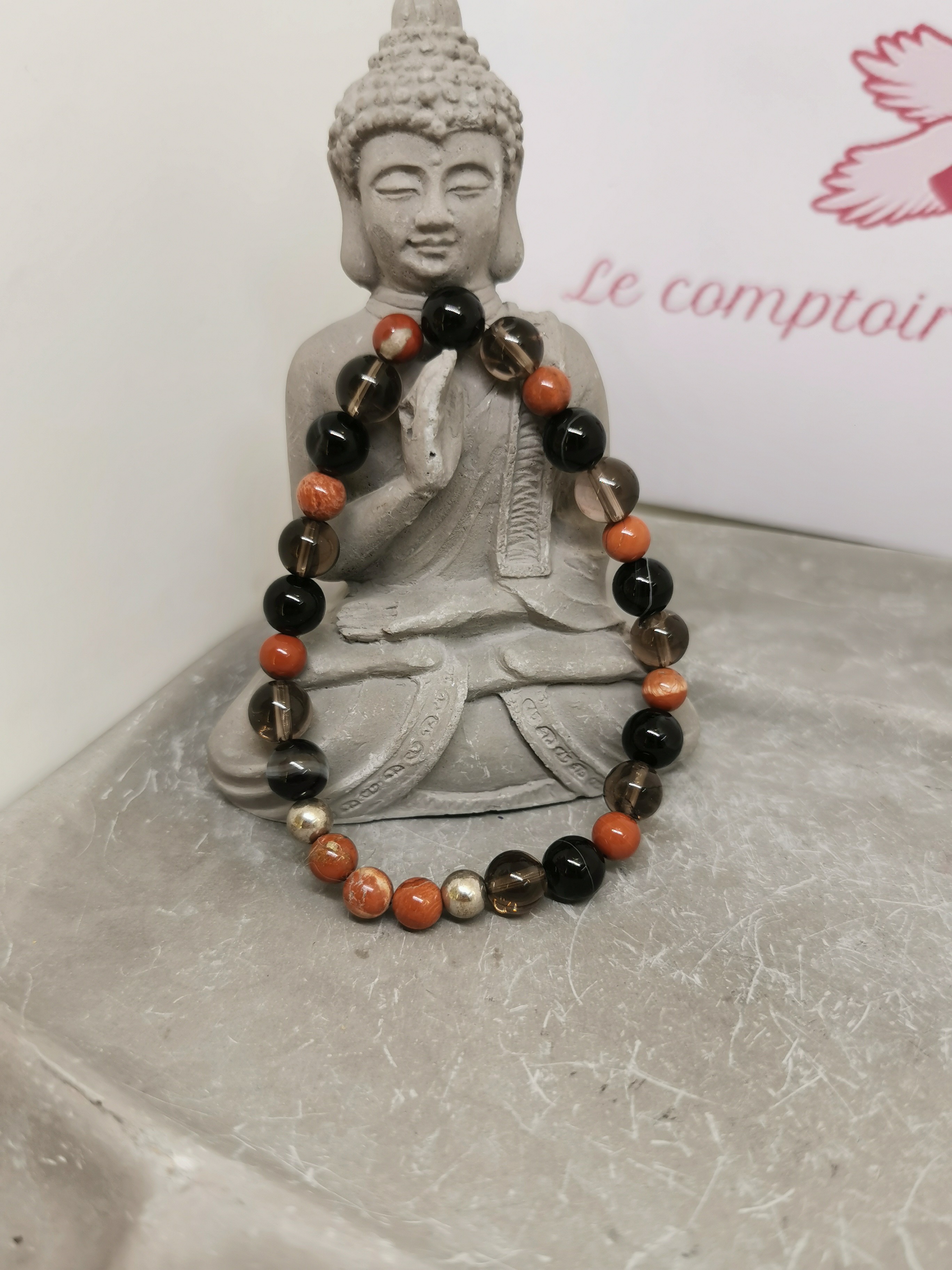Composé d’agate noire, de jaspe rouge et de quartz fumé, il associe des pierres profondément reliées à l’énergie du corps et à la force intérieure. Il est idéal pour accompagner les périodes où l’on souhaite retrouver équilibre, enracinement et énergie.