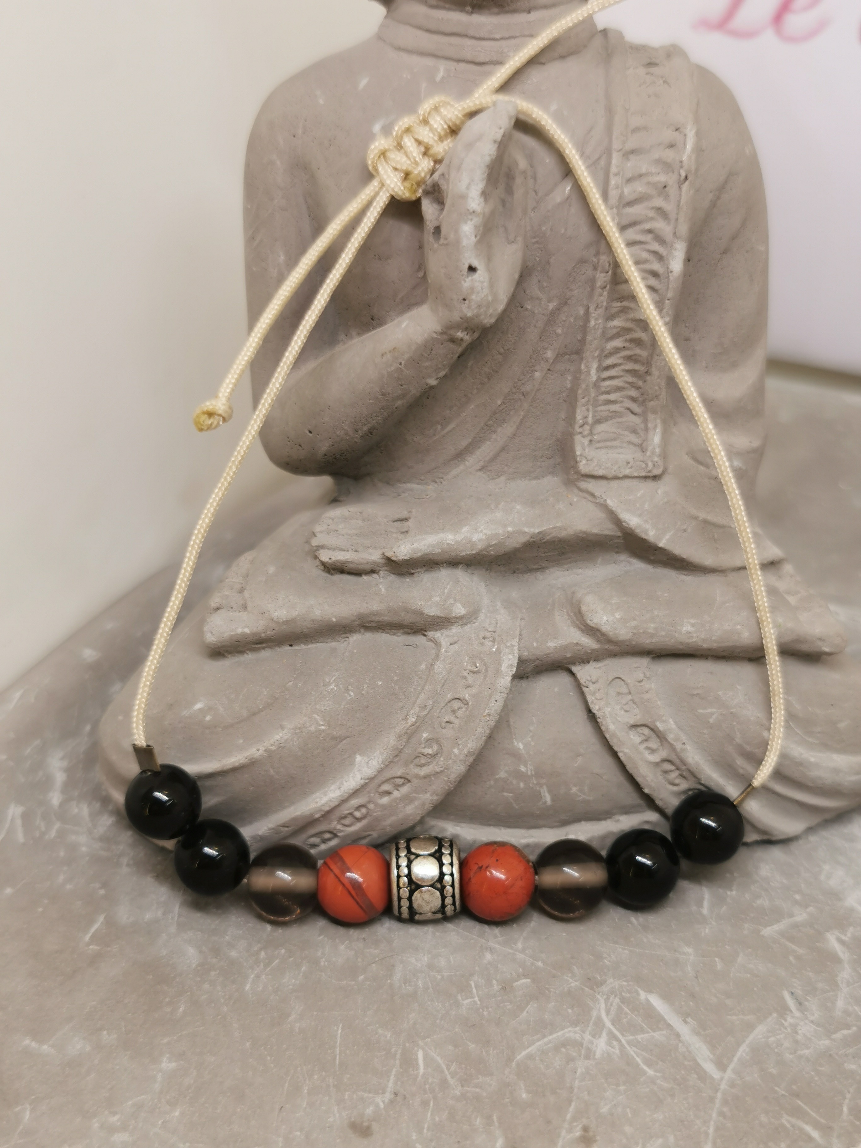 Composé d’agate noire, de jaspe rouge et de quartz fumé, il agit comme un rappel d’alignement entre le corps et l’esprit, tout en apportant une énergie rassurante et stabilisante.