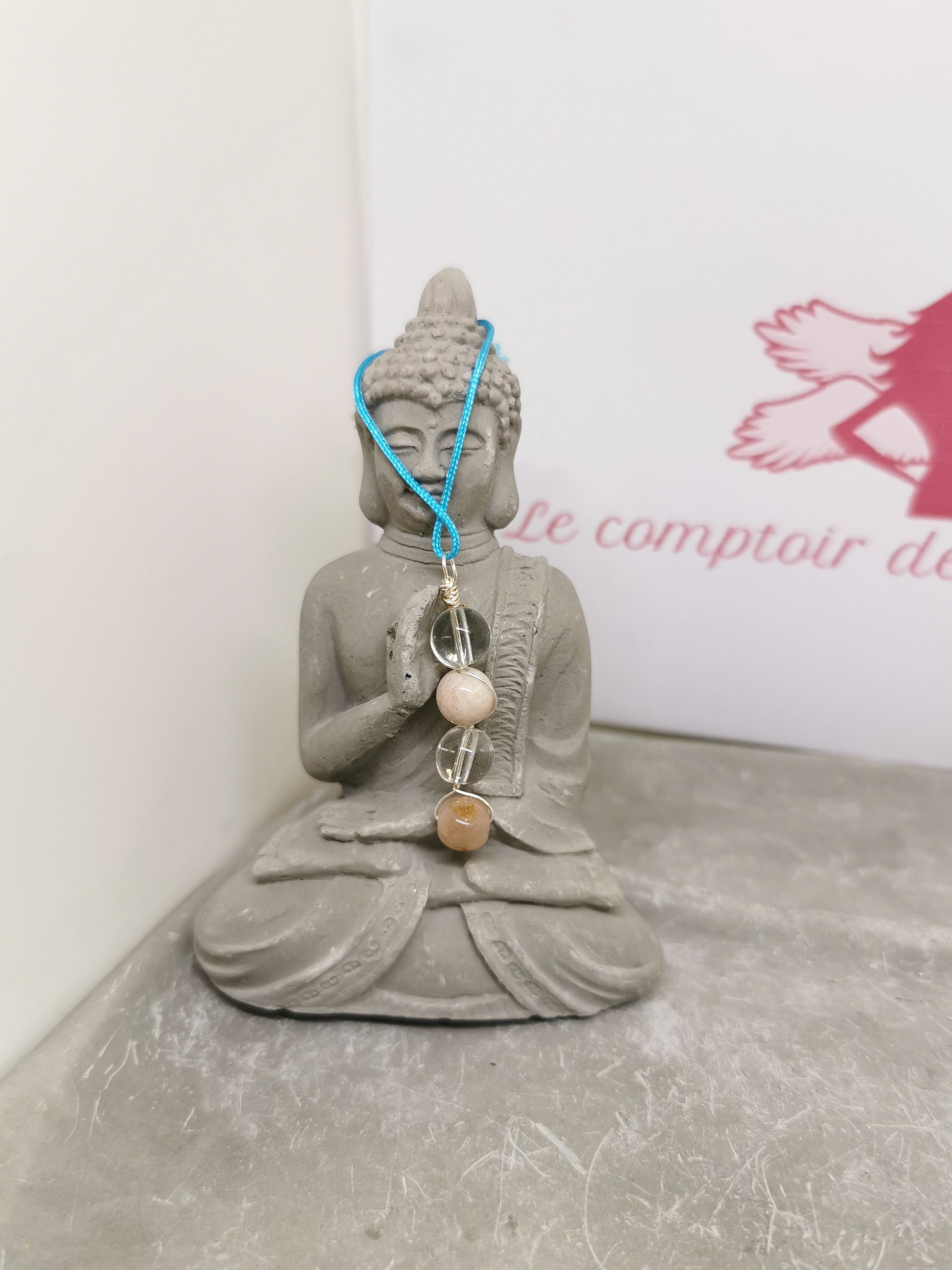Ce pendentif en pierres naturelles associe la pureté du cristal de roche à la douceur enveloppante de la pierre de lune rose. Monté sur câble doré, il offre un bijou délicat, lumineux et profondément apaisant.