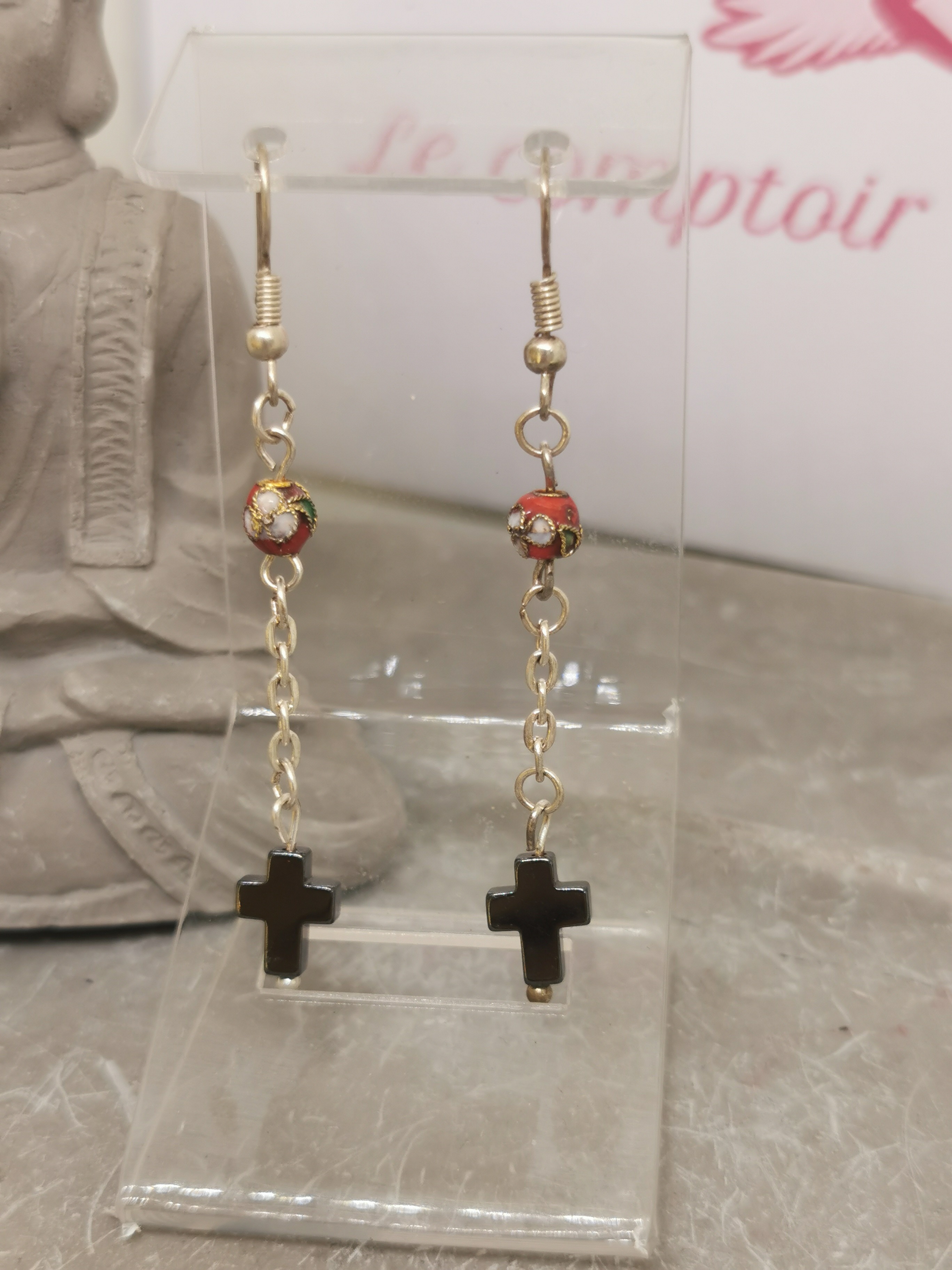 Ces boucles d’oreilles associent la puissance symbolique de la croix en hématite à la délicatesse d’une perle florale, créant un bijou à la fois protecteur et raffiné.