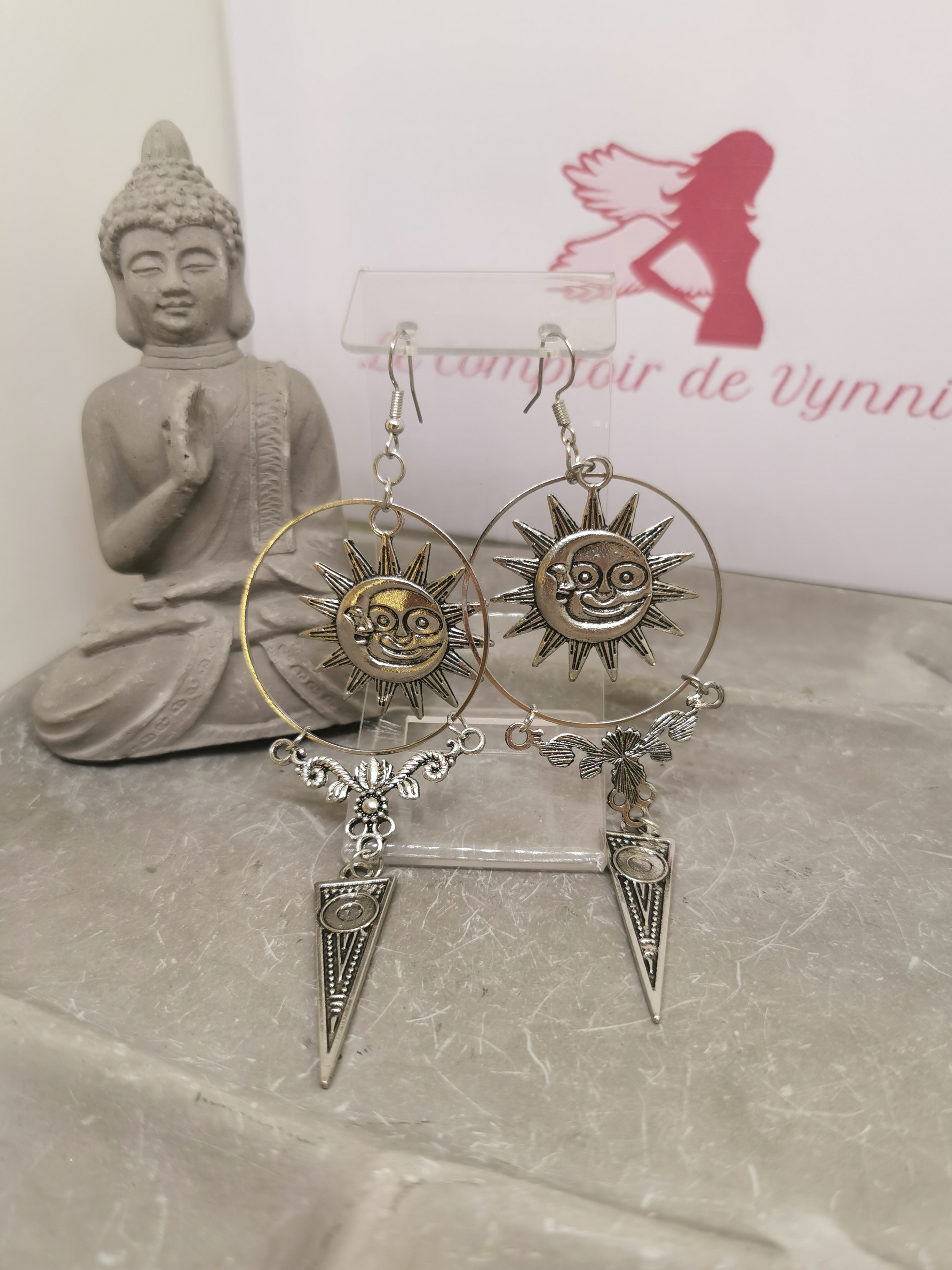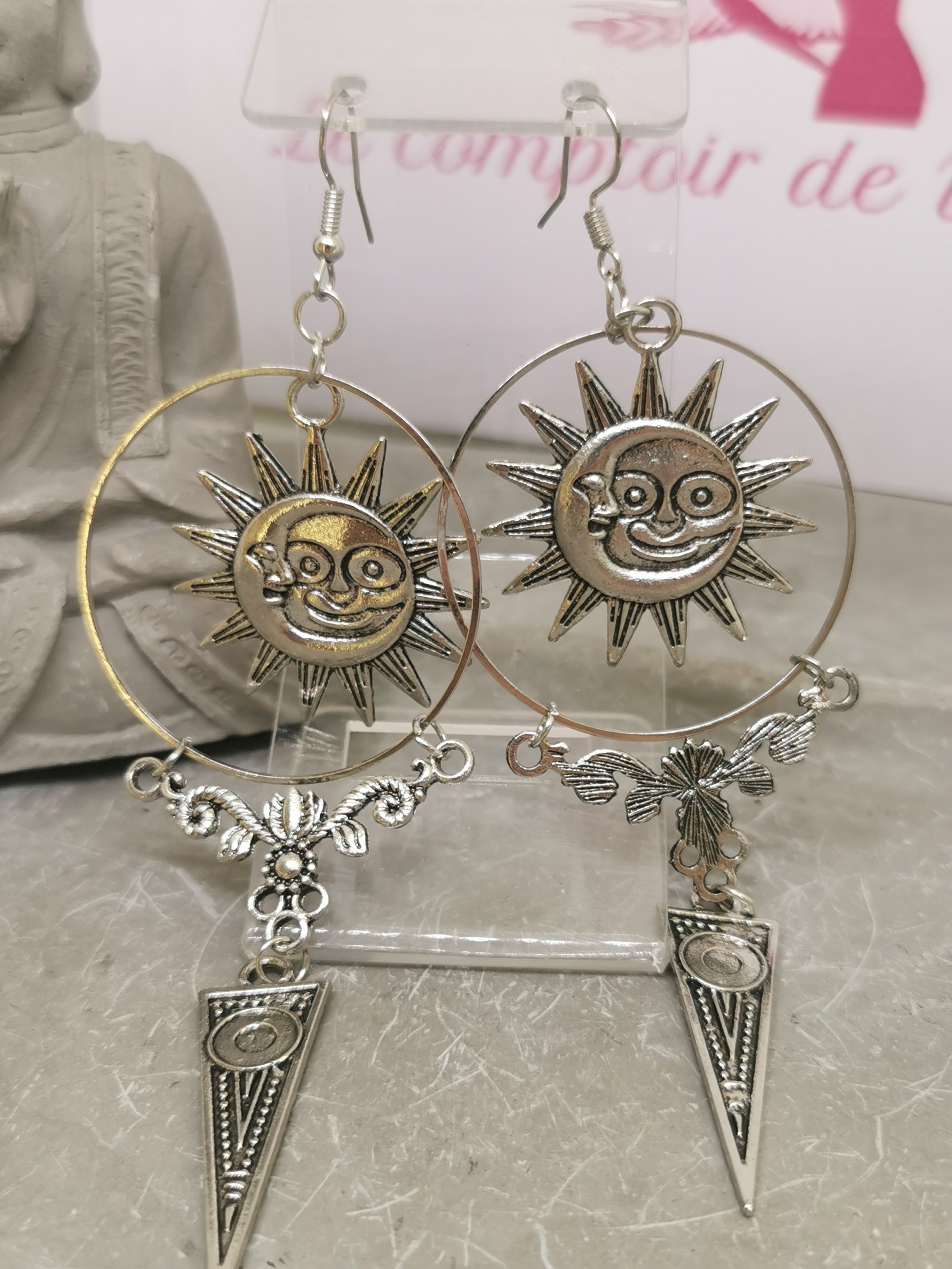 Ces boucles d’oreilles en acier couleur argenté incarnent la rencontre du Soleil et de la Lune, symboles puissants d’équilibre et de dualité. Leur design original associe un cercle central solaire, des éléments décoratifs délicats inspirés du lotus et un pendentif triangulaire, renforçant leur dimension spirituelle et esthétique.