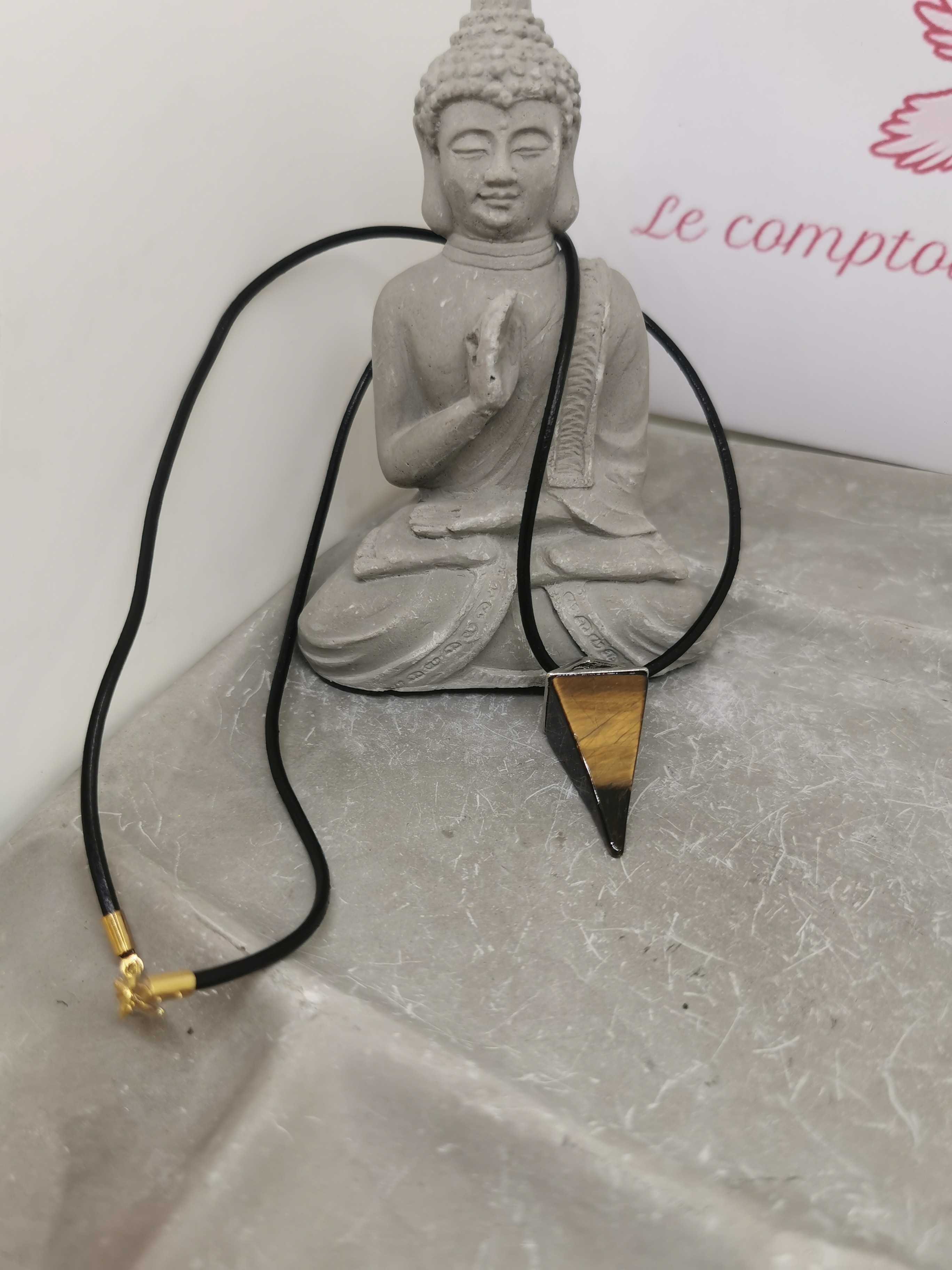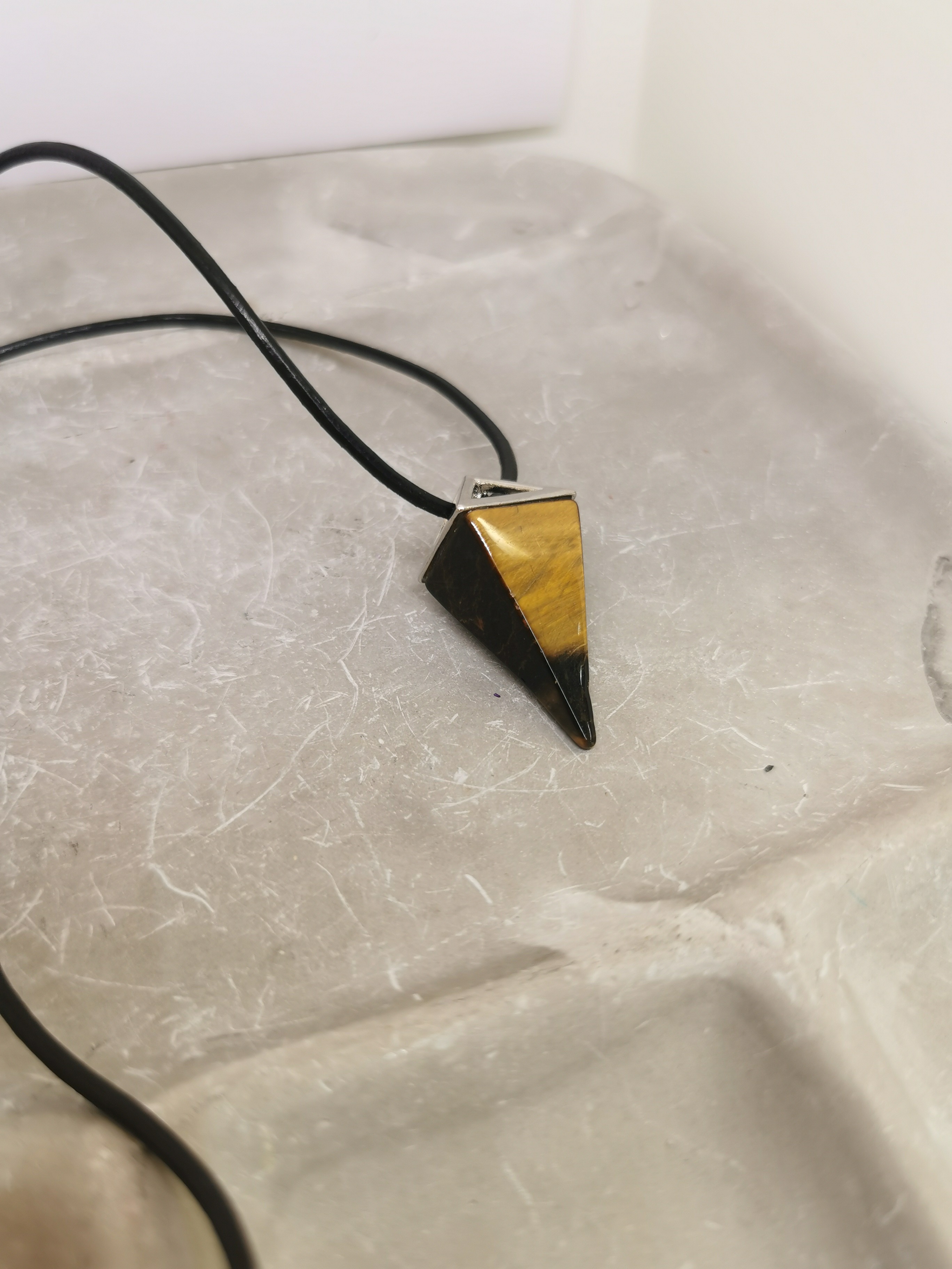 Ce collier en œil du tigre, taillé en forme de prisme (pointe), est un bijou puissant et élégant, conçu pour allier style et protection énergétique.