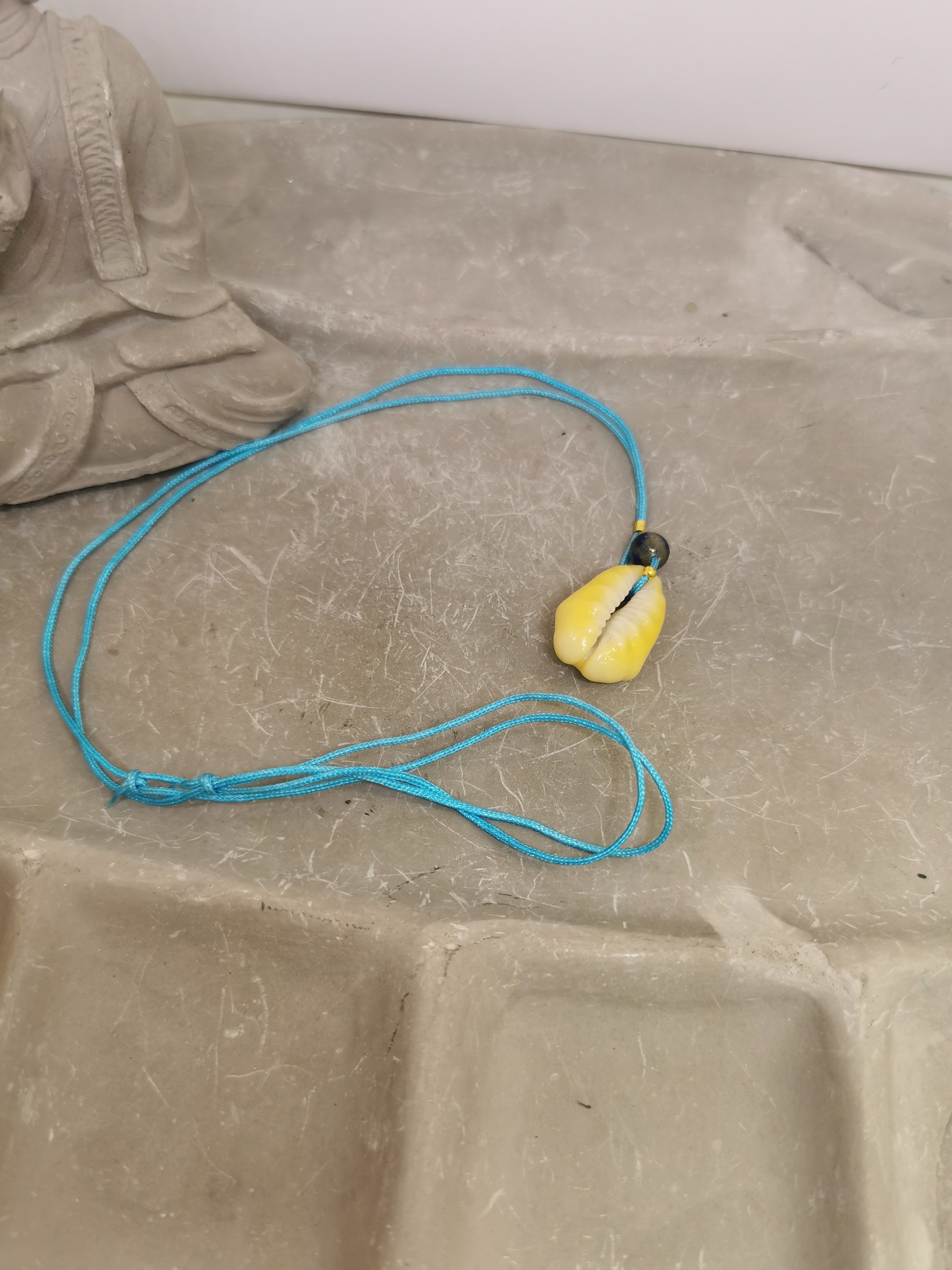 Monté sur un cordon bleu réglable, il s’adapte facilement à toutes les morphologies et styles. Le contraste entre le coquillage clair, la perle bleue intense et la touche dorée apporte une élégance simple et naturelle.