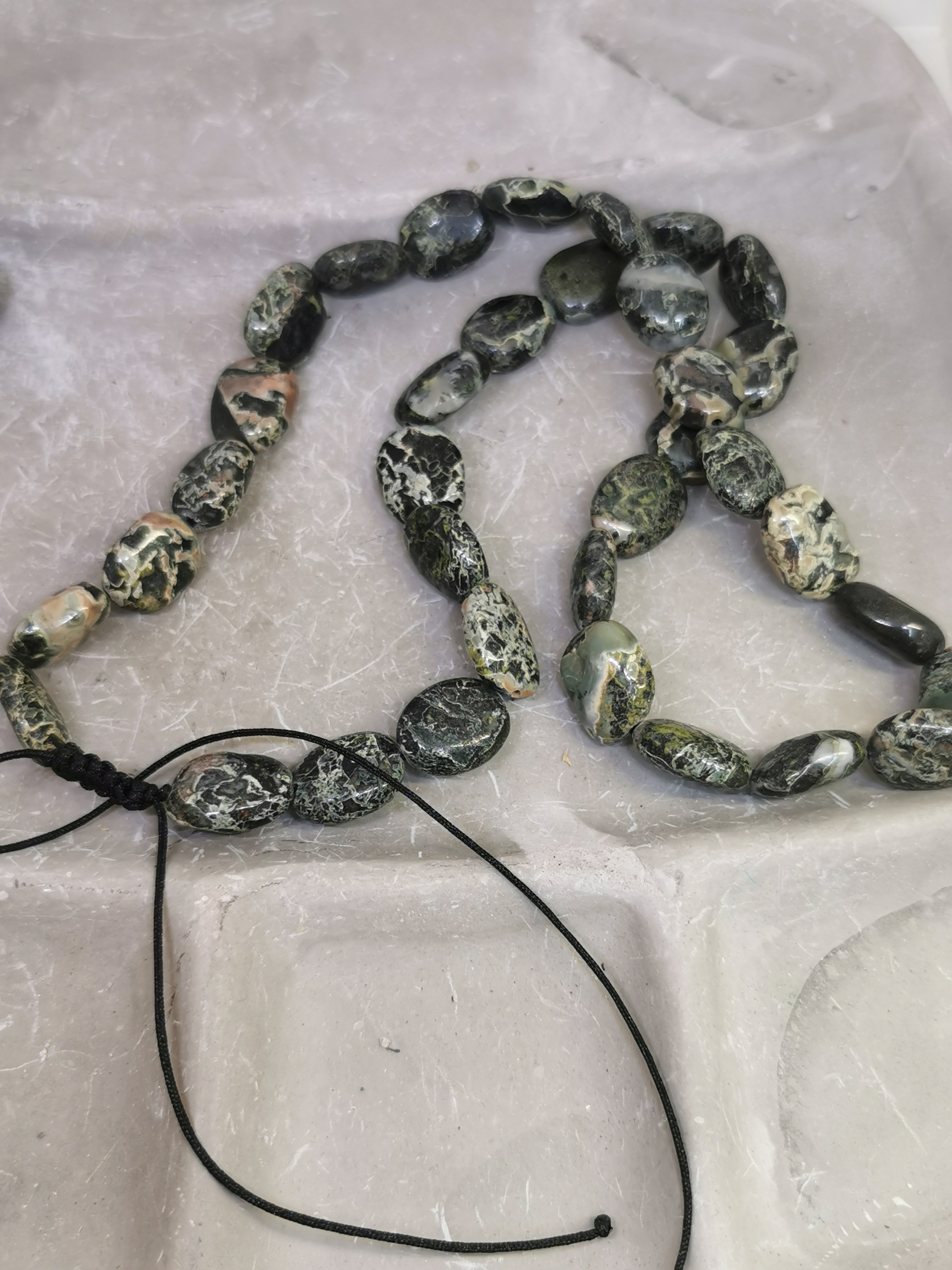 Ce collier est composé de magnifiques pierres de serpentine polies en forme ovale, montées sur un cordon noir réglable pour un ajustement parfait.