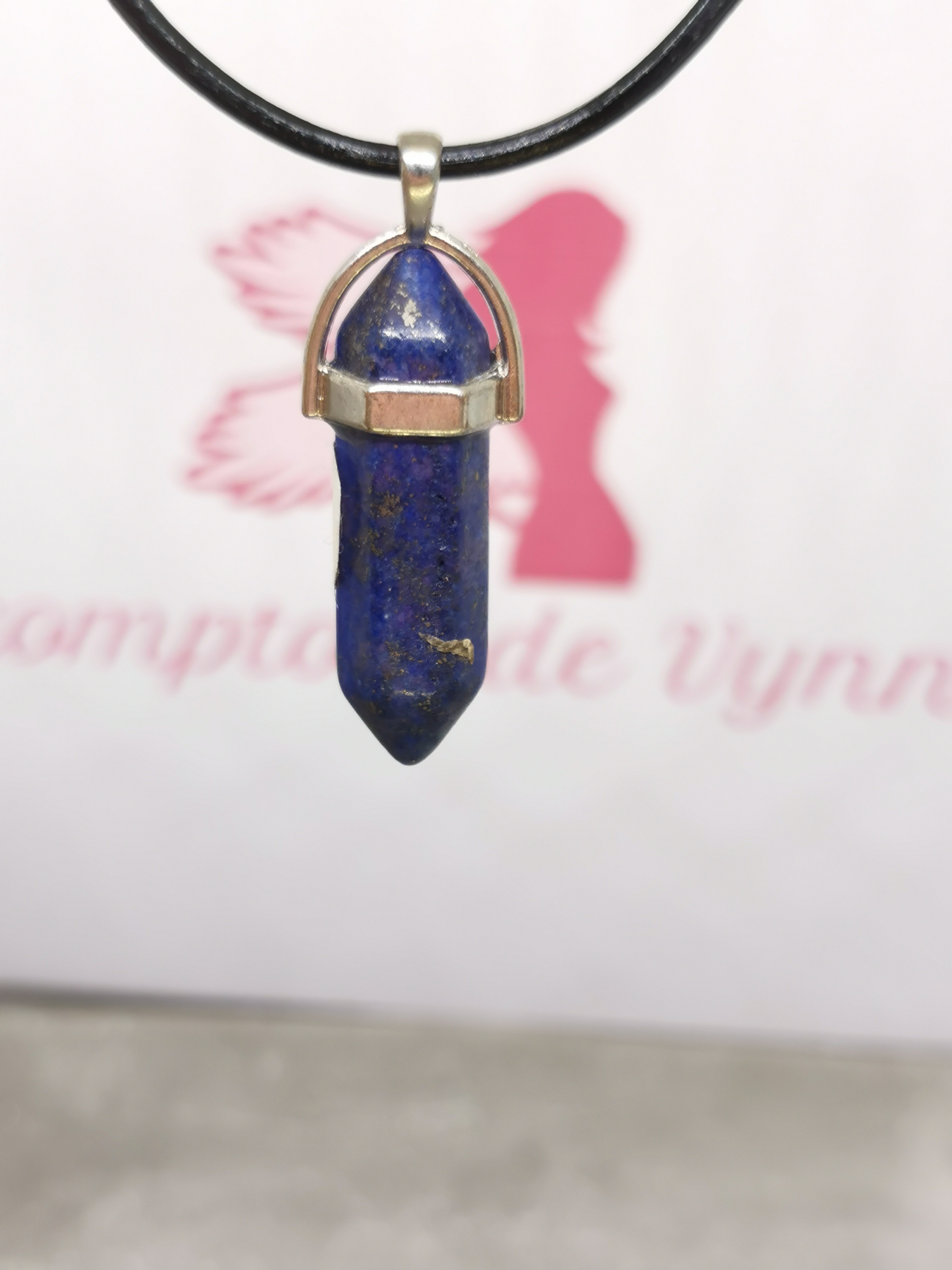 Sa forme allongée et structurée apporte une touche élégante et moderne, tout en renforçant la symbolique énergétique de la pierre. Le contraste entre le bleu profond du lapis lazuli et le noir du cordon met en valeur la beauté naturelle du minéral.