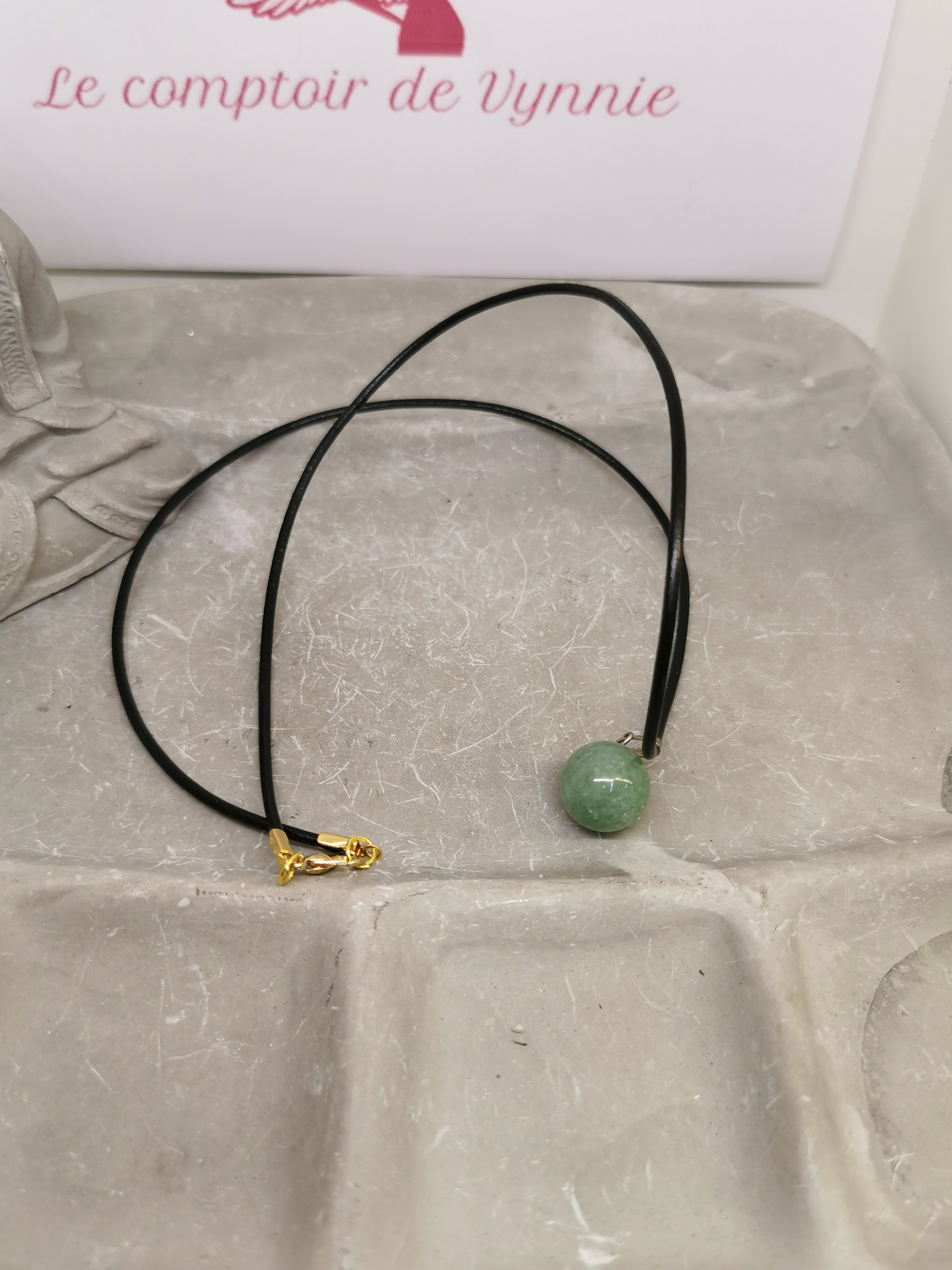 Ce collier se compose d’un pendentif en aventurine verte taillée en forme de boule, monté sur un cordon en cuir tressé noir non réglable.