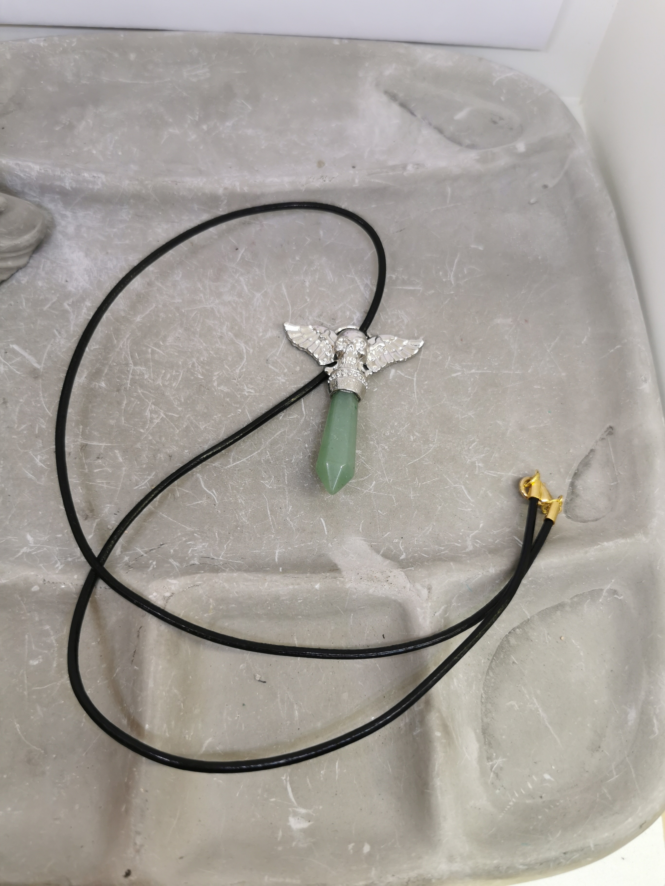 Monté sur un cordon en cuir tressé noir non réglable, ce bijou allie robustesse, caractère et symbolique forte. Le contraste entre la douceur du vert de l’aventurine et l’intensité du motif ailé crée un équilibre entre apaisement et puissance.