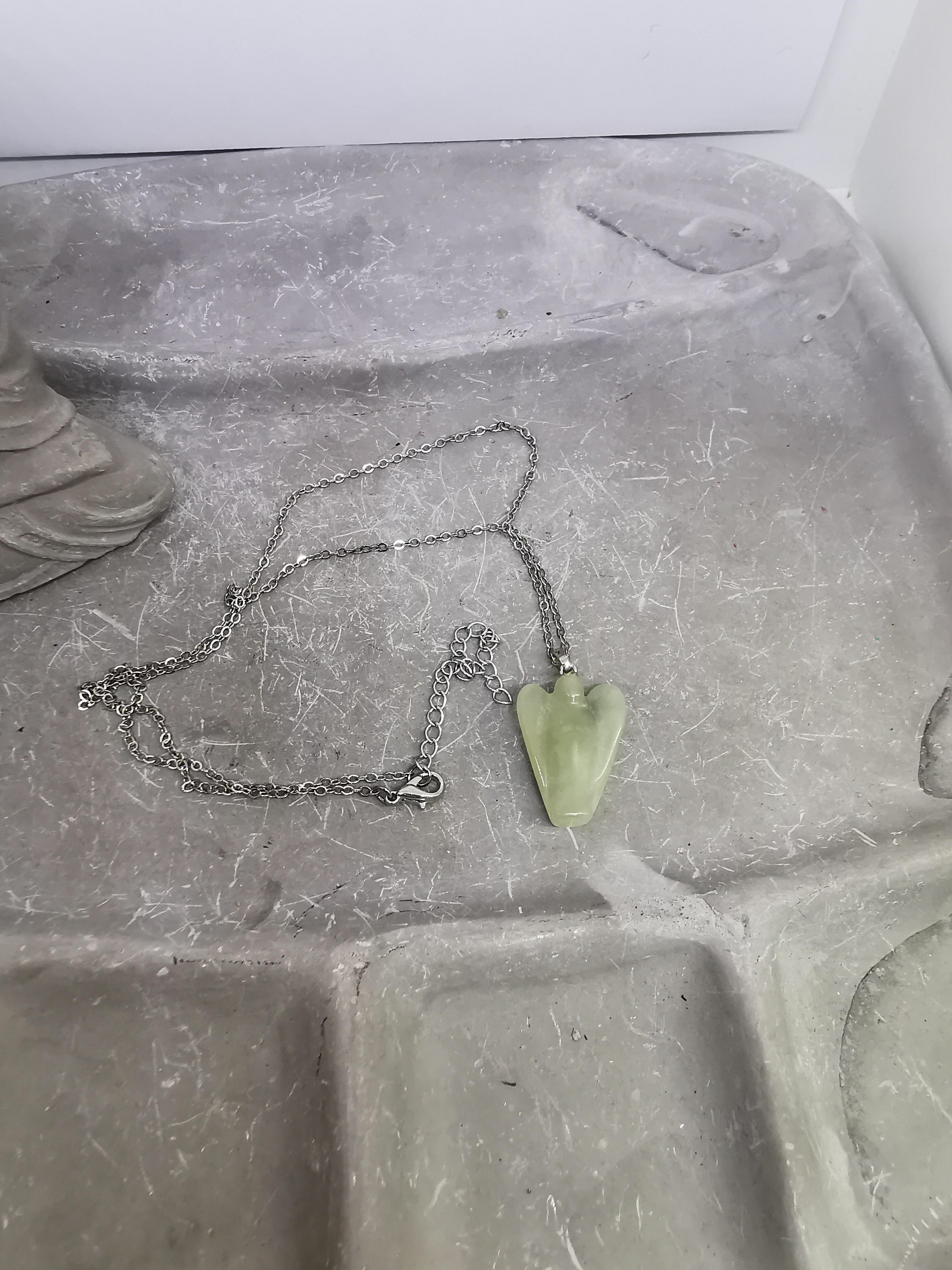 Monté sur une chaîne en argent réglable, il s’adapte facilement à toutes les morphologies et styles. Sa teinte verte douce, associée à la finesse de la sculpture, en fait un bijou à la fois élégant, spirituel et rassurant.