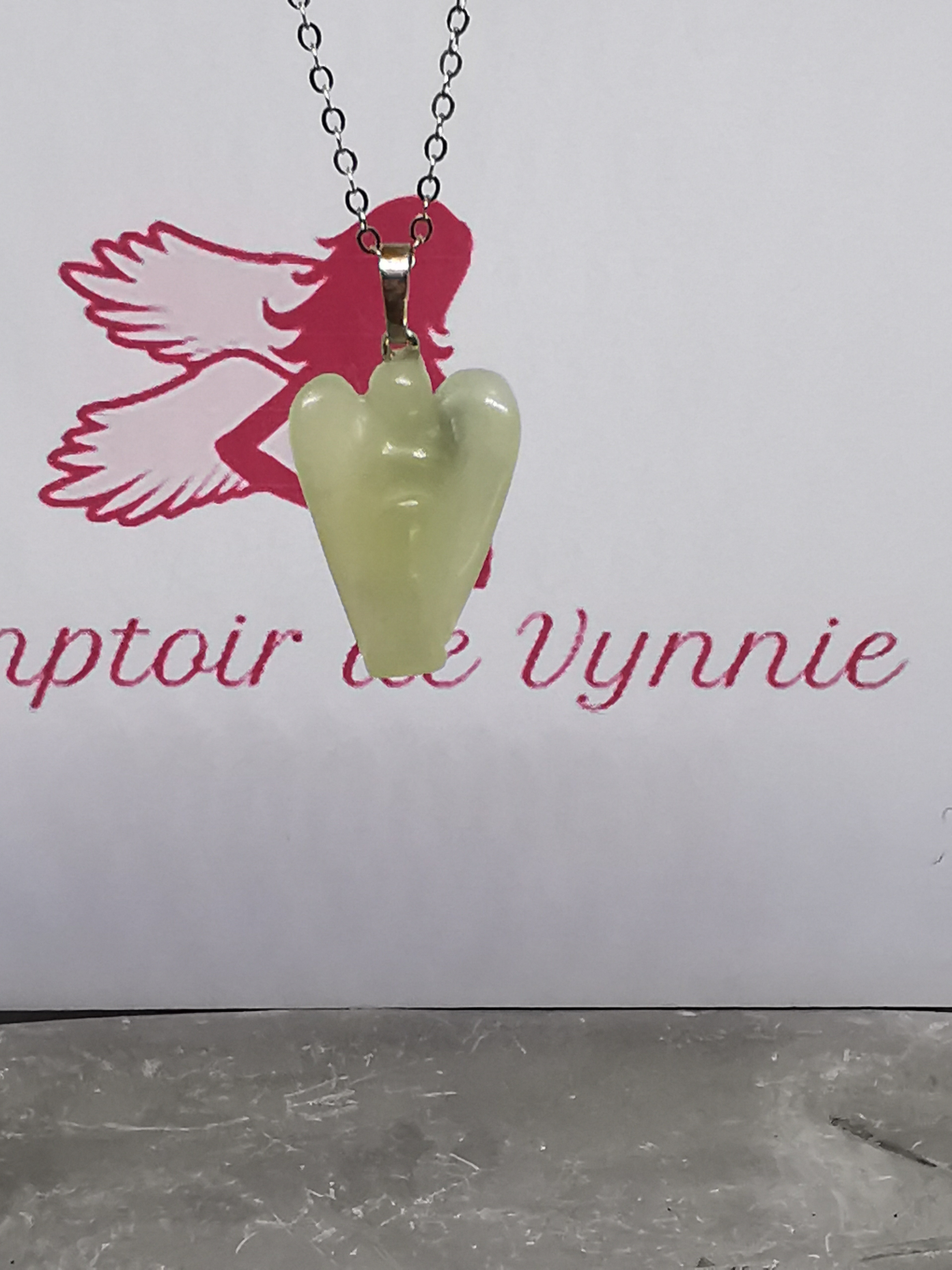 Ce collier délicat met en valeur un pendentif en aventurine sculpté en forme d’ange, symbole universel de protection et de bienveillance.