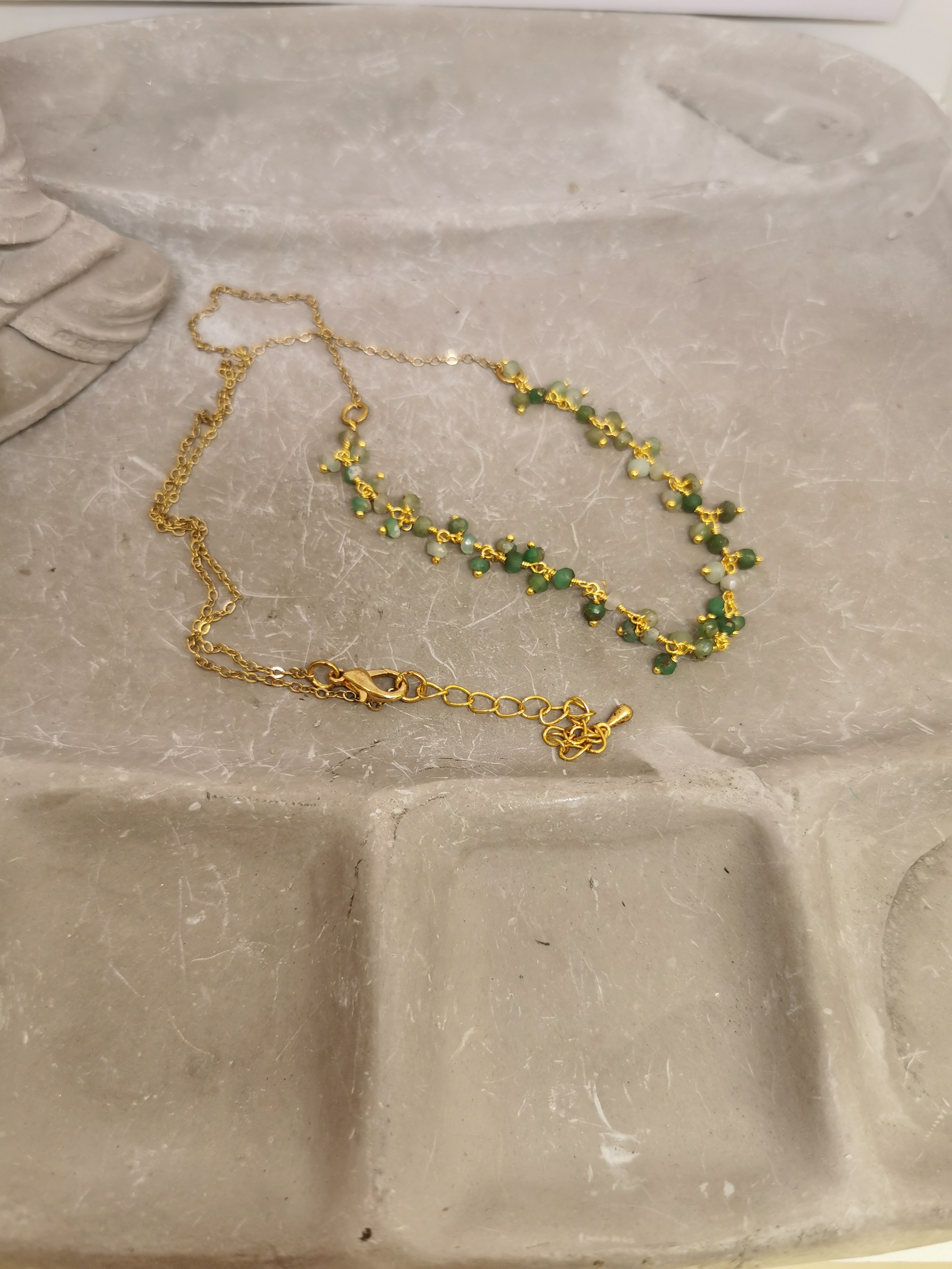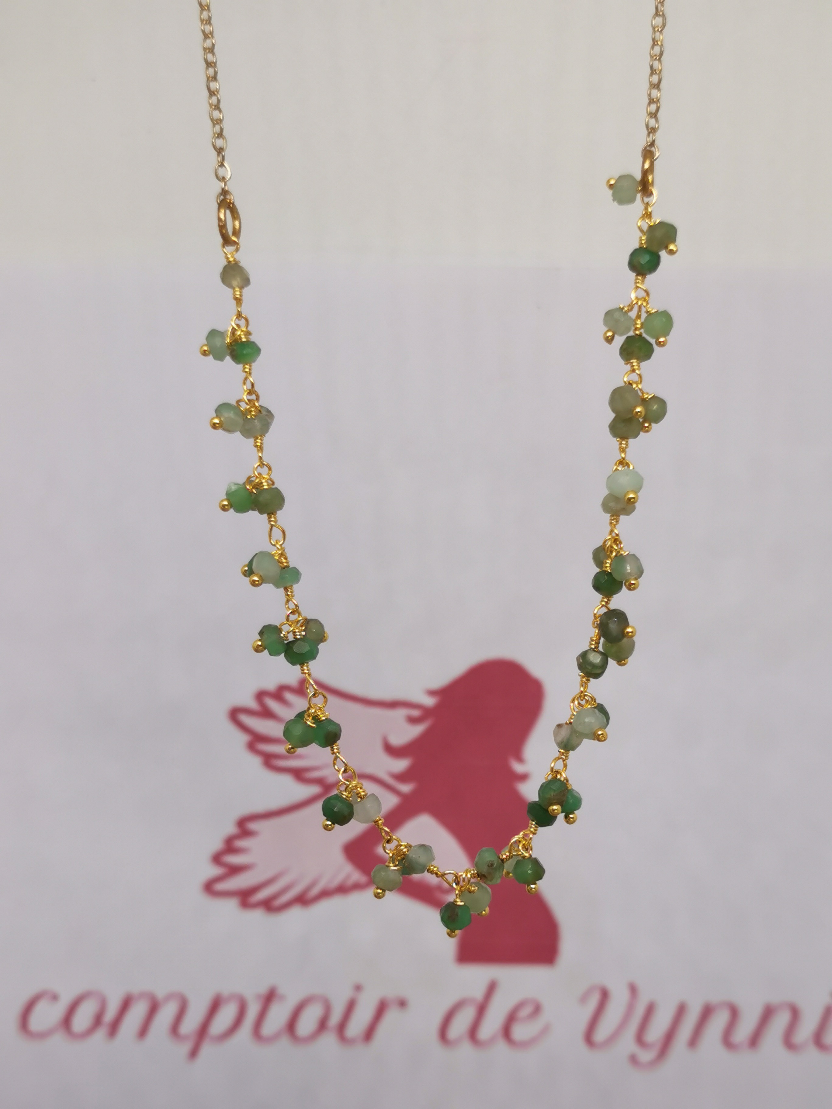 Ce collier raffiné est composé de délicates chips d’aventurine verte, finement montées sur une chaîne en argent vieilli doré réglable.