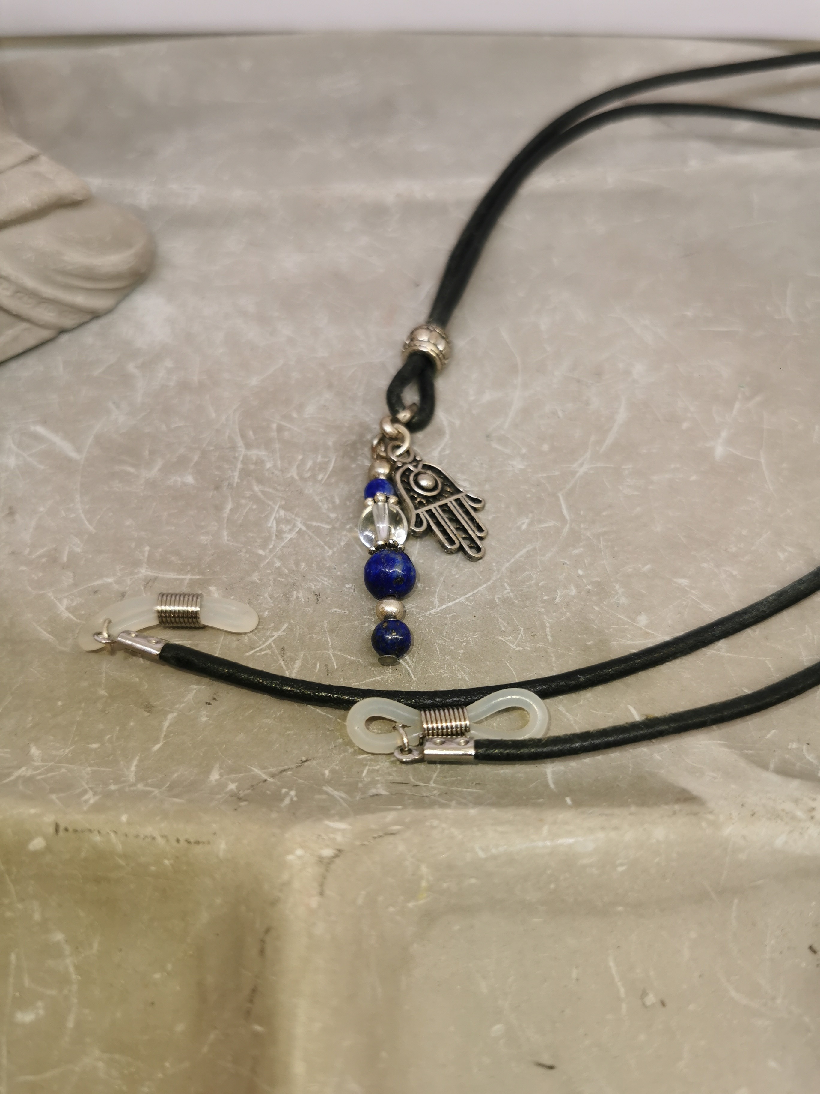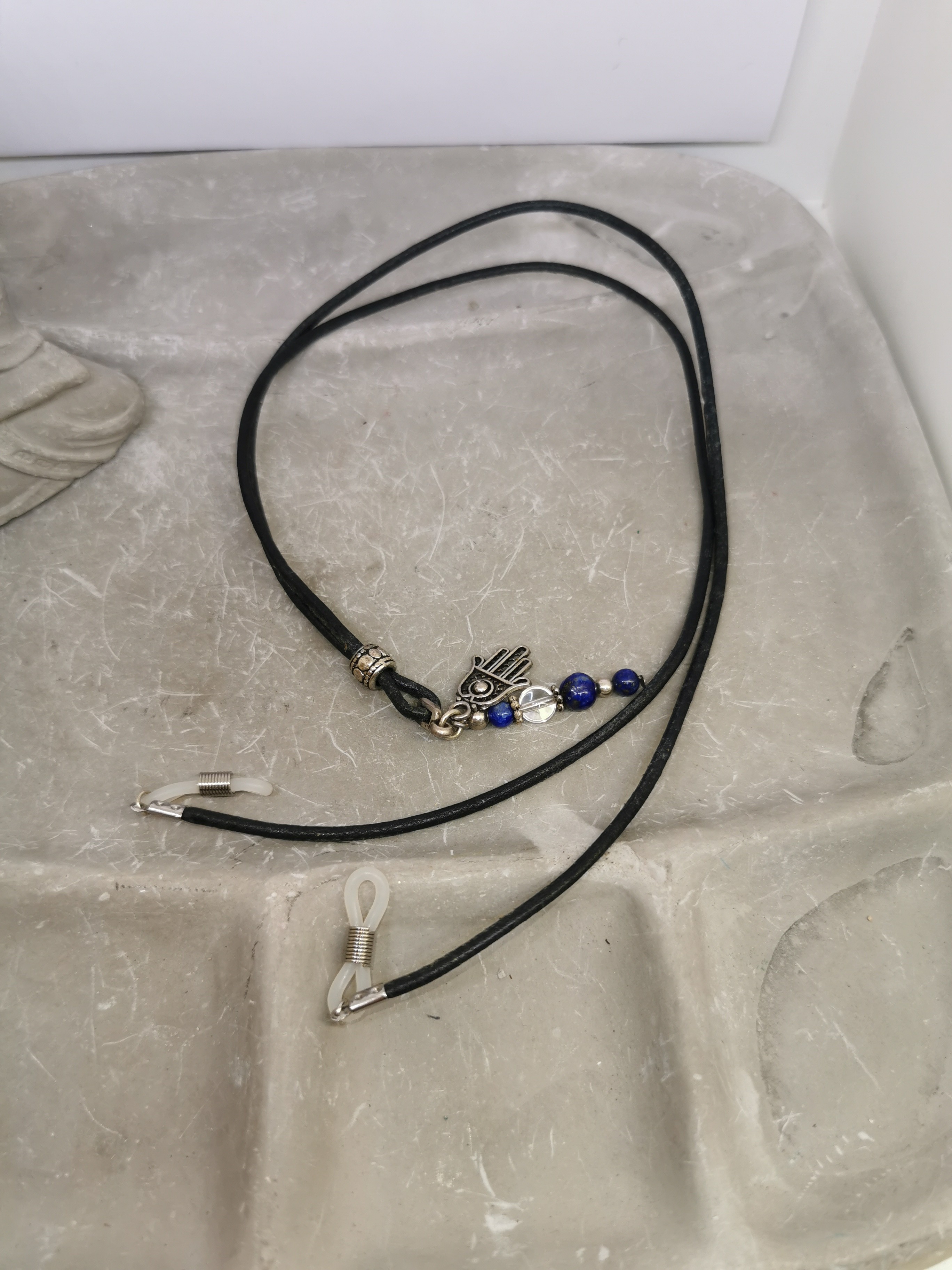 Ce cordon pour lunettes allie élégance, utilité et symbolique protectrice. Monté sur un cordon en cuir tressé noir, il est conçu pour maintenir vos lunettes tout en apportant une touche spirituelle et raffinée.