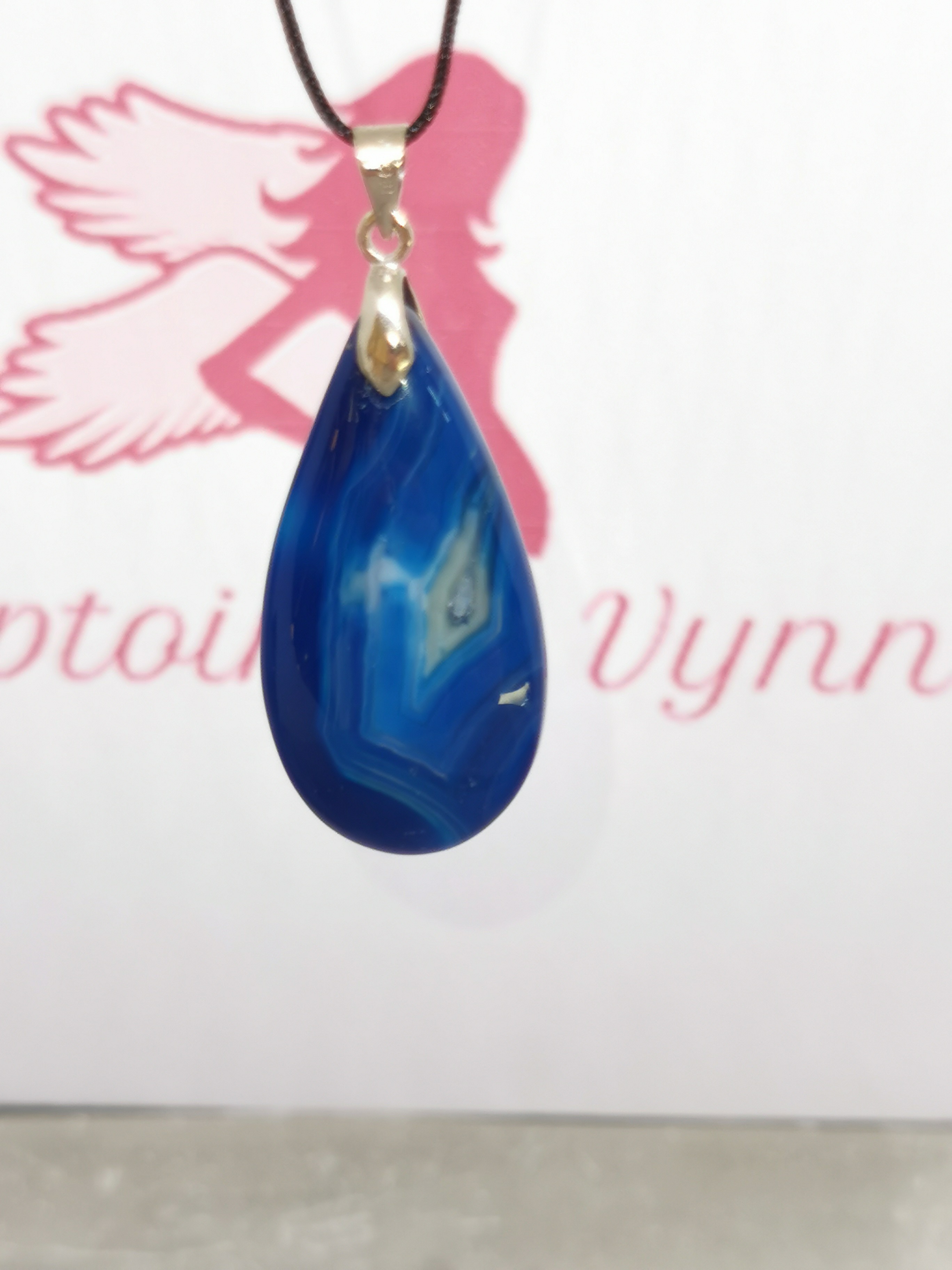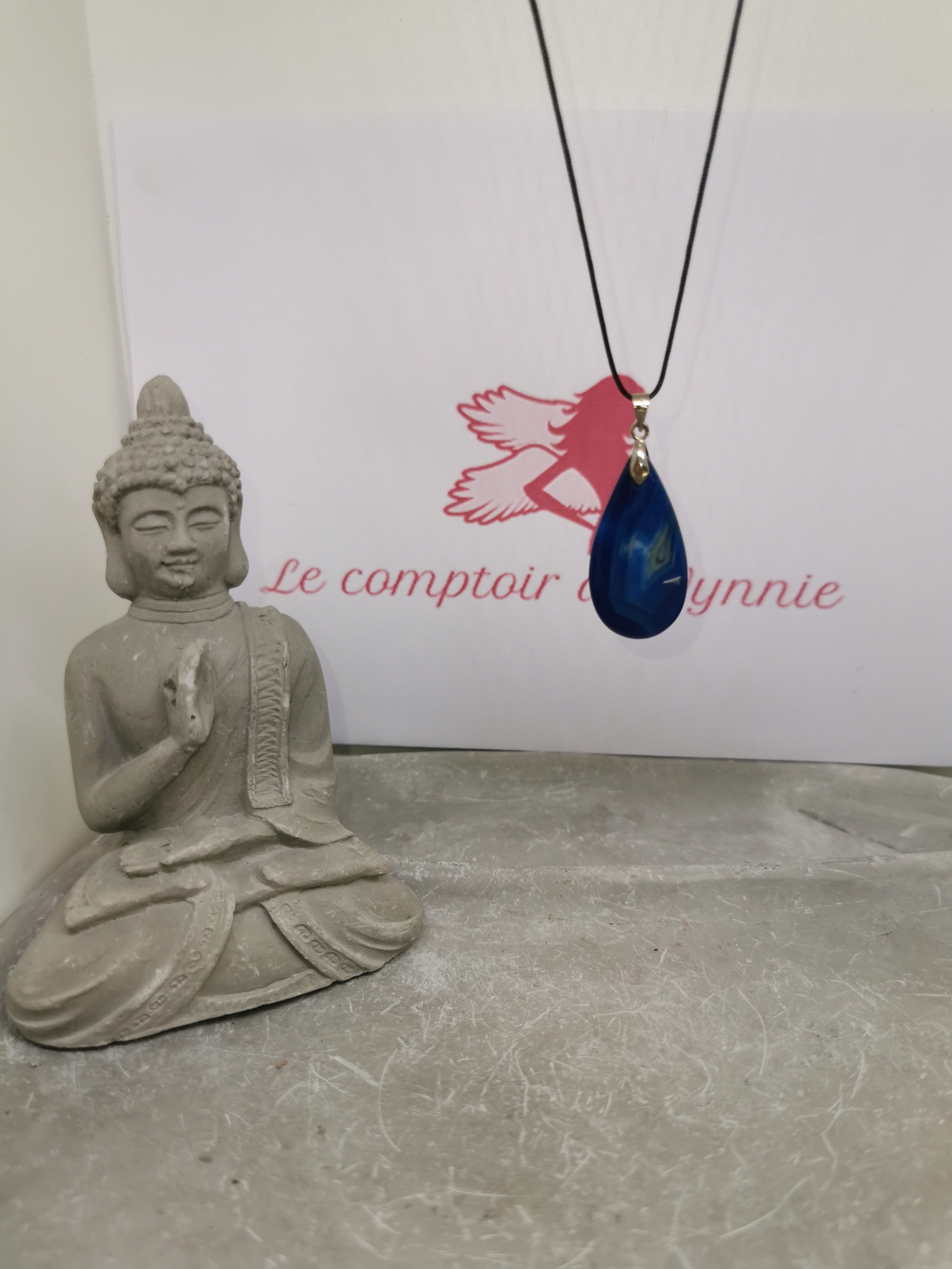 Ce collier met en lumière une pierre d’agate teintée d’un bleu profond, taillée en forme de goutte pour un rendu à la fois élégant et apaisant.
