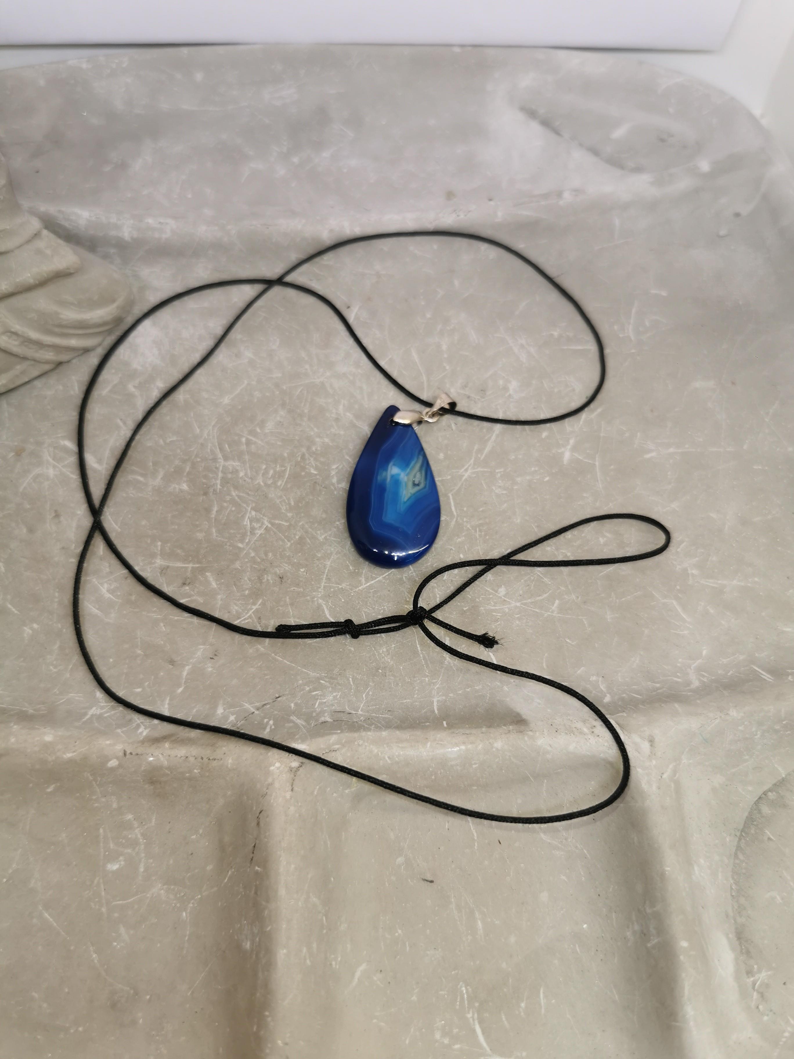 Monté sur un cordon noir réglable, il s’adapte facilement à toutes les morphologies et styles. Sa teinte bleue intense, traversée de nuances plus claires, attire le regard tout en diffusant une sensation de calme et de sérénité.