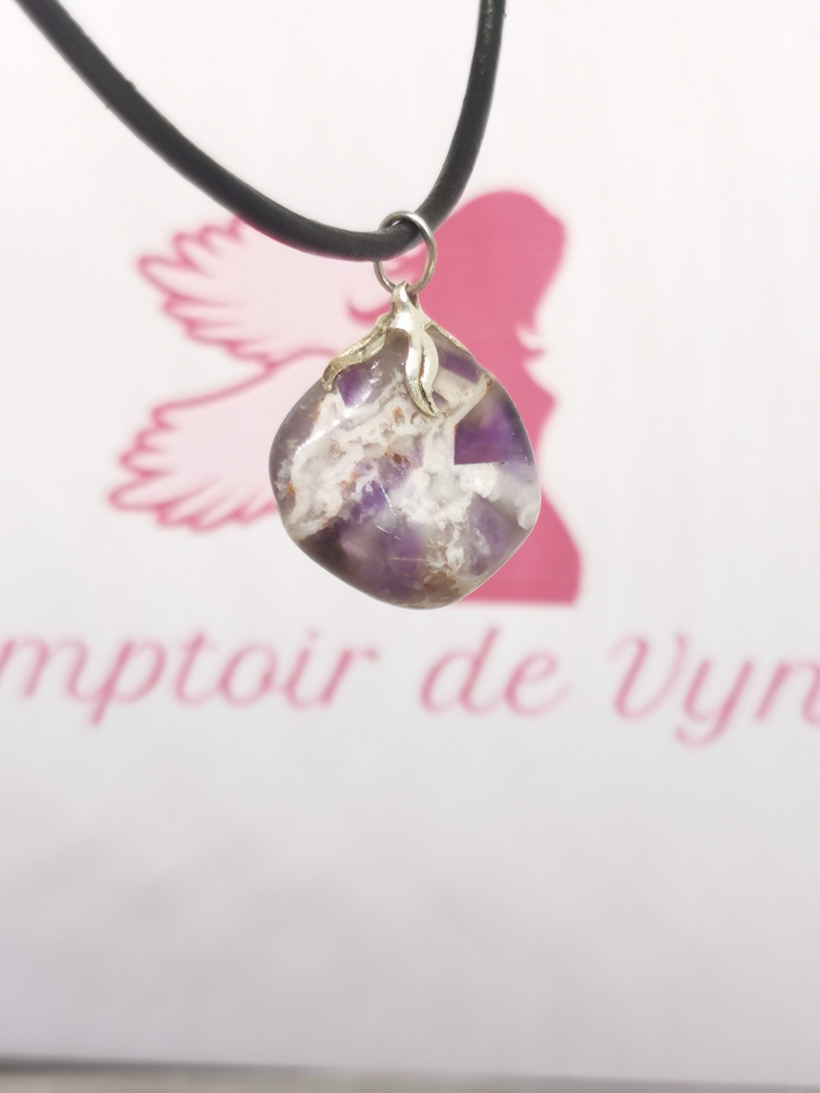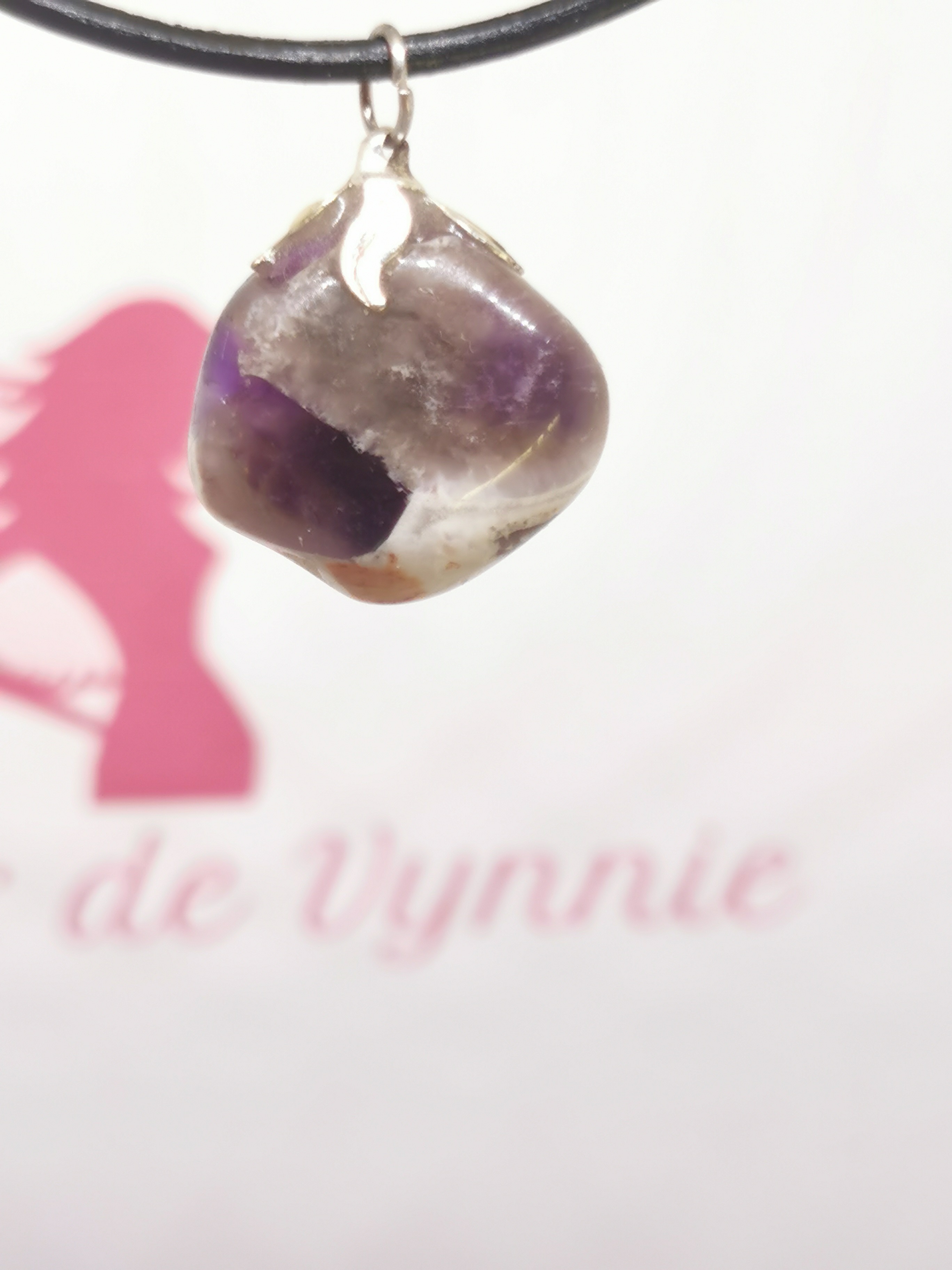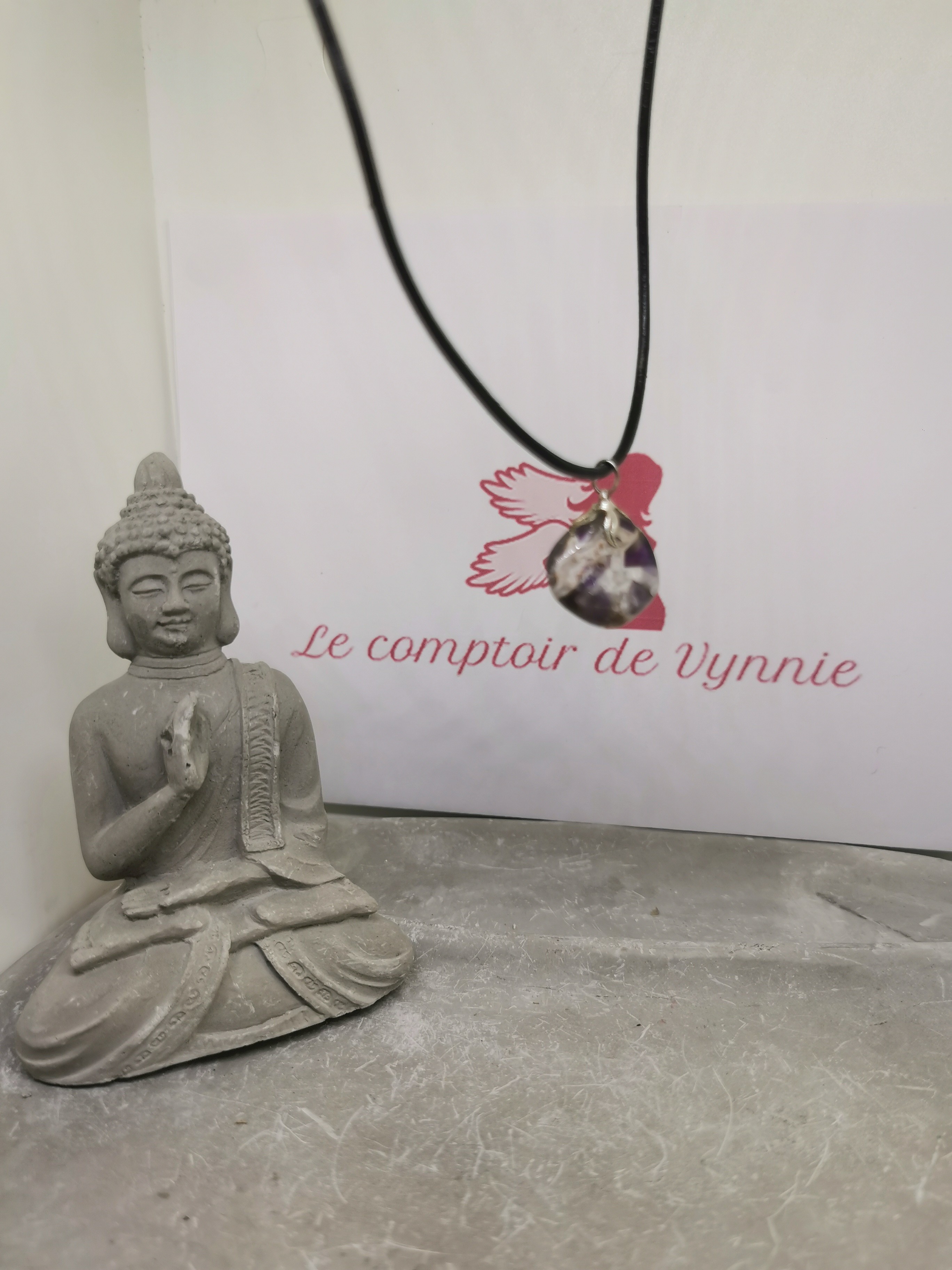 Ce collier met en valeur une améthyste naturelle polie, à la forme libre et organique, révélant toute la beauté brute de la pierre.