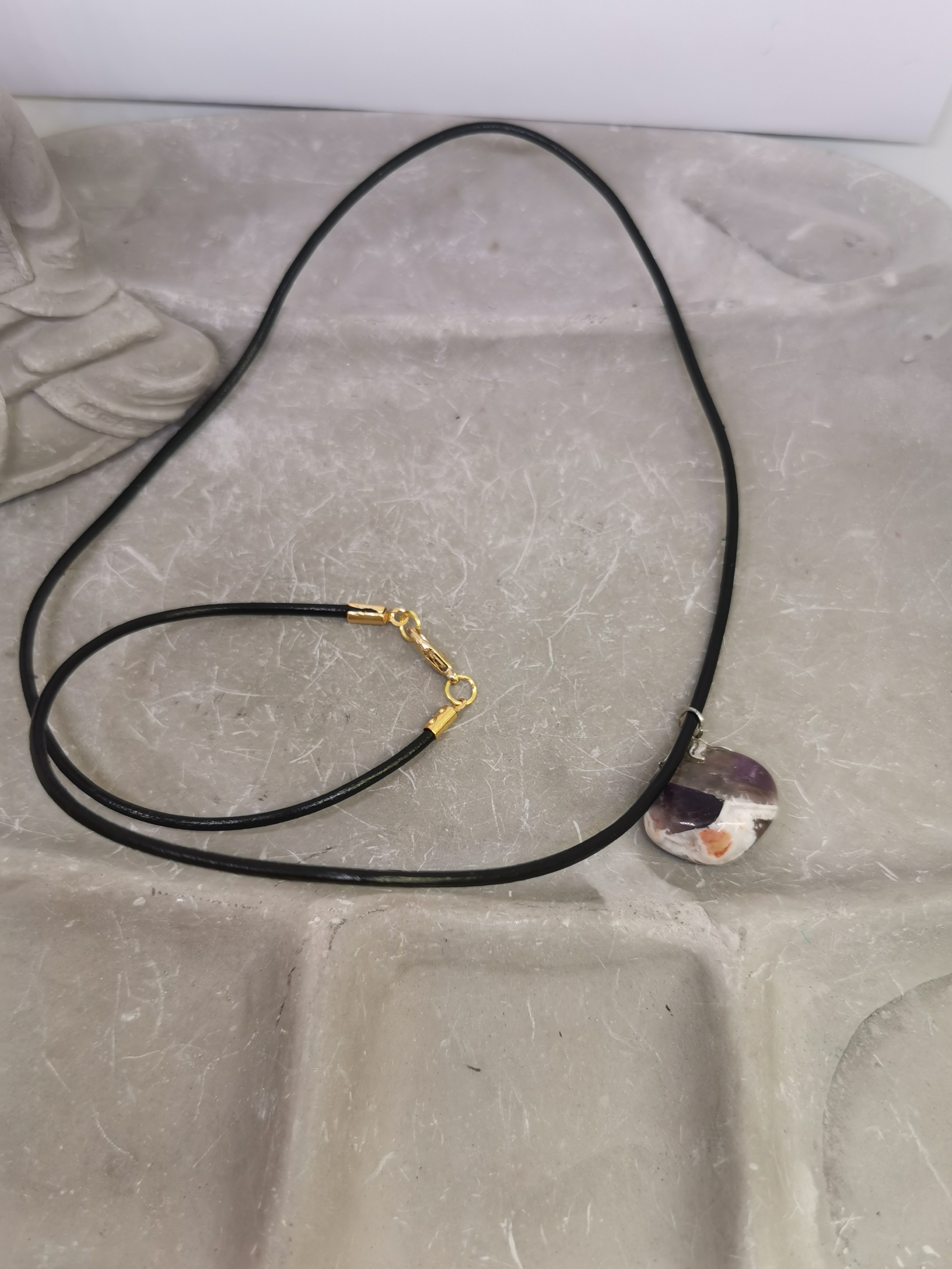 Le pendentif est monté sur un cordon en cuir noir tressé non réglable, apportant une touche sobre et élégante qui met parfaitement en valeur la pierre.