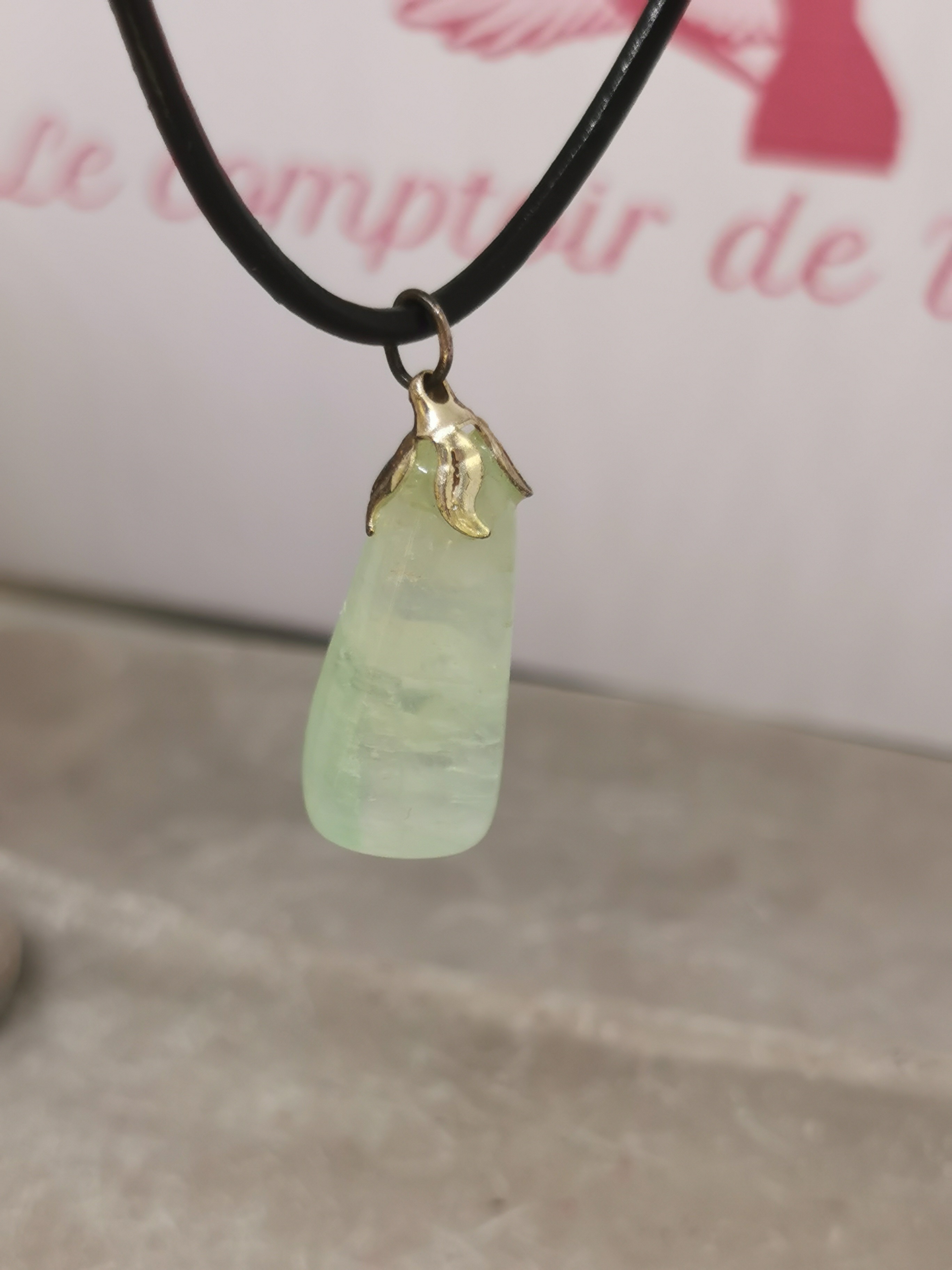 Ce collier élégant met en lumière une fluorine polie aux nuances vertes translucides, délicatement montée en pendentif.