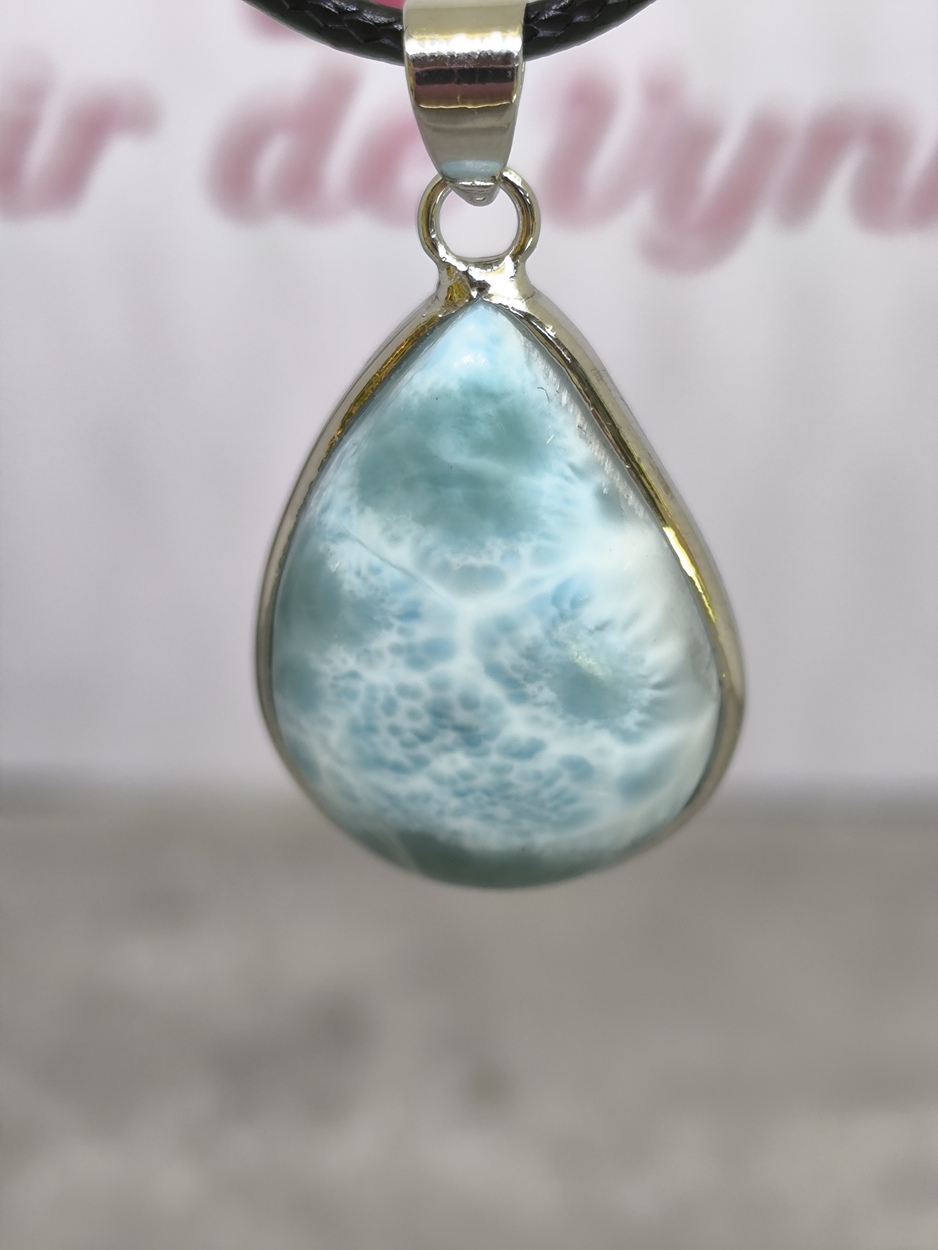 Laissez-vous séduire par la douceur et l’énergie apaisante de ce pendentif en larimar naturel, une pierre rare aux nuances bleu ciel évoquant les eaux cristallines des Caraïbes.