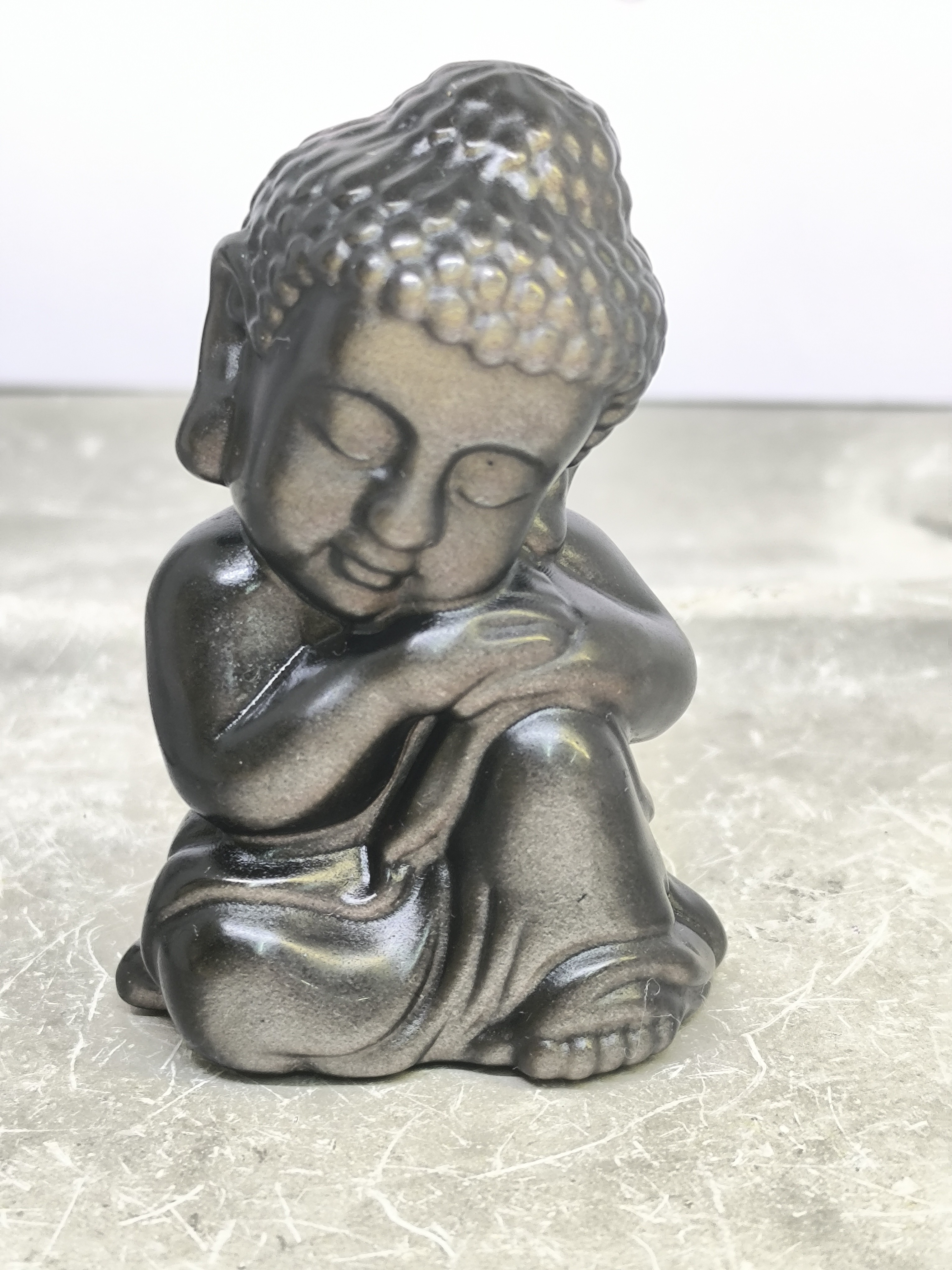 Représenté dans une posture de calme et de méditation, ce Bouddha dégage une énergie douce et apaisante. Les reflets subtils argentés de l’obsidienne apportent profondeur et élégance à cette pièce unique.