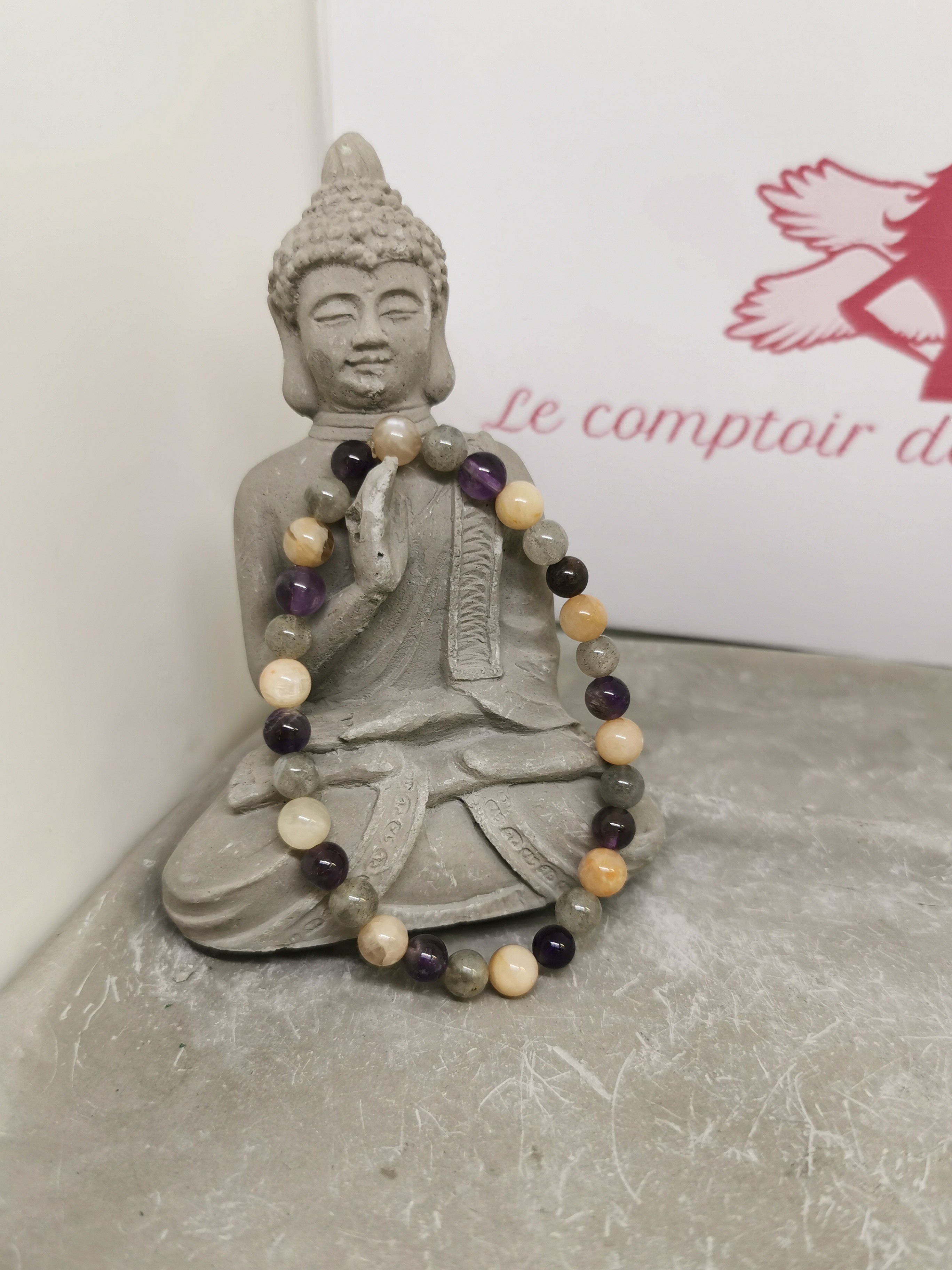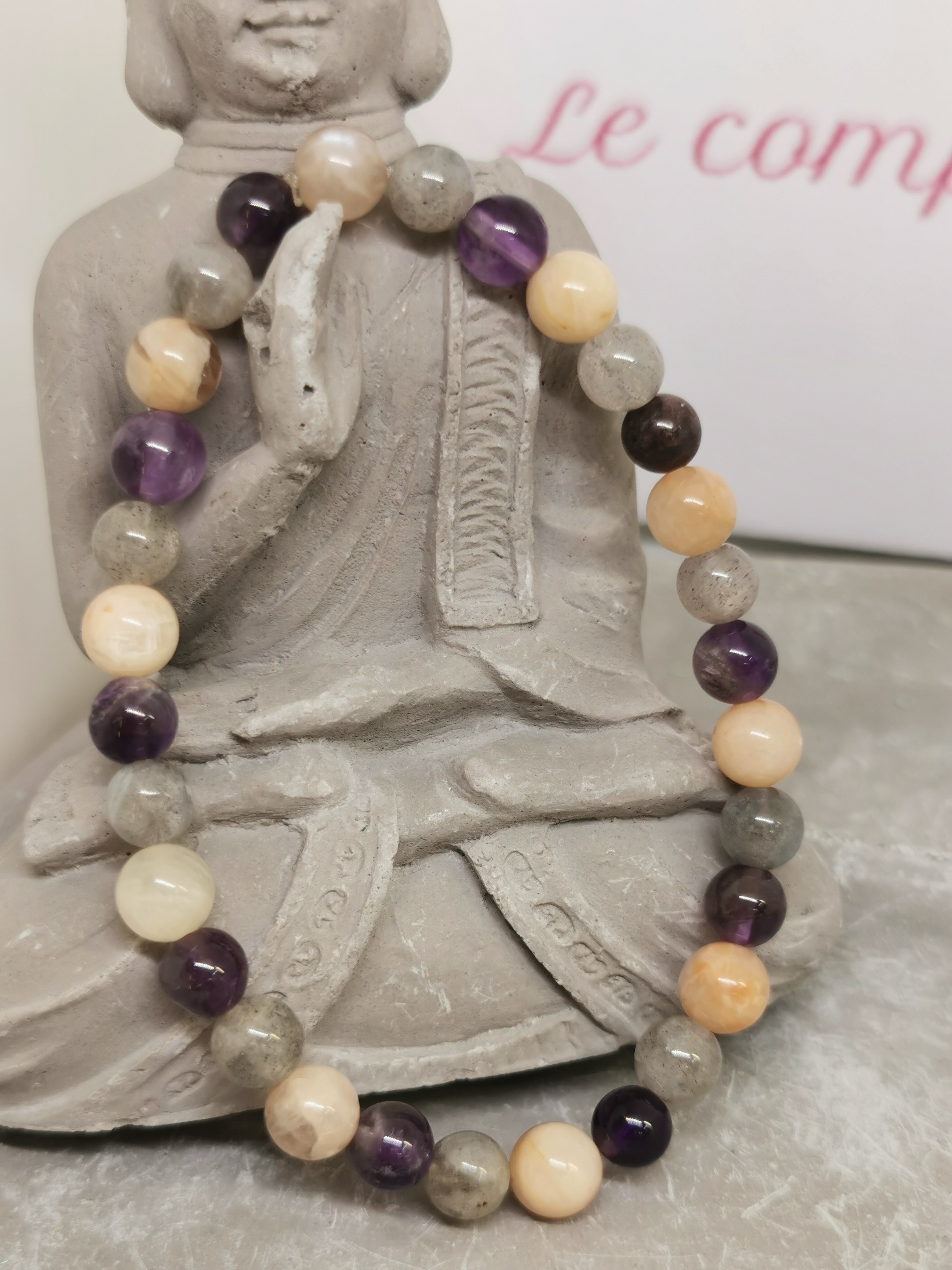 Il est composé de perles naturelles de 6 mm en pierre de lune rose, améthyste et labradorite, montées sur un élastique résistant, garantissant confort et facilité d’utilisation.