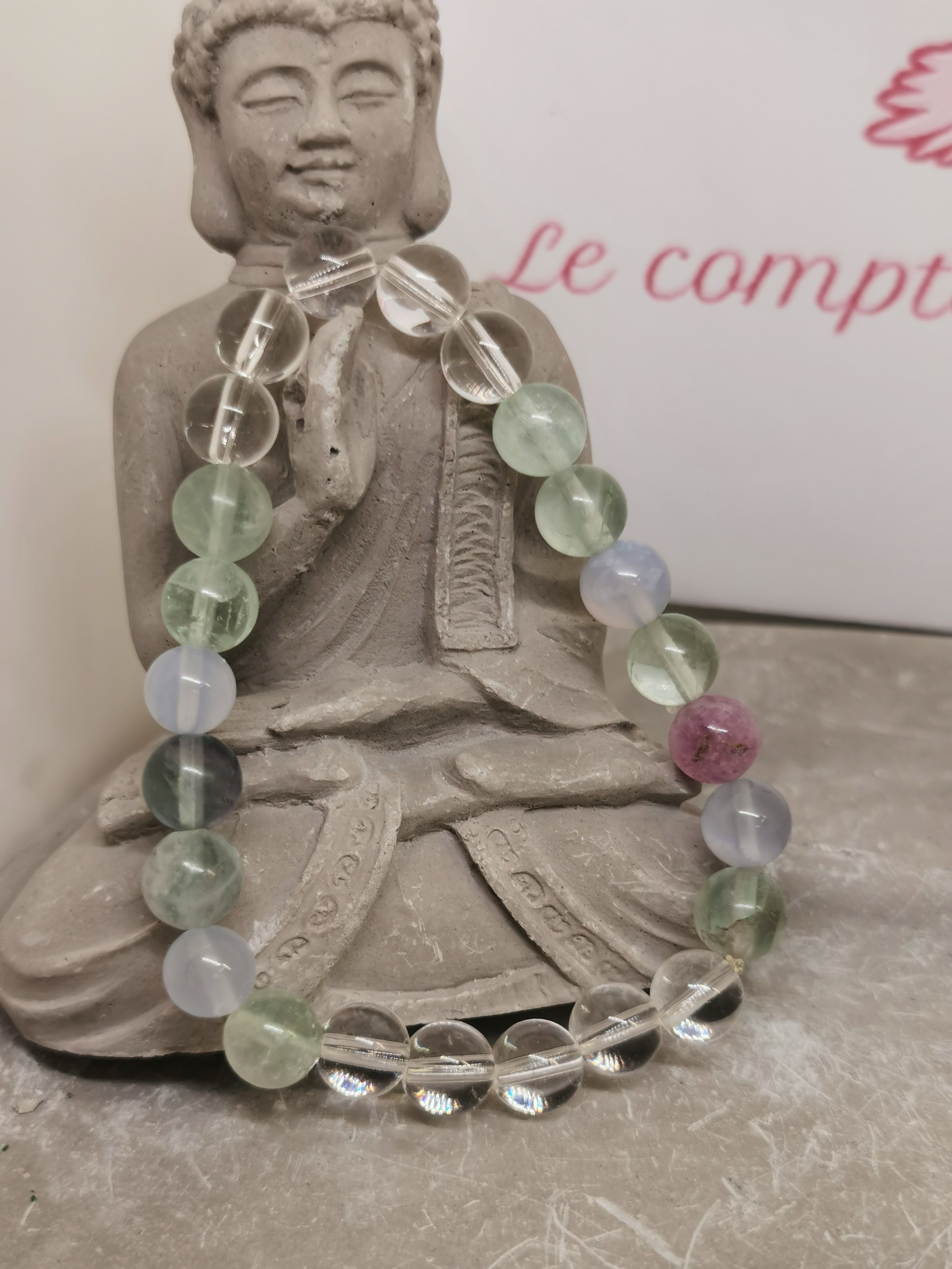 Il est composé de perles naturelles de 8 mm en cristal de roche, fluorite (fluorine) et calcédoine bleue, montées sur un élastique résistant, garantissant confort et durabilité.