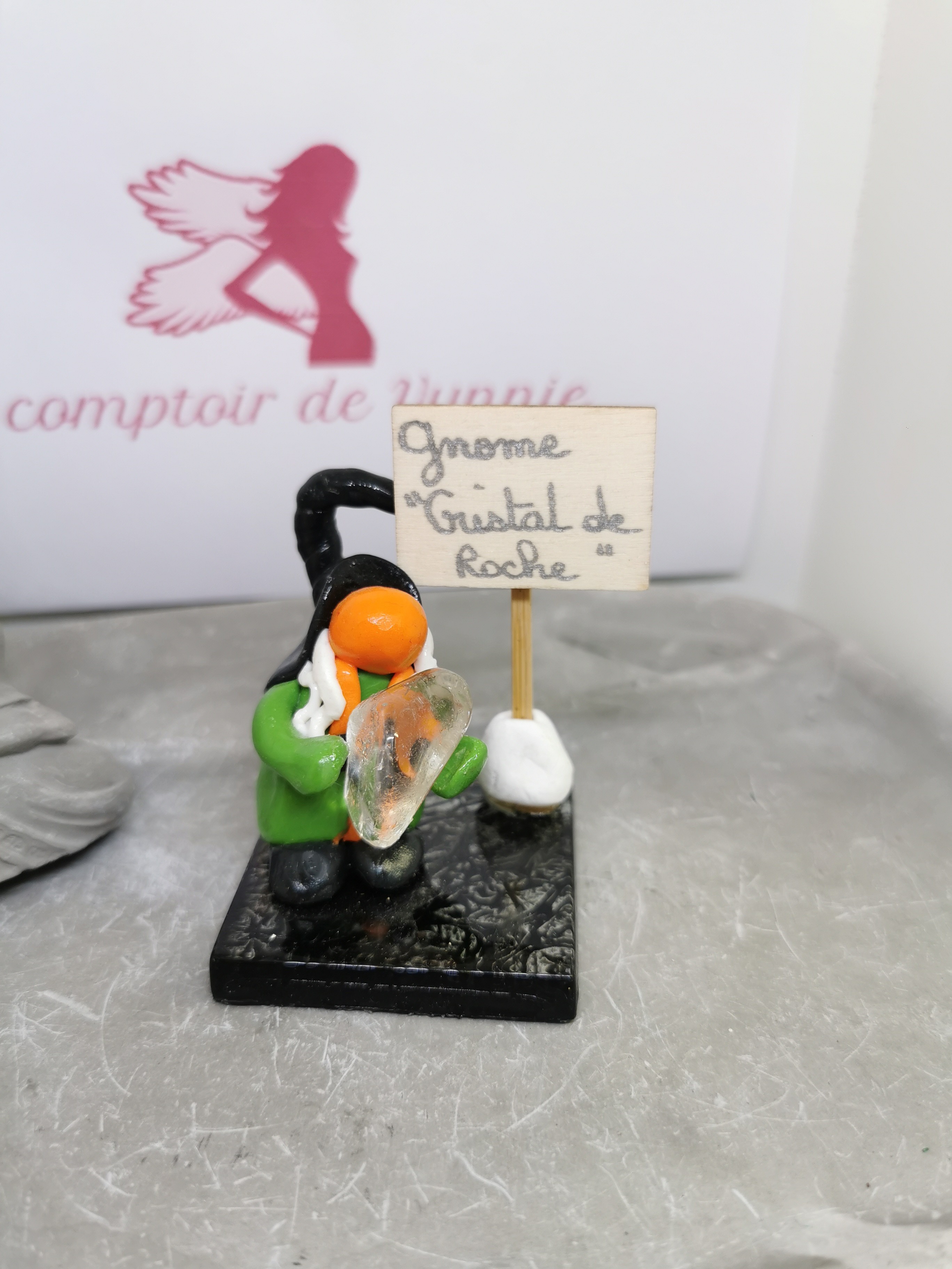 Ce petit personnage attachant tient délicatement un cristal de roche, symbole de pureté et de lumière. Avec ses couleurs vives et son design original, il apporte une touche à la fois magique, protectrice et décorative à votre intérieur.