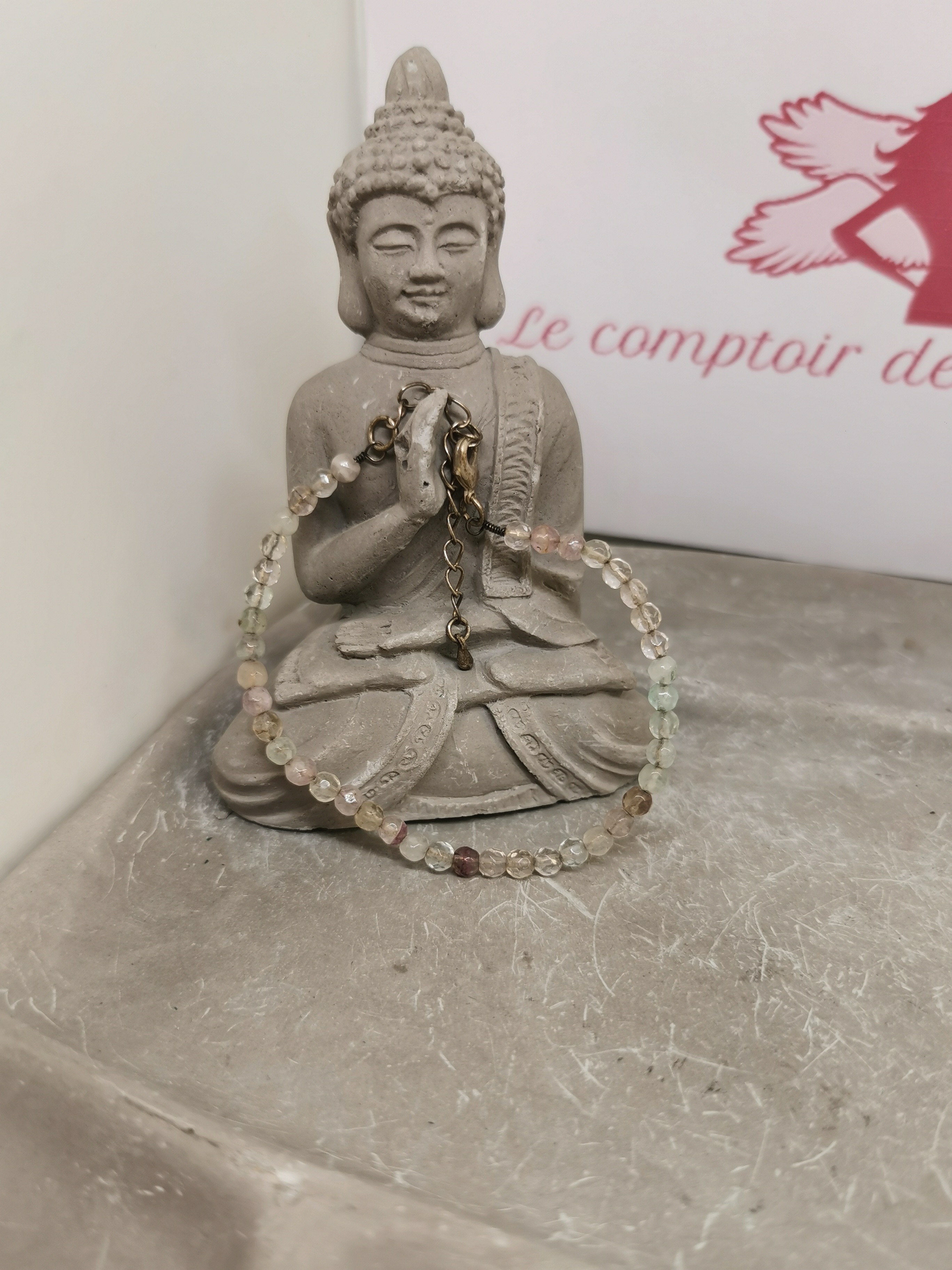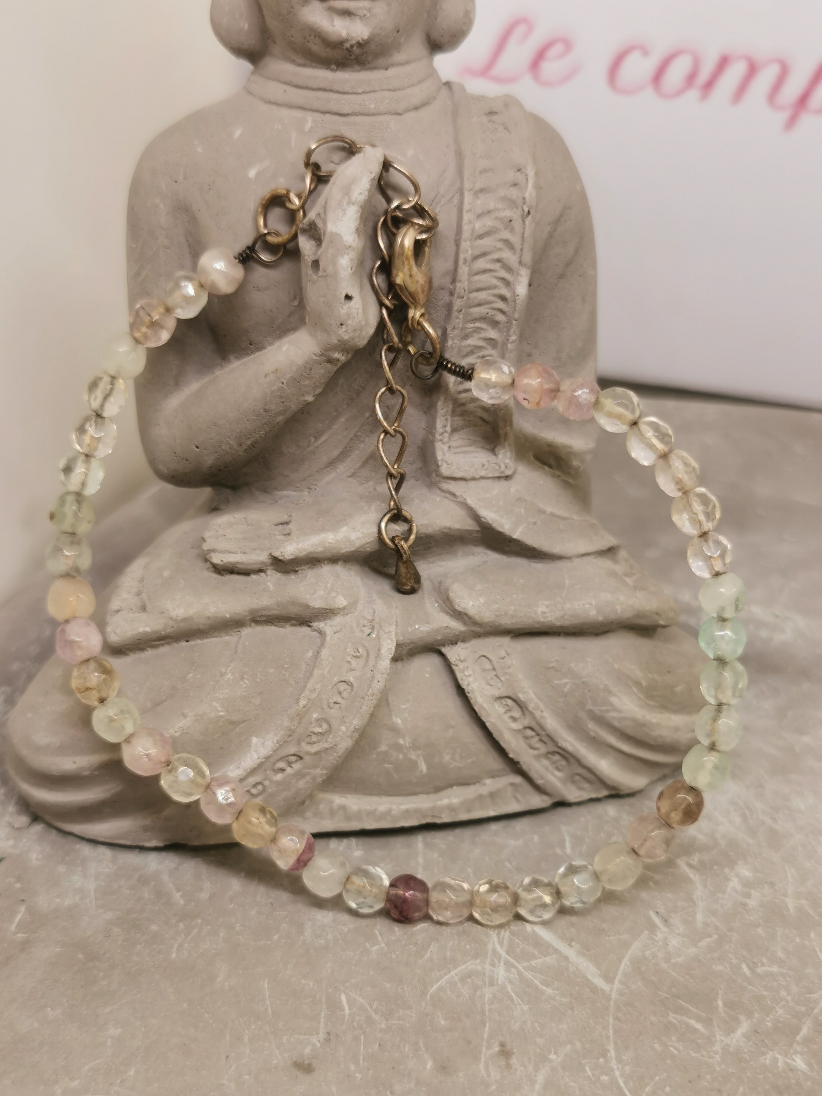 Ce bracelet en fluorine naturelle séduit par sa finesse et ses nuances délicates allant du vert au violet en passant par des tons translucides et lumineux. Les perles facettées de 4 mm captent subtilement la lumière, offrant un rendu élégant et raffiné.