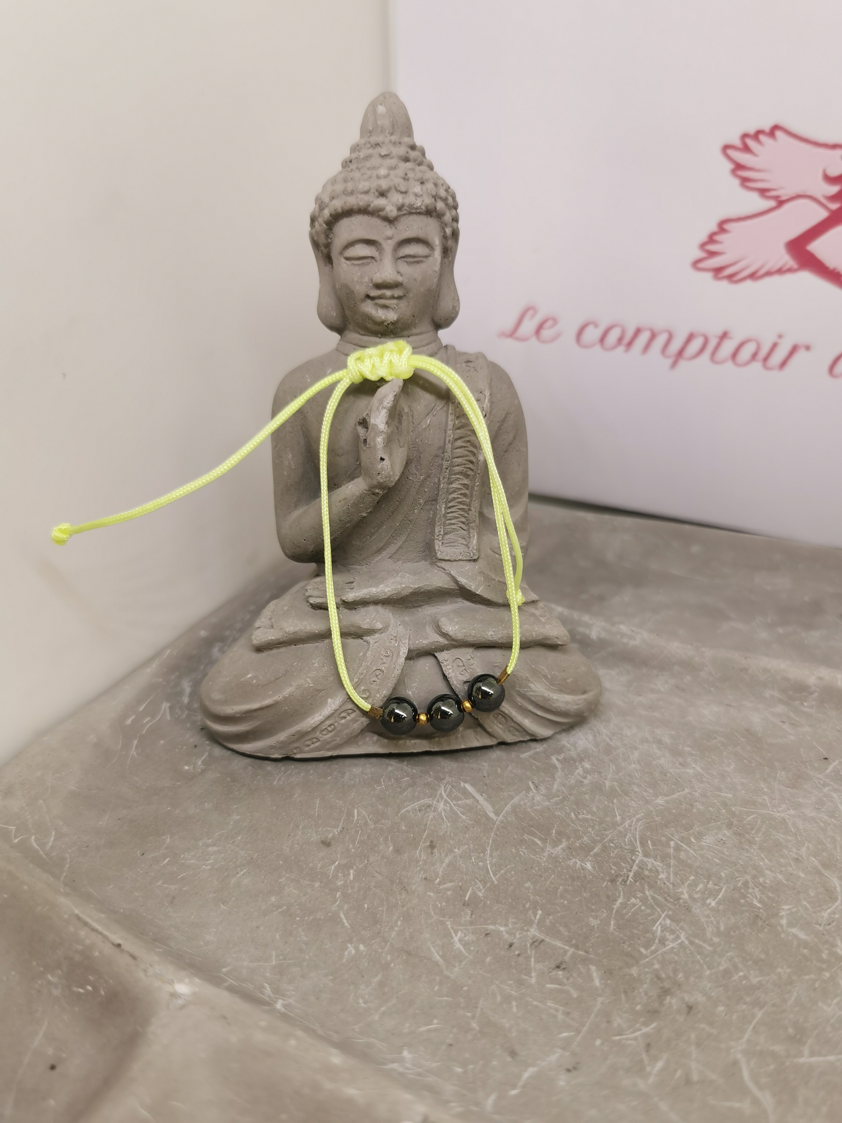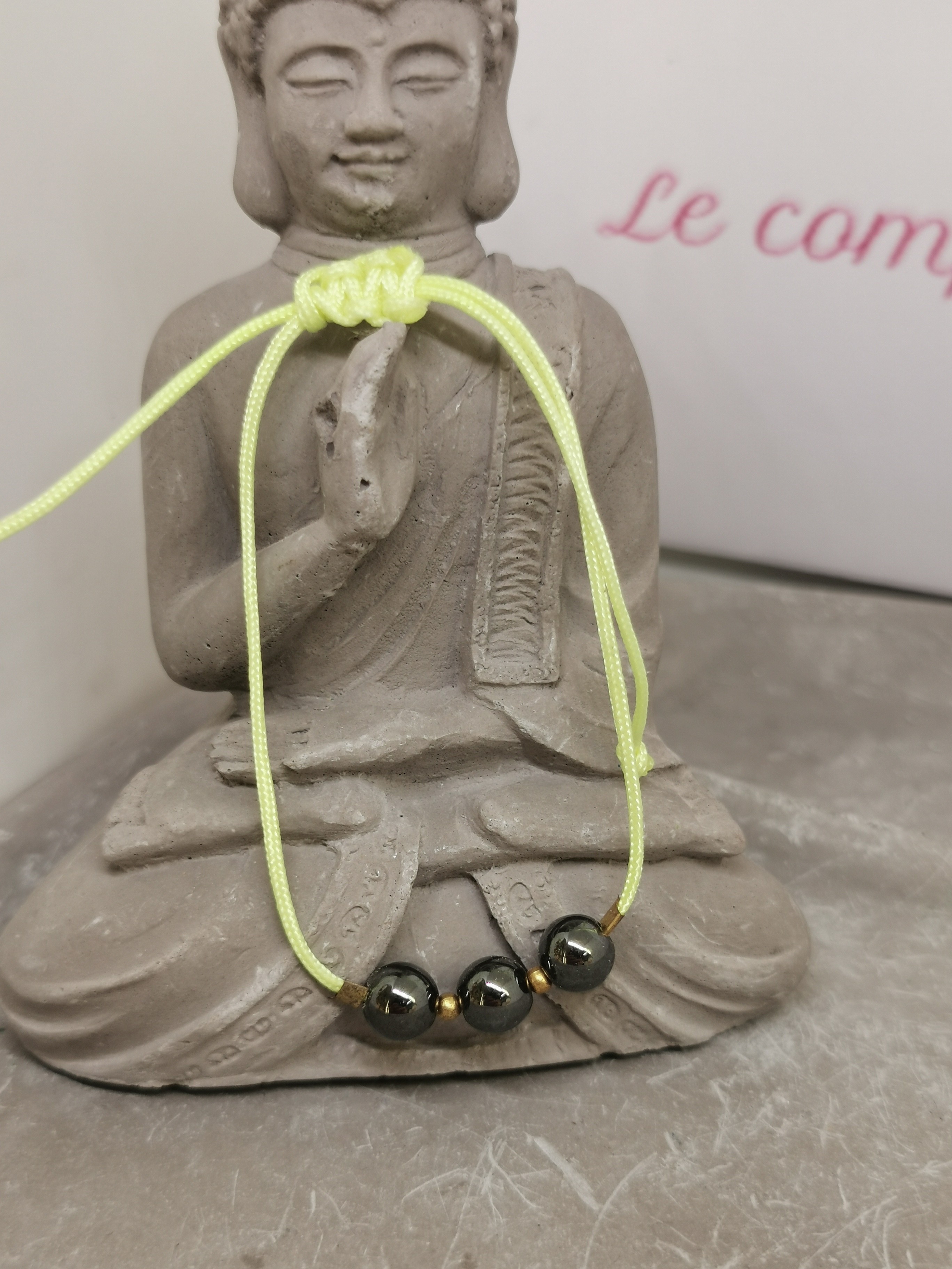 Ce bracelet en hématite au design moderne et audacieux associe l’élégance des pierres naturelles à l’énergie dynamique d’un cordon jaune fluo.
