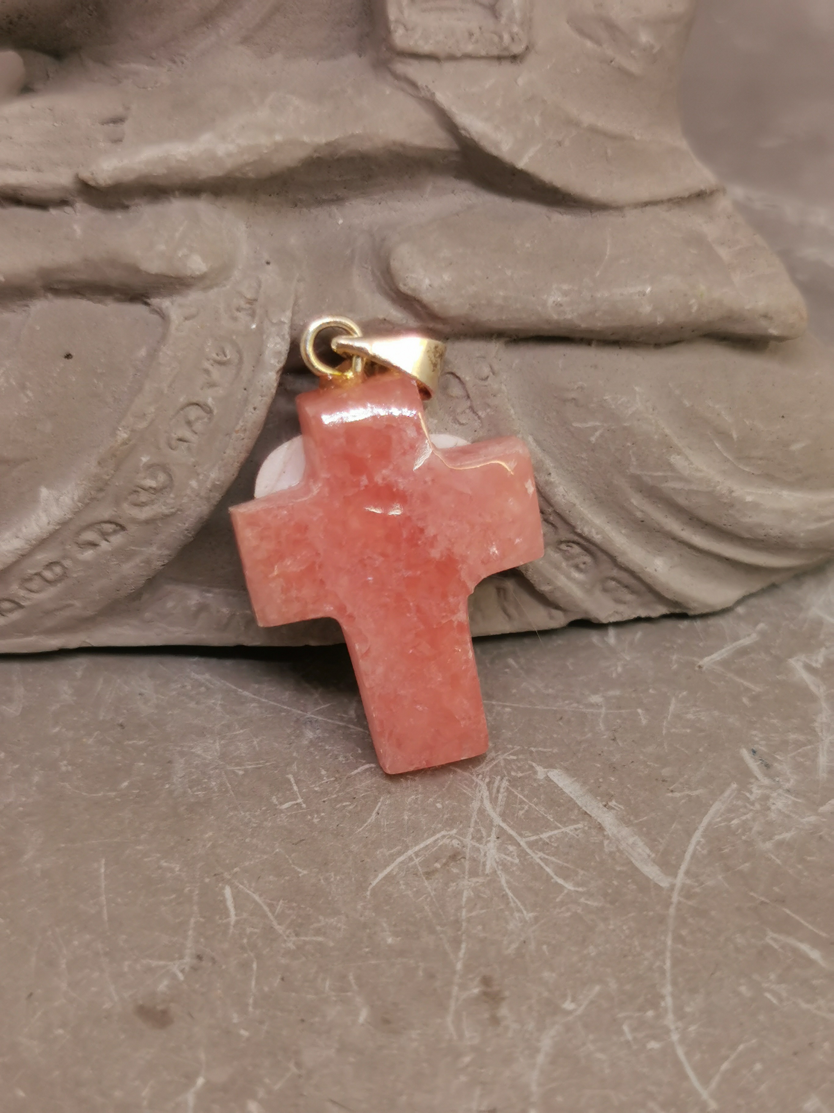 Ce pendentif en forme de croix en rhodochrosite naturelle allie symbolique spirituelle et douceur énergétique. Sa teinte rose chaleureuse, marbrée de nuances délicates, en fait un bijou à la fois élégant et profondément apaisant.