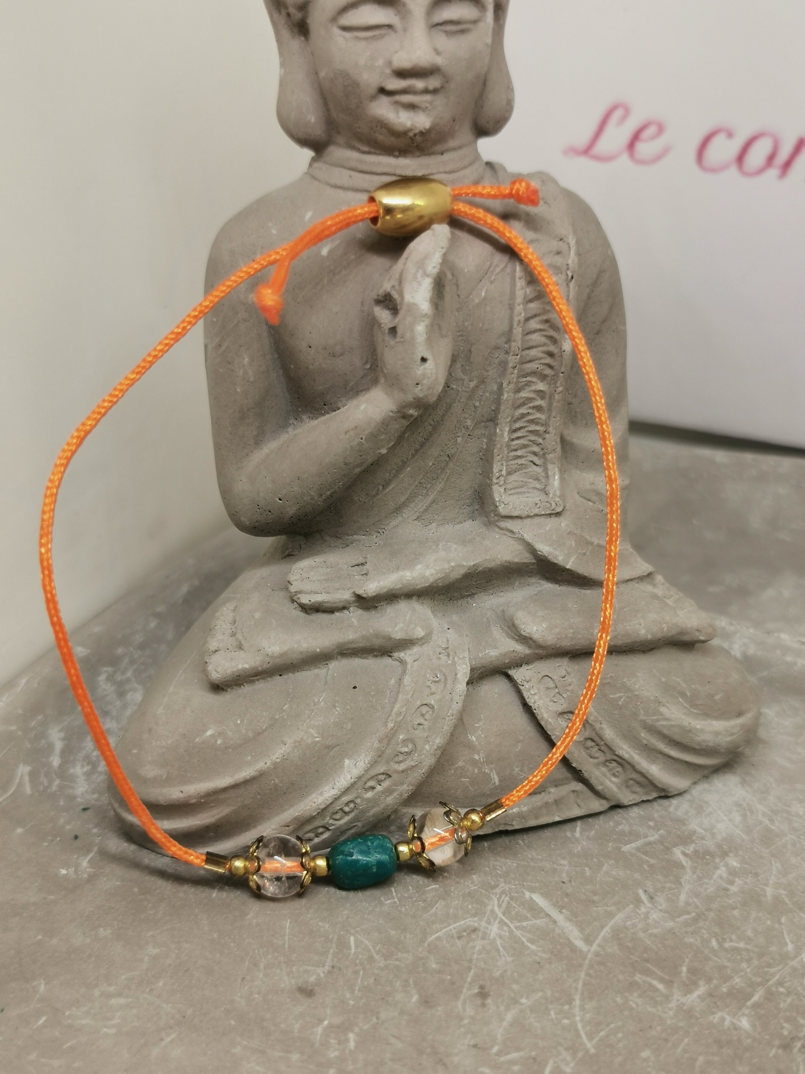 Ce bracelet lumineux associe la douceur de la chrysocolle à la pureté du cristal de roche, monté sur un cordon orange réglable, symbole d’énergie et de vitalité.