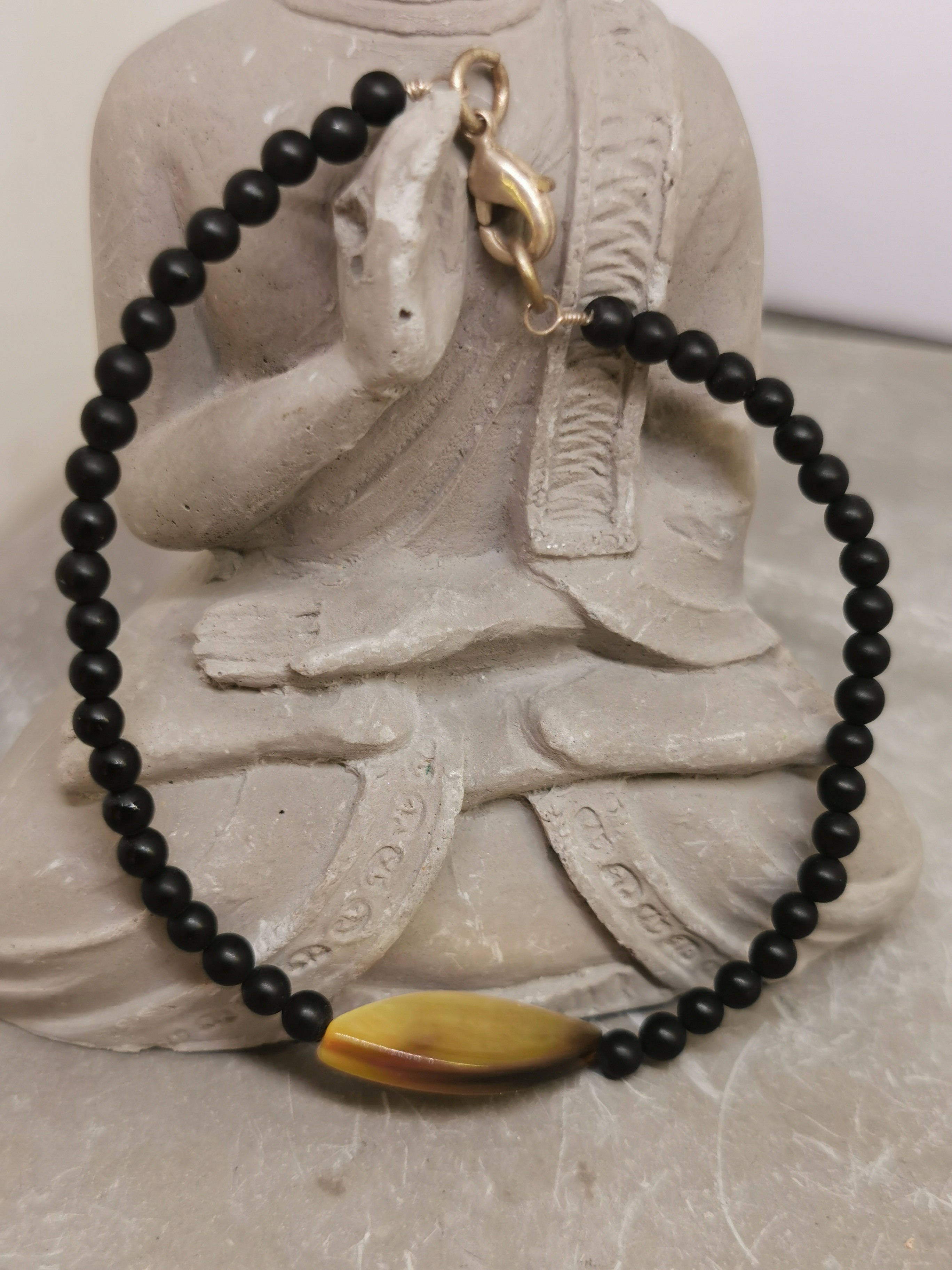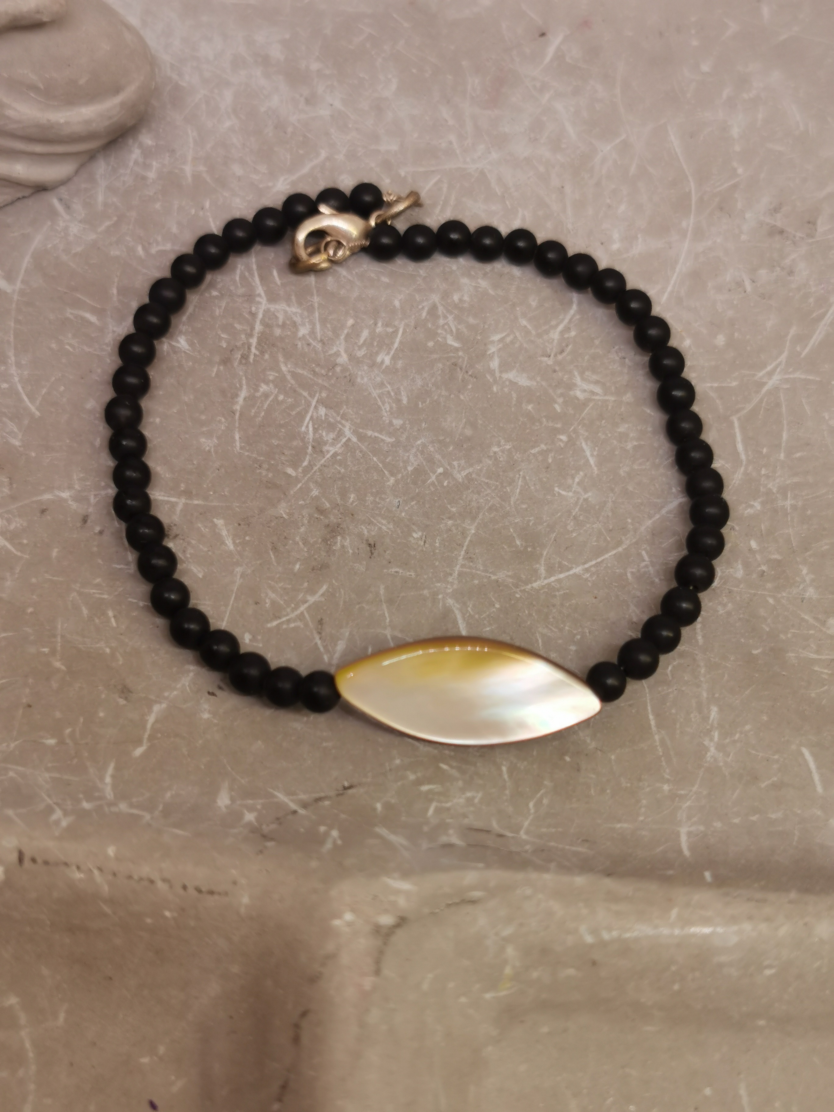 Ce bracelet fin et élégant associe la profondeur protectrice de l’onyx noir à la douceur naturelle de la nacre, créant un bijou à la fois sobre, raffiné et puissant.