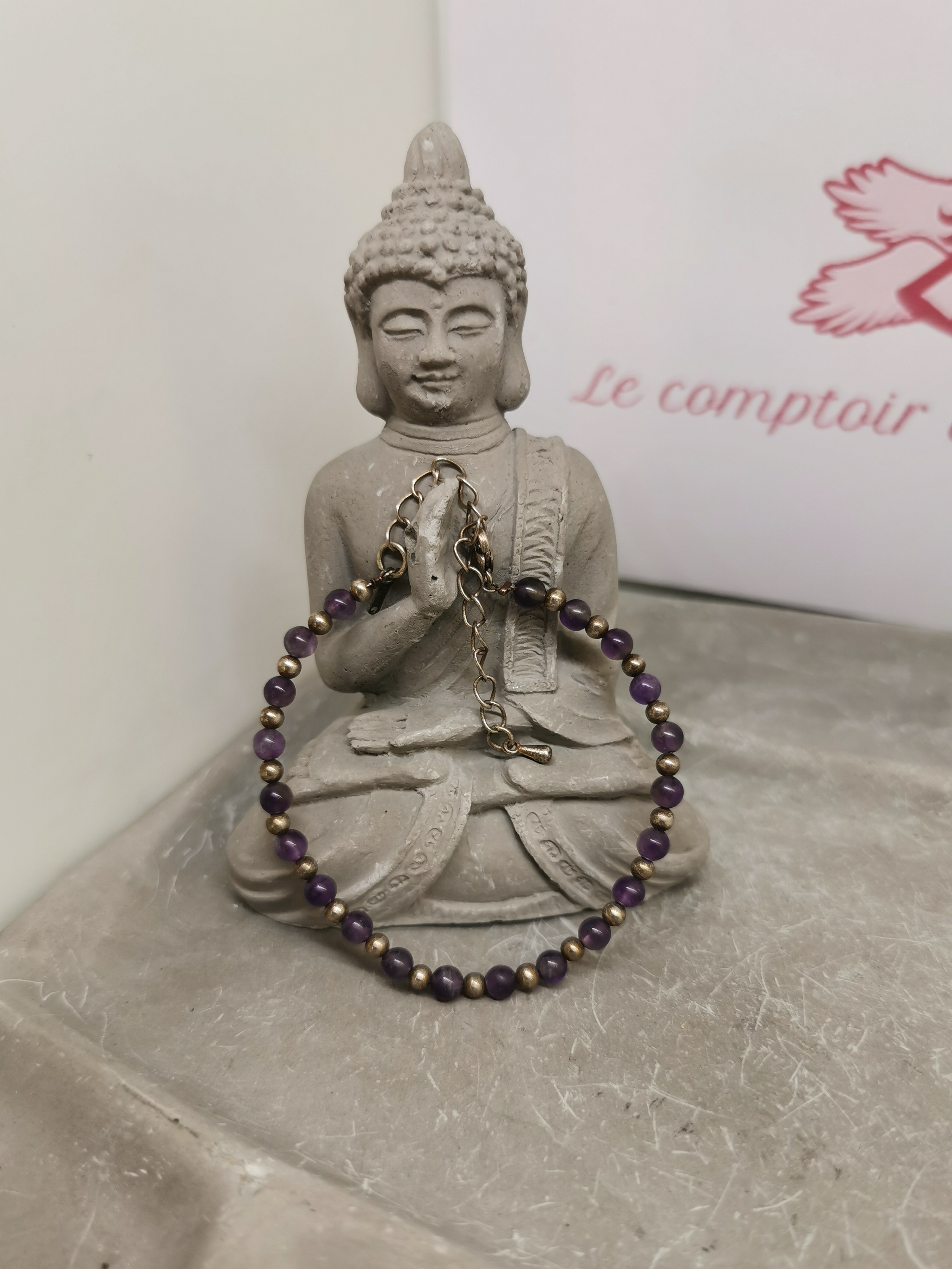Composé de fines perles d’améthyste de 3,8 mm, séparées par de petites perles argentées, il offre un équilibre parfait entre raffinement et énergie. Son montage sur chaîne réglable en argent vieilli permet un ajustement idéal à tous les poignets.