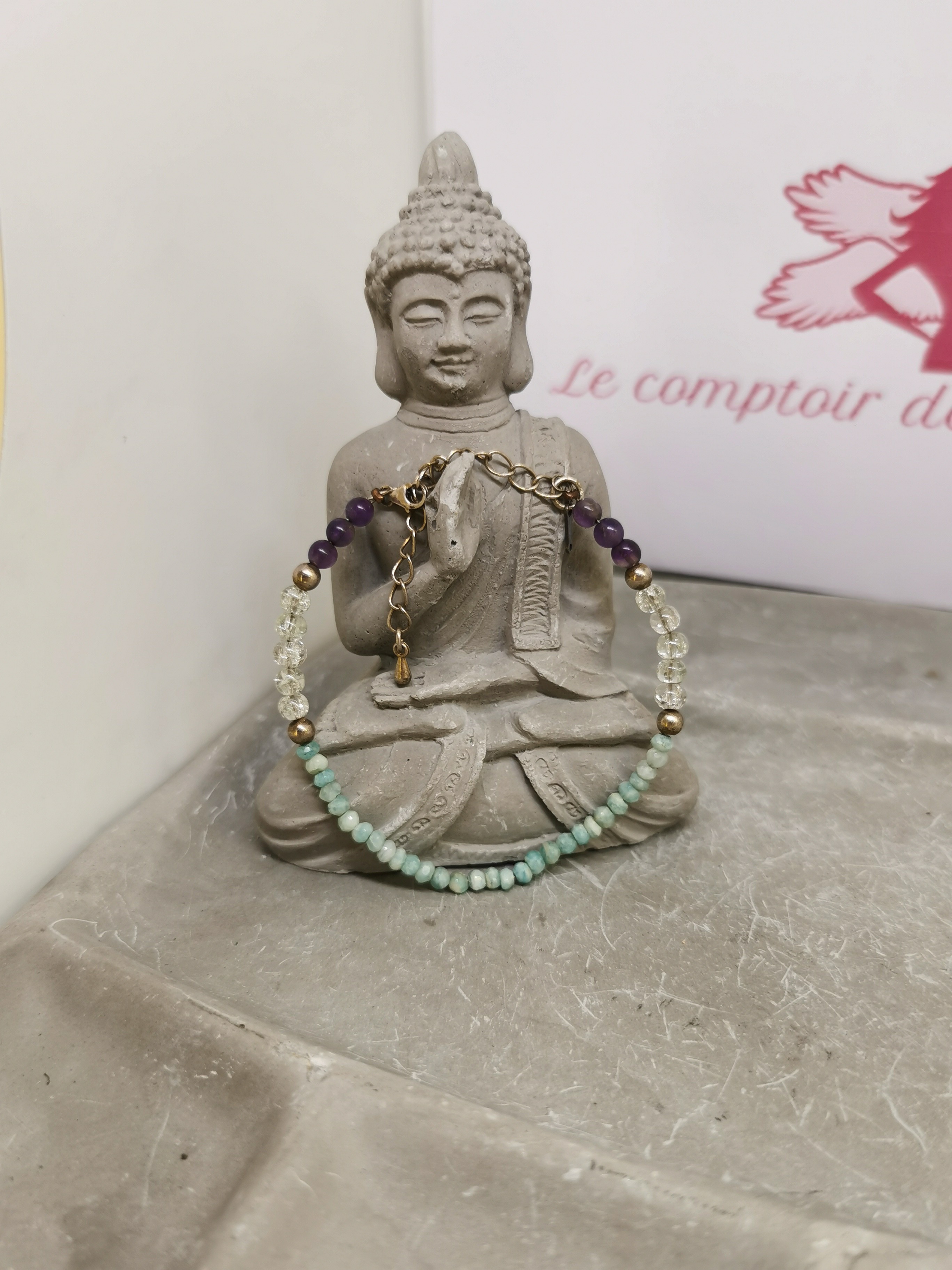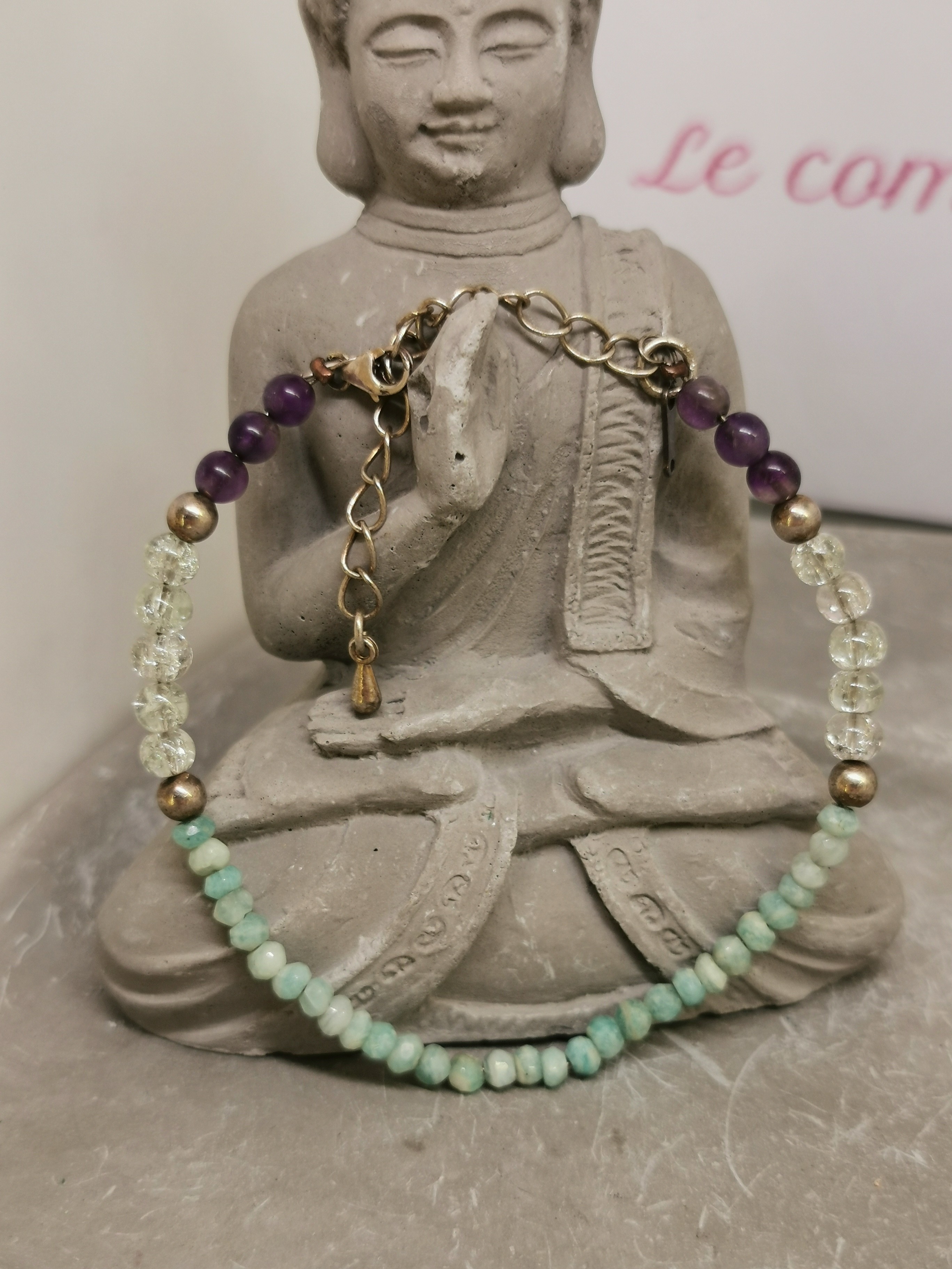 Bracelet améthyste amazonite cristal de roche, équilibre énergie apaisement