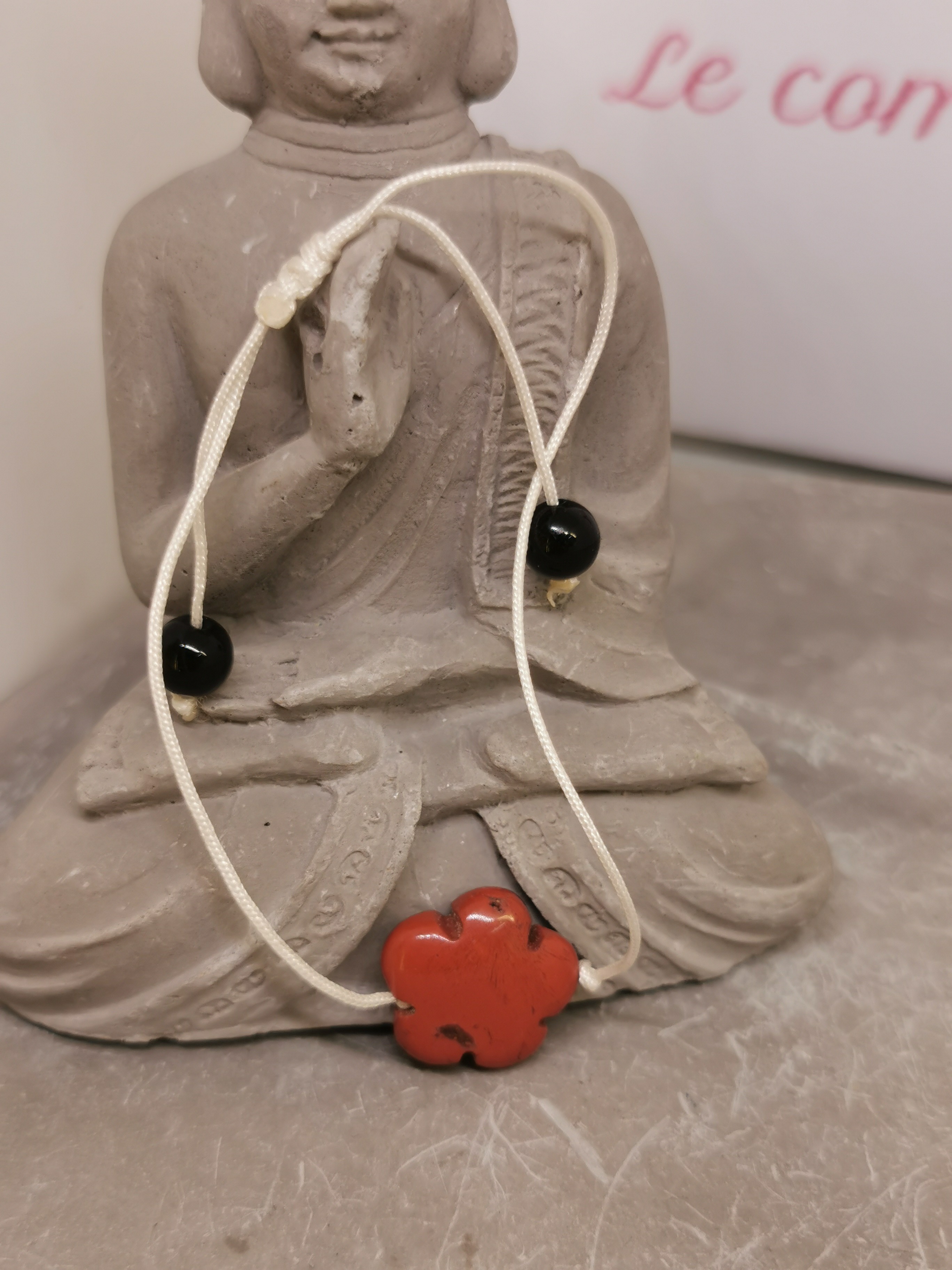 Ce bracelet au caractère affirmé est composé d’un cordon blanc réglable, orné d’une pierre centrale en jaspe rouge sculptée en forme de fleur, accompagnée de deux perles d’obsidienne noire de 6 mm.
