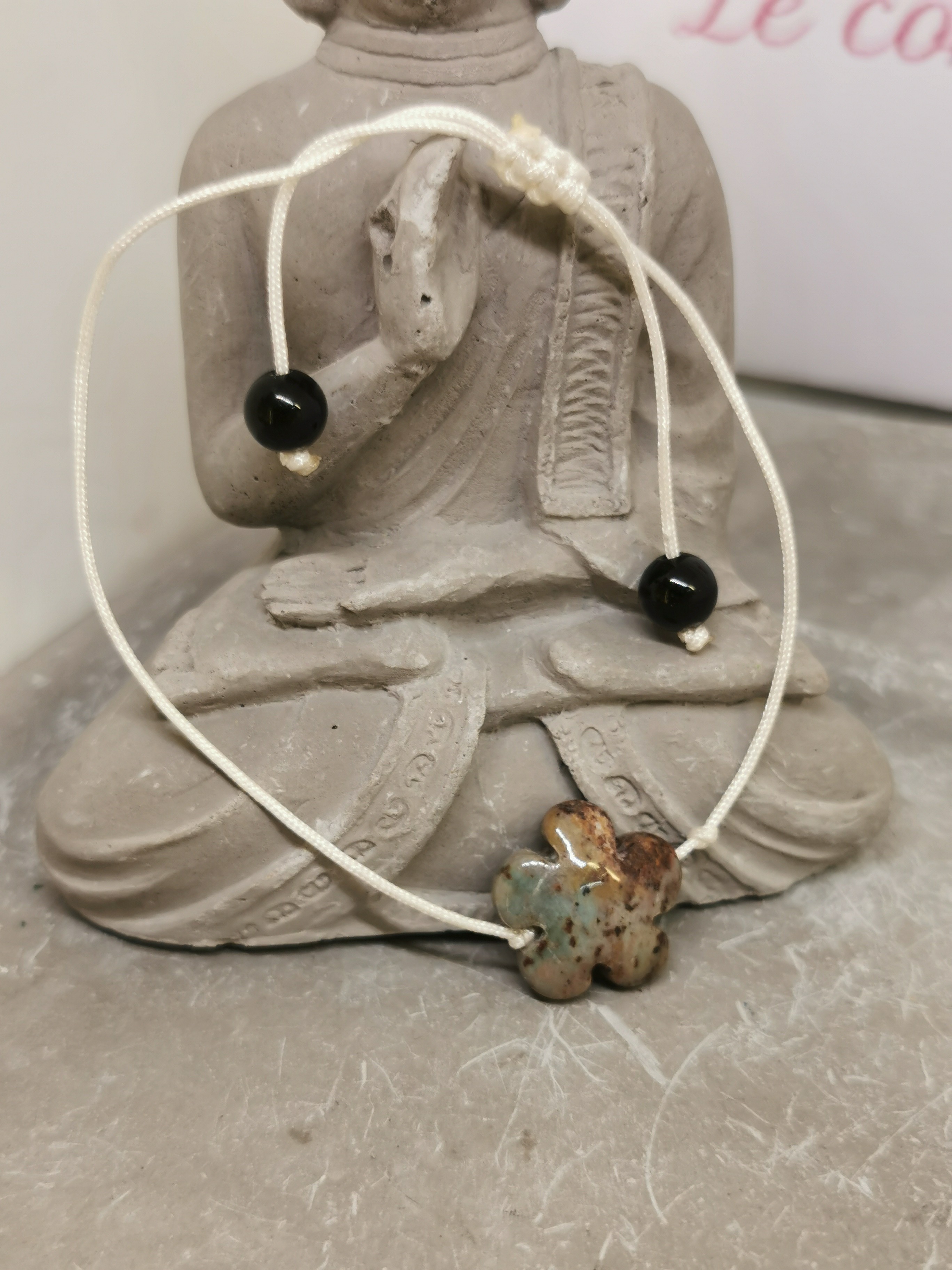 Ce bracelet délicat et naturel est monté sur un cordon blanc réglable, orné d’une pierre centrale en jaspe multicolore sculptée en forme de fleur, accompagnée de deux perles d’obsidienne noire de 6 mm.