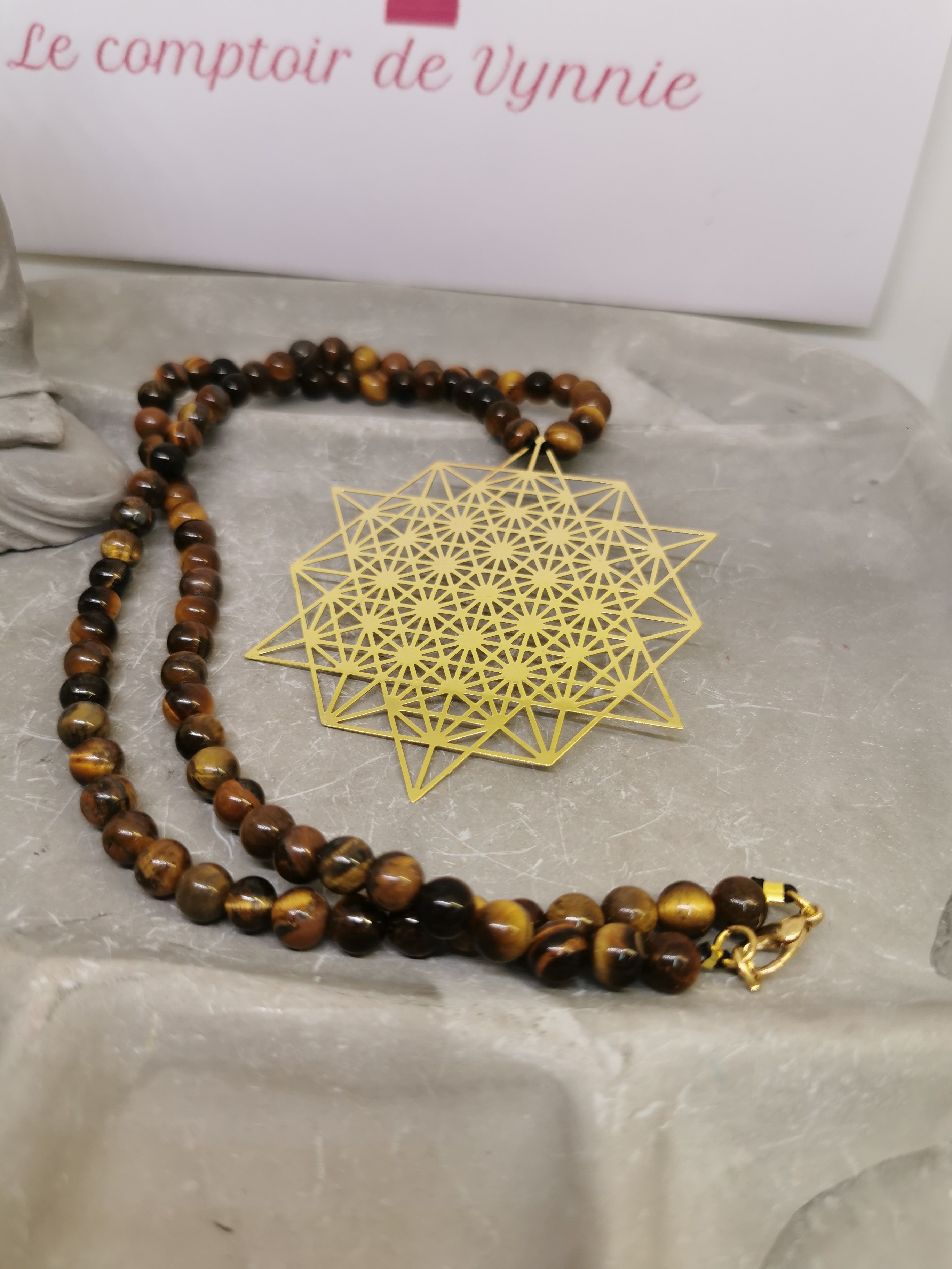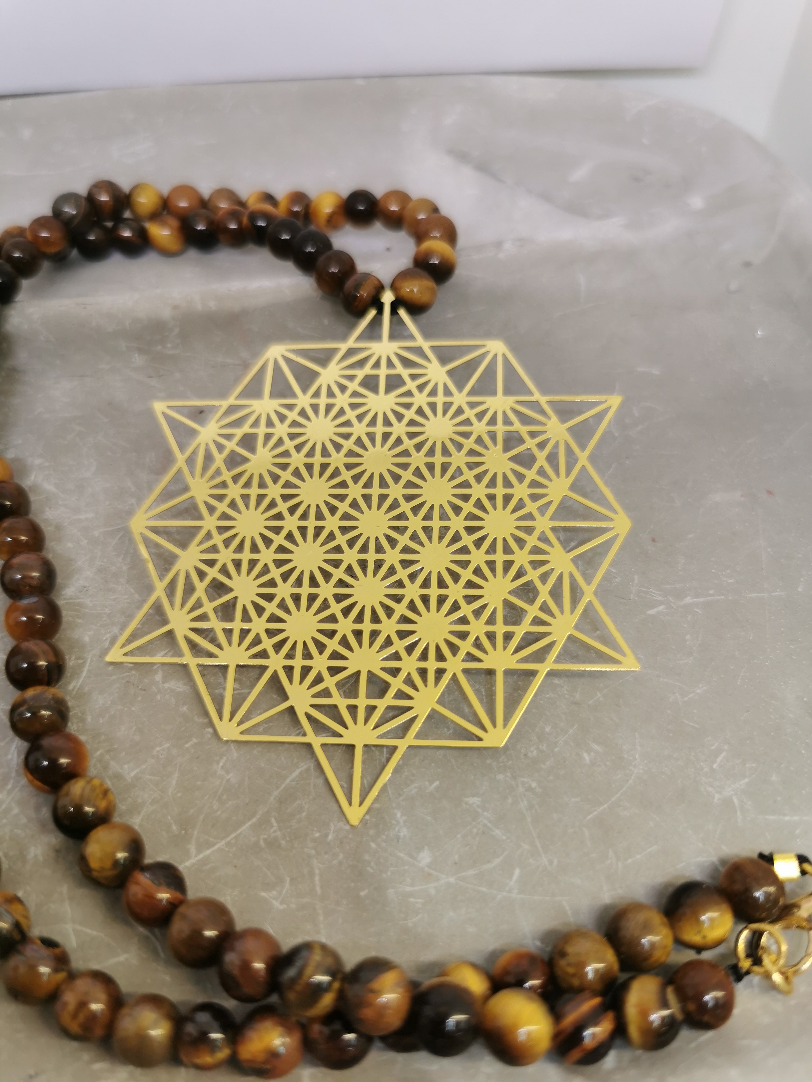 Ce collier artisanal unique associe la puissance naturelle de l’œil du tigre à la géométrie sacrée du Cube de Métatron, finement travaillé en plaqué or 24 carats (5 microns).