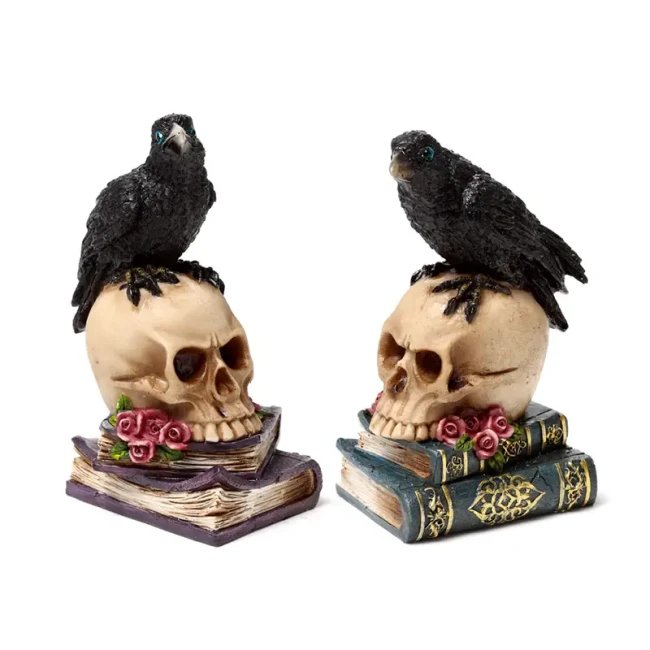 Fabriquée en résine, cette décoration mystique présente des détails riches : le regard perçant du corbeau, les roses symboliques et les livres anciens qui renforcent l’aspect ésotérique et intellectuel de la pièce.