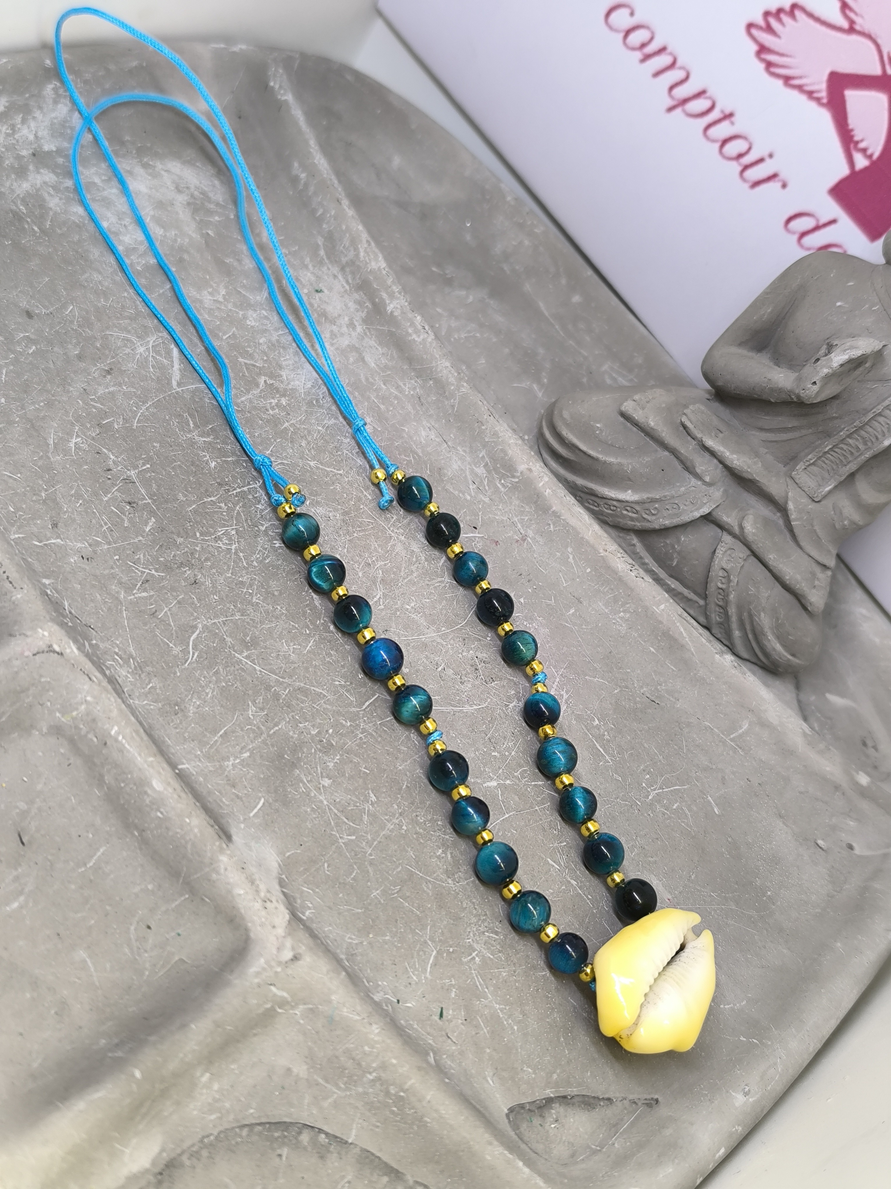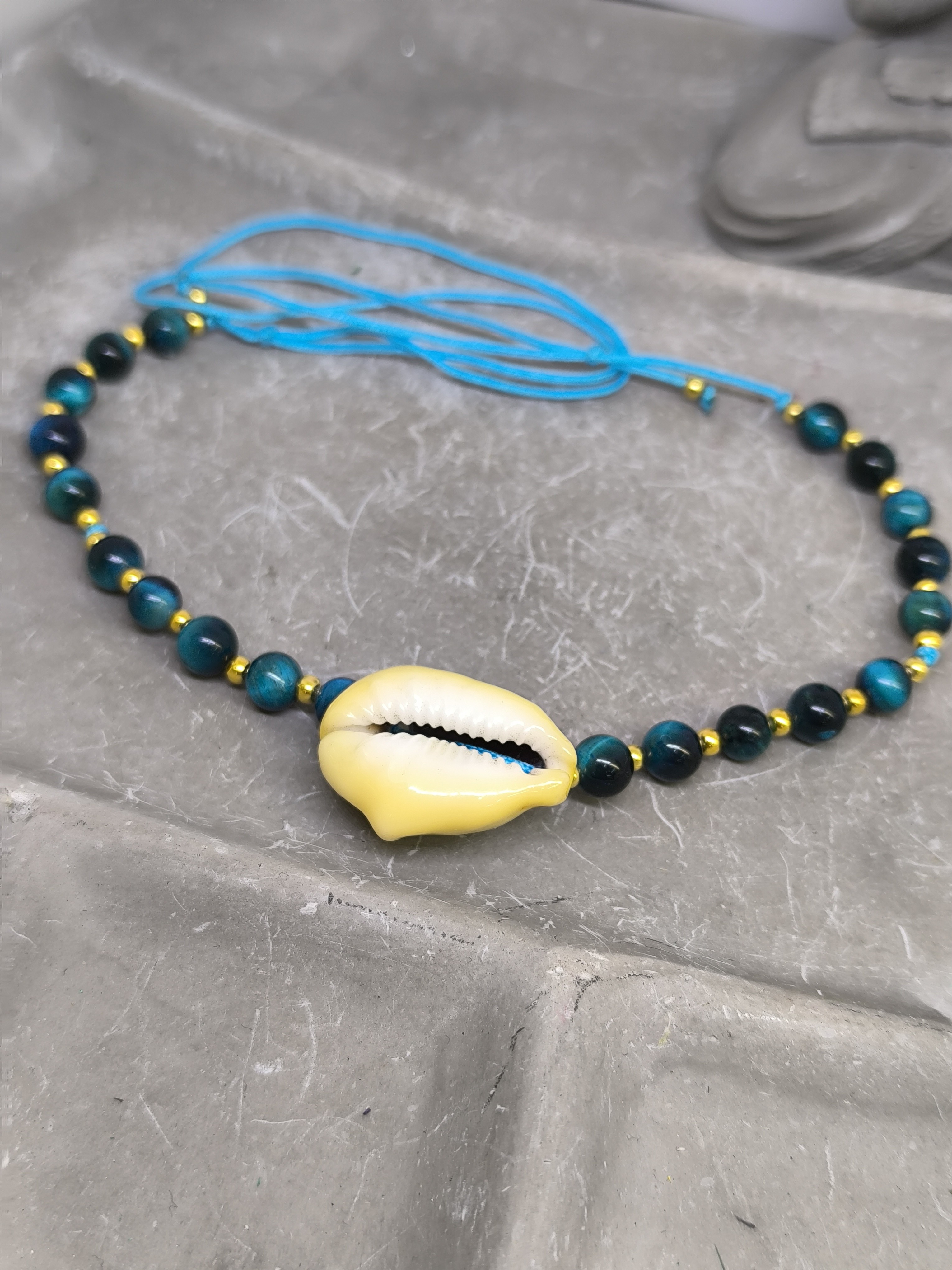 Ce collier réglable au style estival et spirituel associe la puissance de l’œil de tigre bleu à la symbolique protectrice du coquillage de Tahiti. Un bijou unique, à la fois élégant et chargé d’énergie, idéal pour accompagner votre quotidien avec douceur et protection.