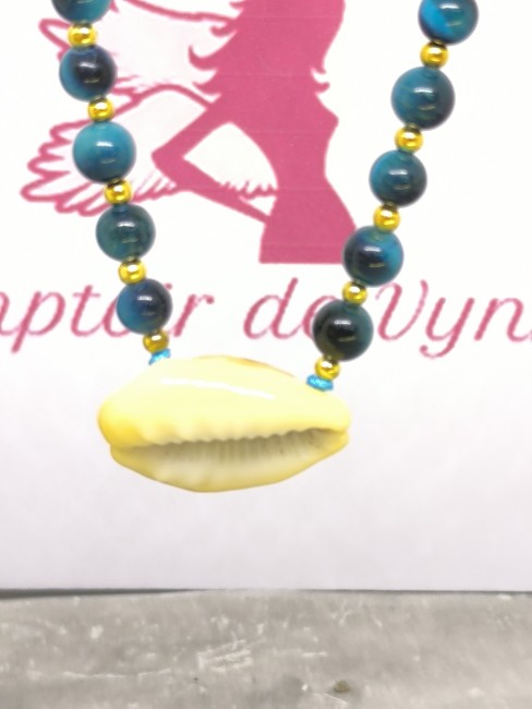 Collier coquillage Tahiti et œil de tigre bleu – Énergie, protection et élégance – Bijou fait main