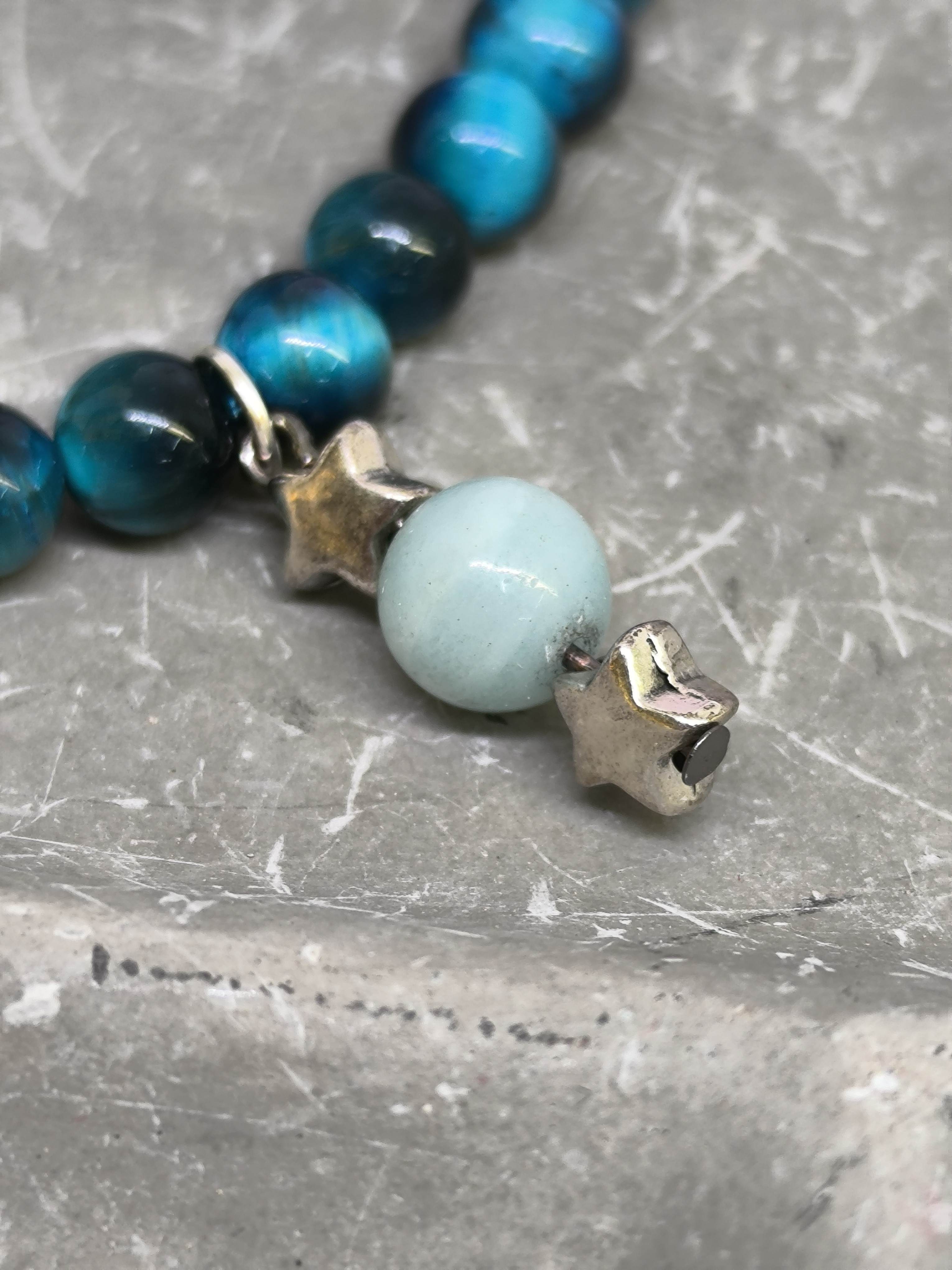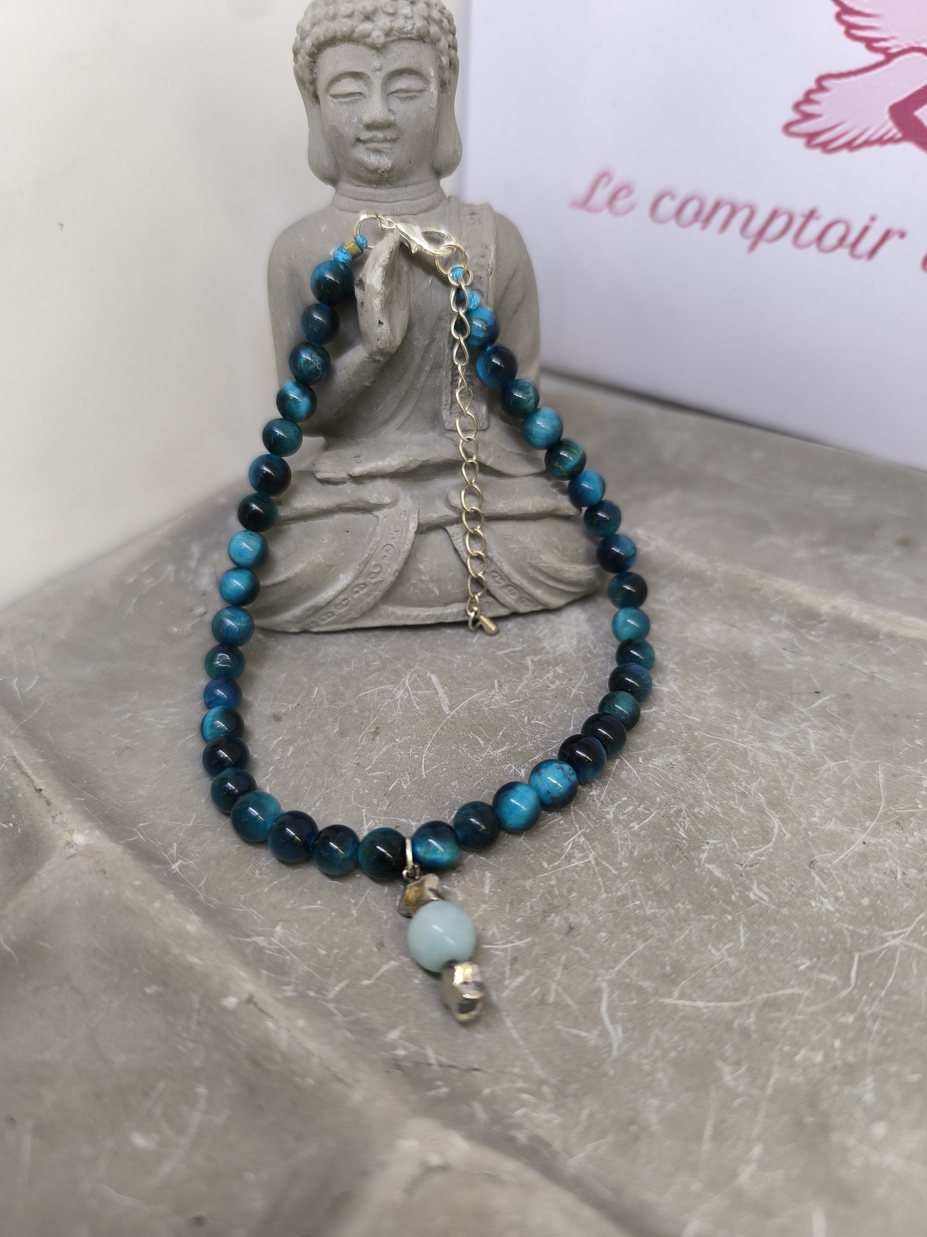 L’œil de tigre bleu, reconnu en lithothérapie, est une pierre de protection qui favorise la clarté mentale et aide à apaiser les tensions émotionnelles. L’amazonite, quant à elle, est une pierre de sérénité, idéale pour calmer les émotions et favoriser une communication fluide.