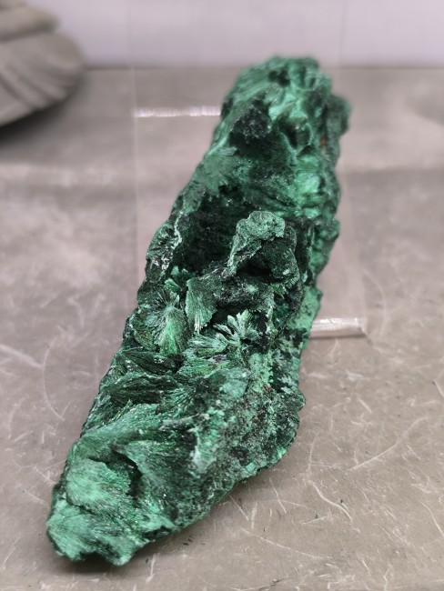 Cette malachite fibreuse brute se distingue par son aspect dense et organique, mêlant zones veloutées et structures cristallines en éventail. Sa couleur verte profonde, presque sombre par endroits, contraste avec des zones plus lumineuses, révélant toute la richesse de sa formation naturelle.
