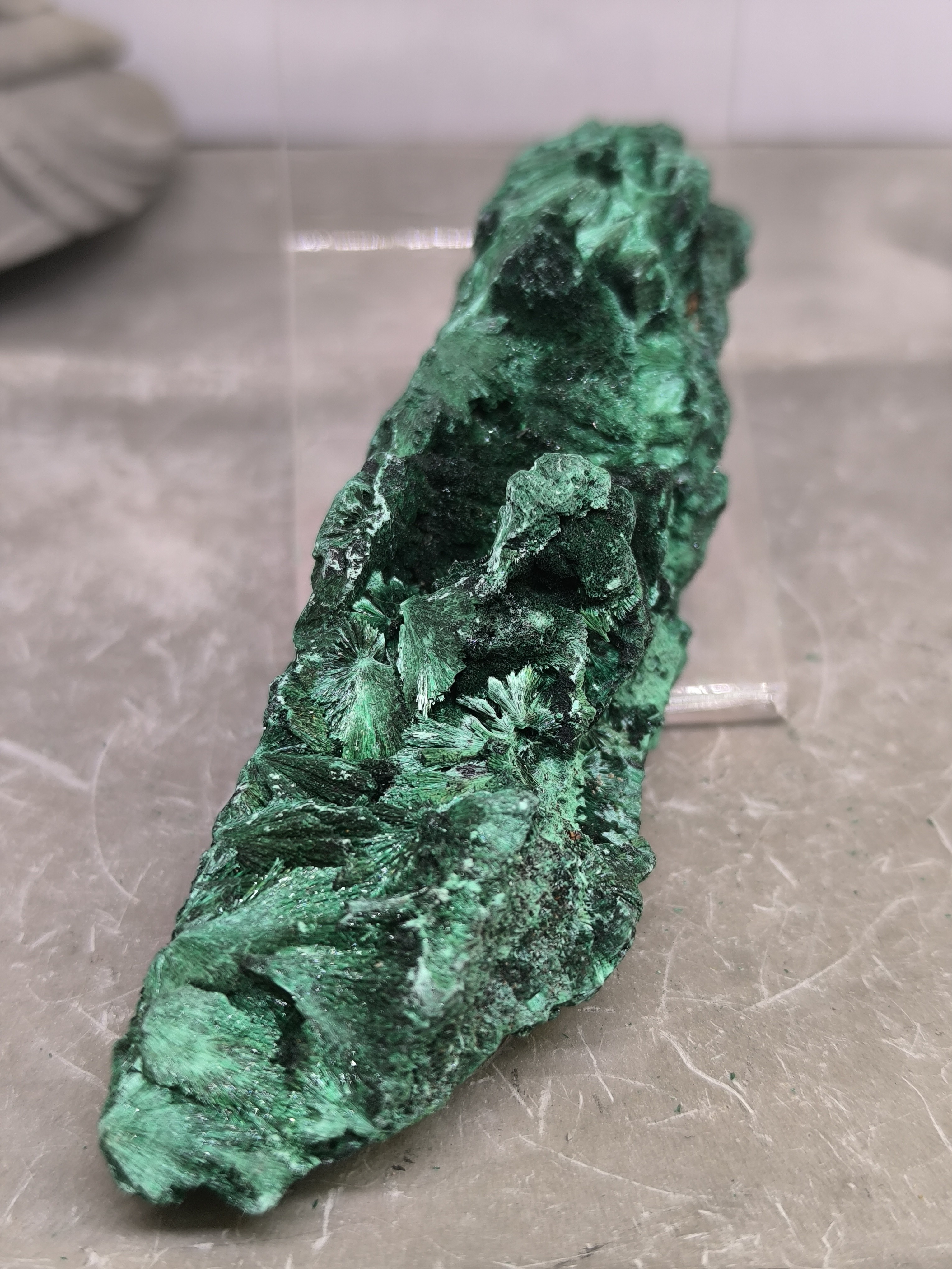 Cette malachite fibreuse brute se distingue par sa forme allongée atypique, qui lui confère un caractère unique et élégant. Sa structure révèle de superbes formations fibreuses en éventail, visibles sur toute la longueur de la pierre.