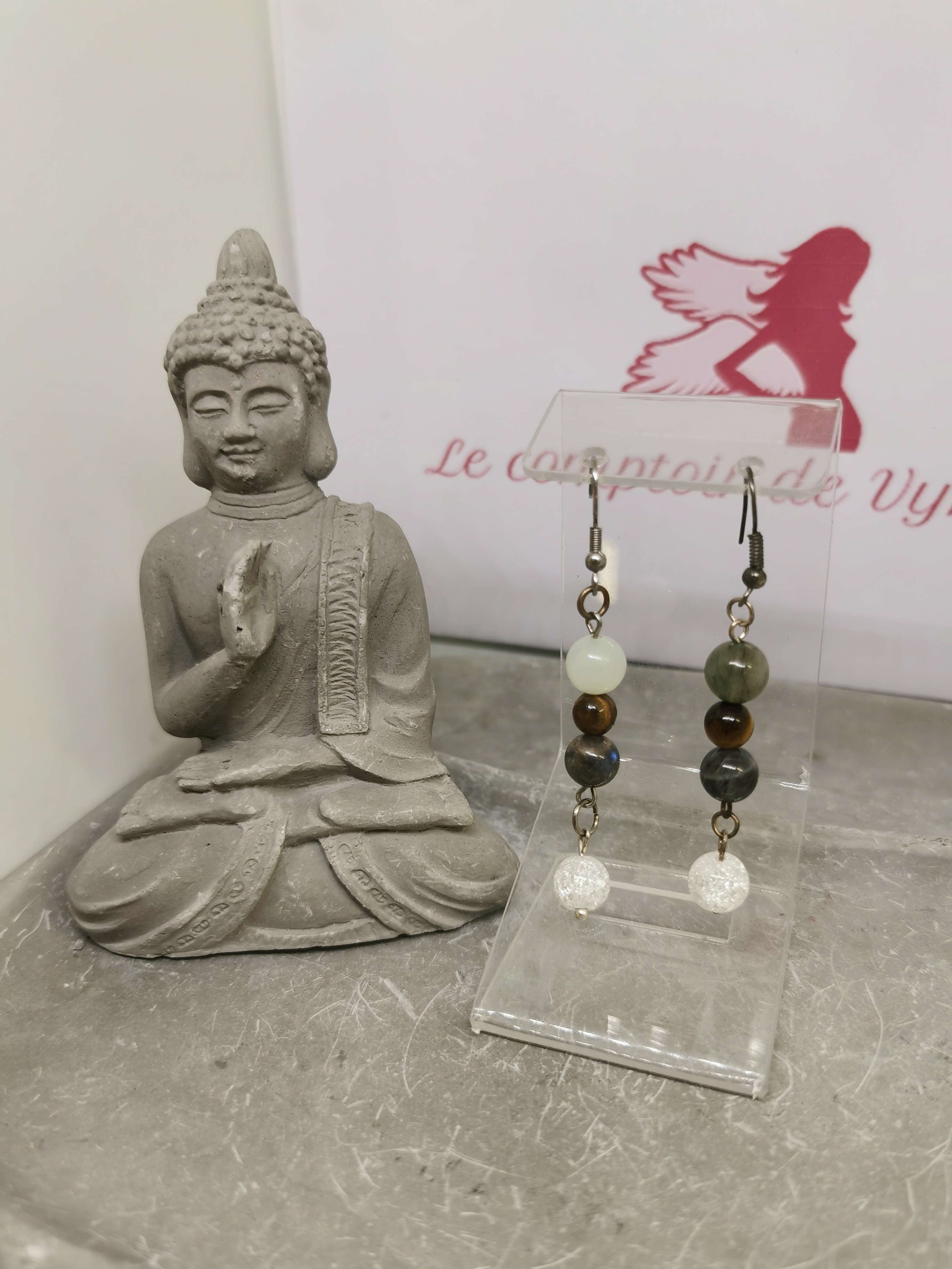 Ces boucles d’oreilles en pierres naturelles associent quatre pierres complémentaires : le cristal de roche, la labradorite, l’œil du tigre et l’aventurine, créant un bijou énergétique complet et équilibré.