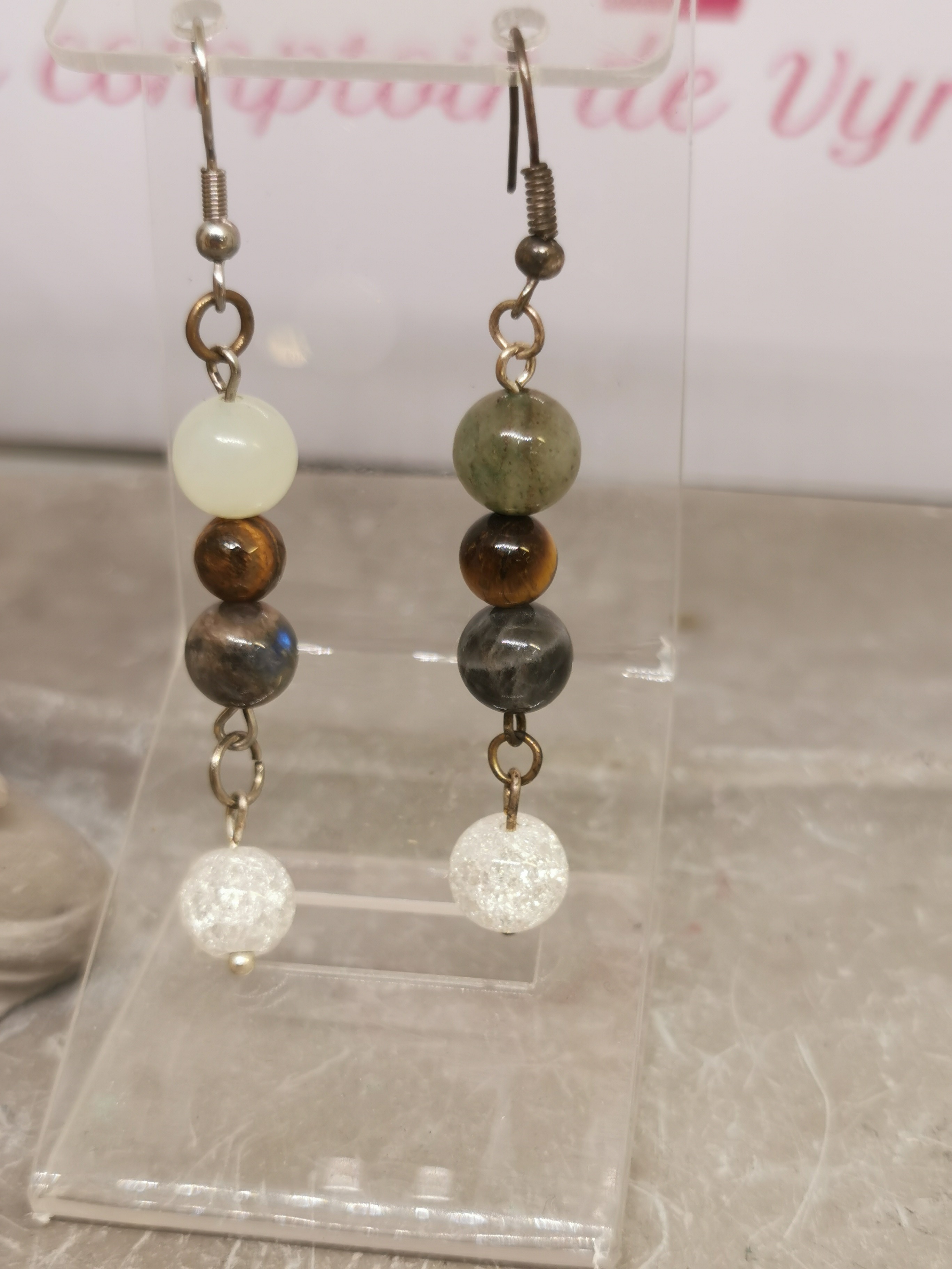 Boucles d’oreilles Cristal de roche, Labradorite, Œil du tigre et Aventurine