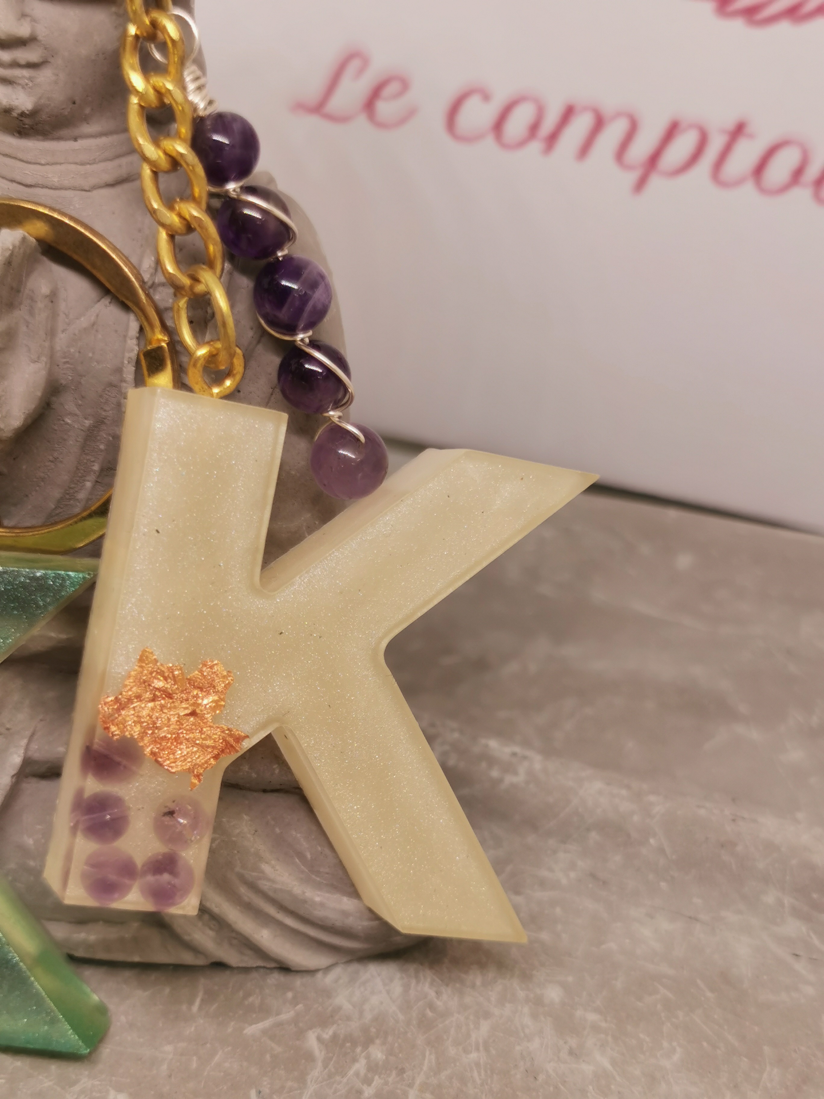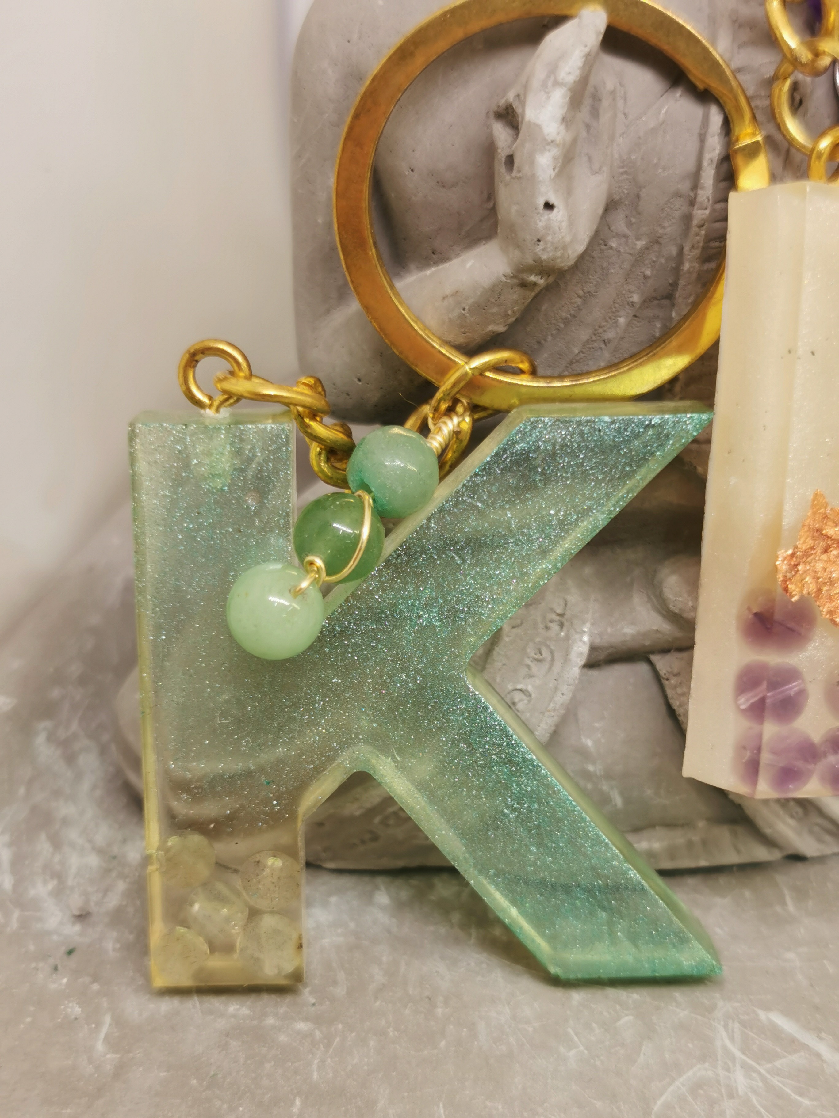 Porte-clé lettre K en résine en Aventurine et améthyste