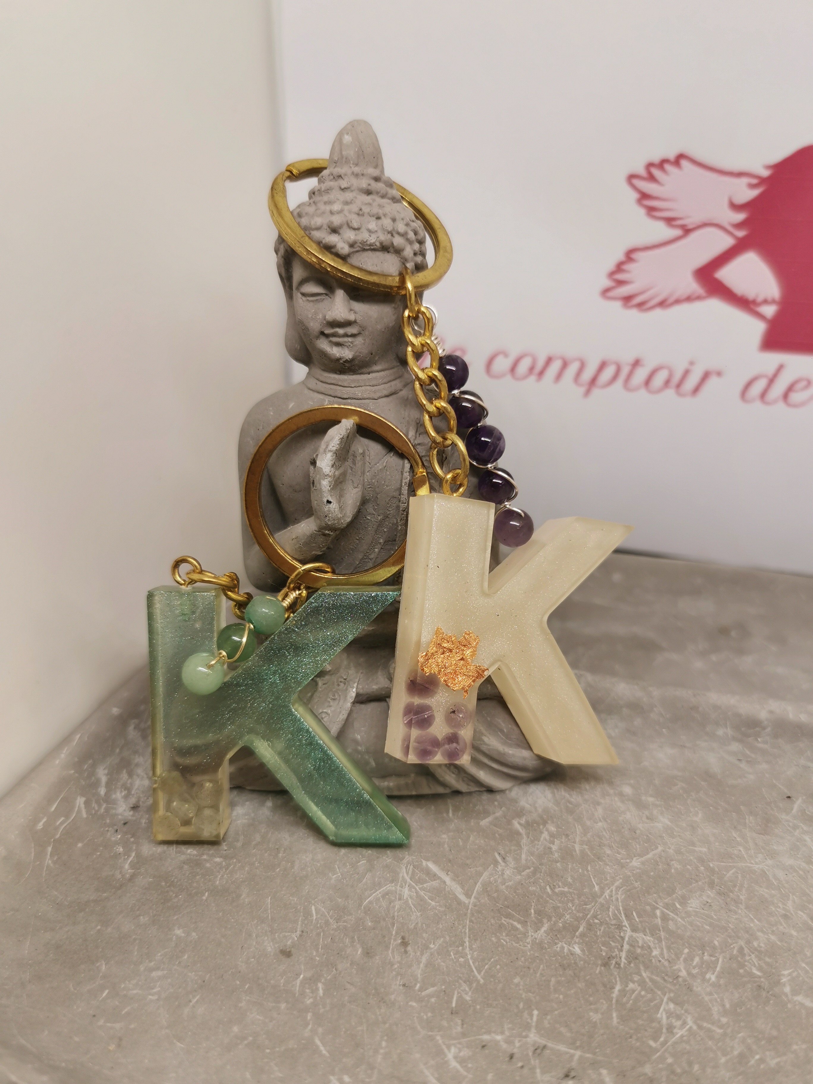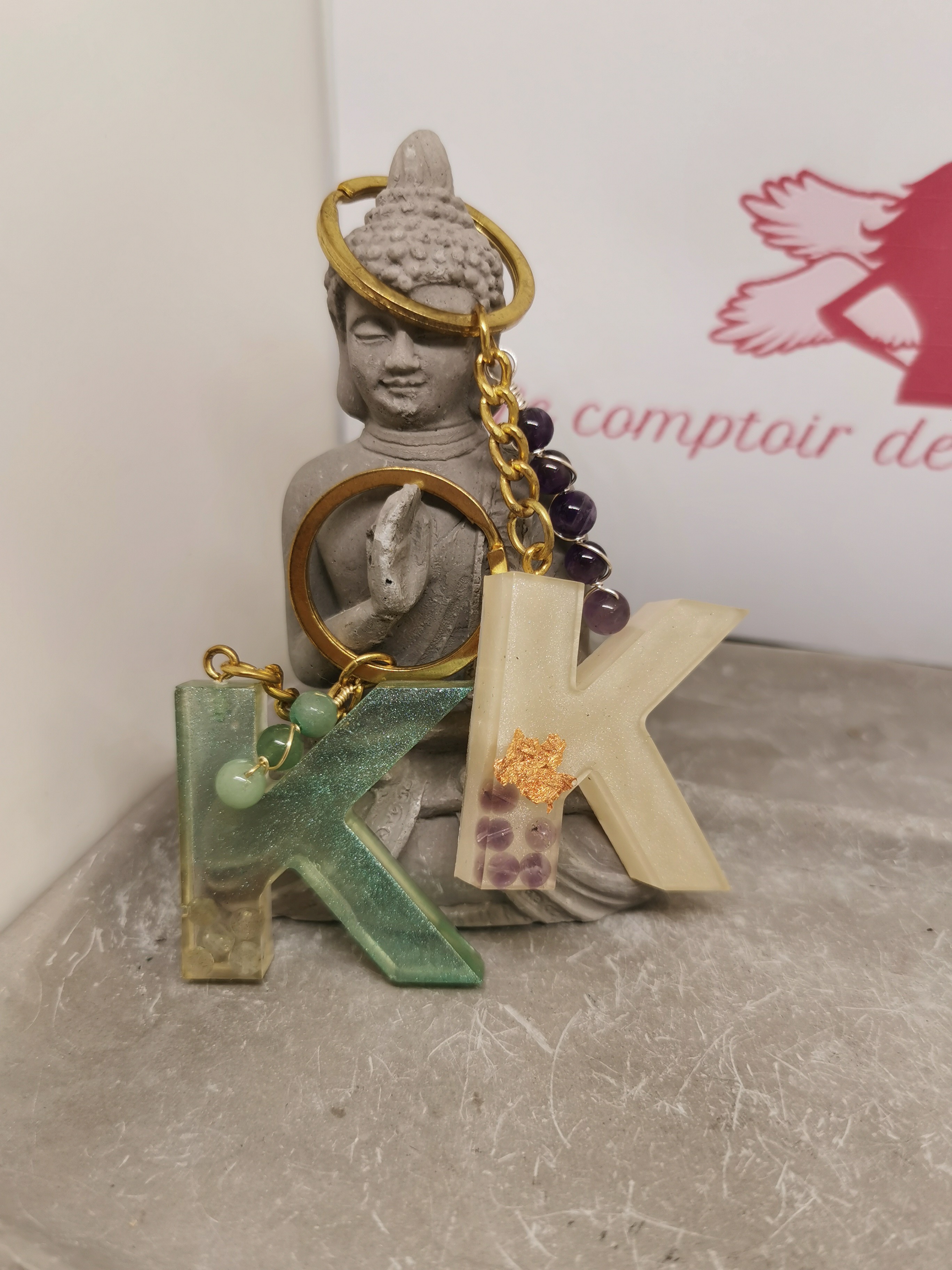 Affirmez votre identité avec ce porte-clé lettre K en résine, une création artisanale alliant élégance et puissance des pierres naturelles pour vous accompagner au quotidien.