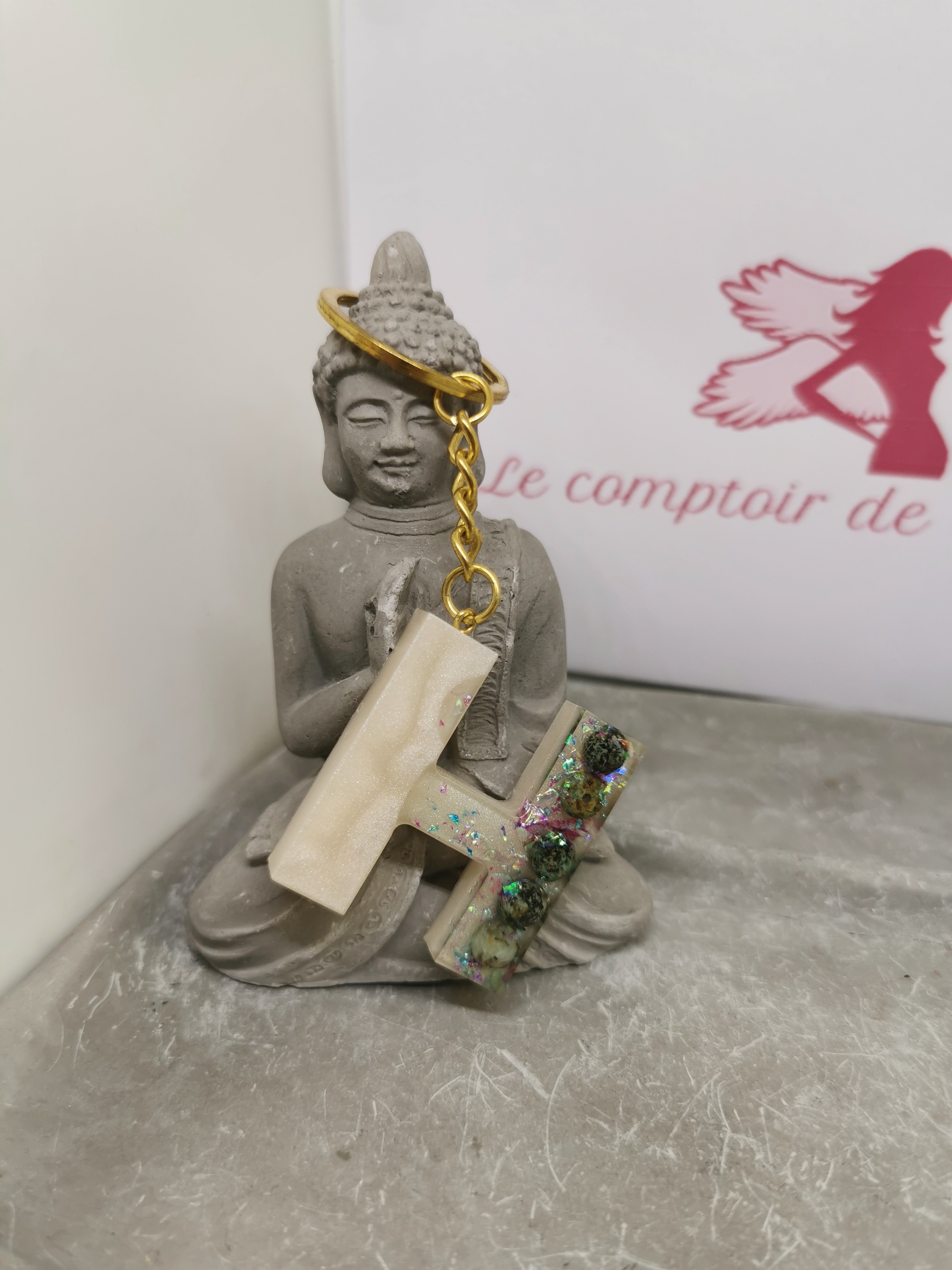Apportez équilibre et douceur à votre quotidien avec ce porte-clé lettre H en résine, une création artisanale lumineuse et chargée d’énergie positive.