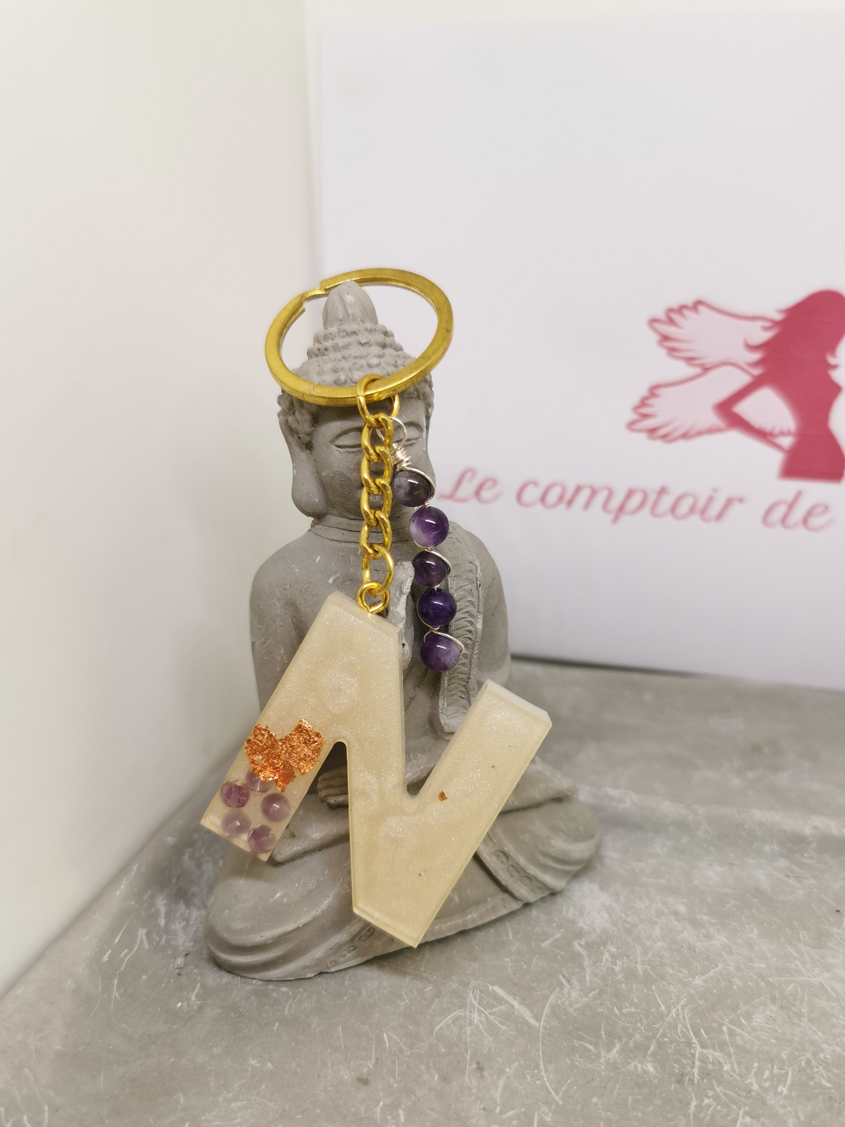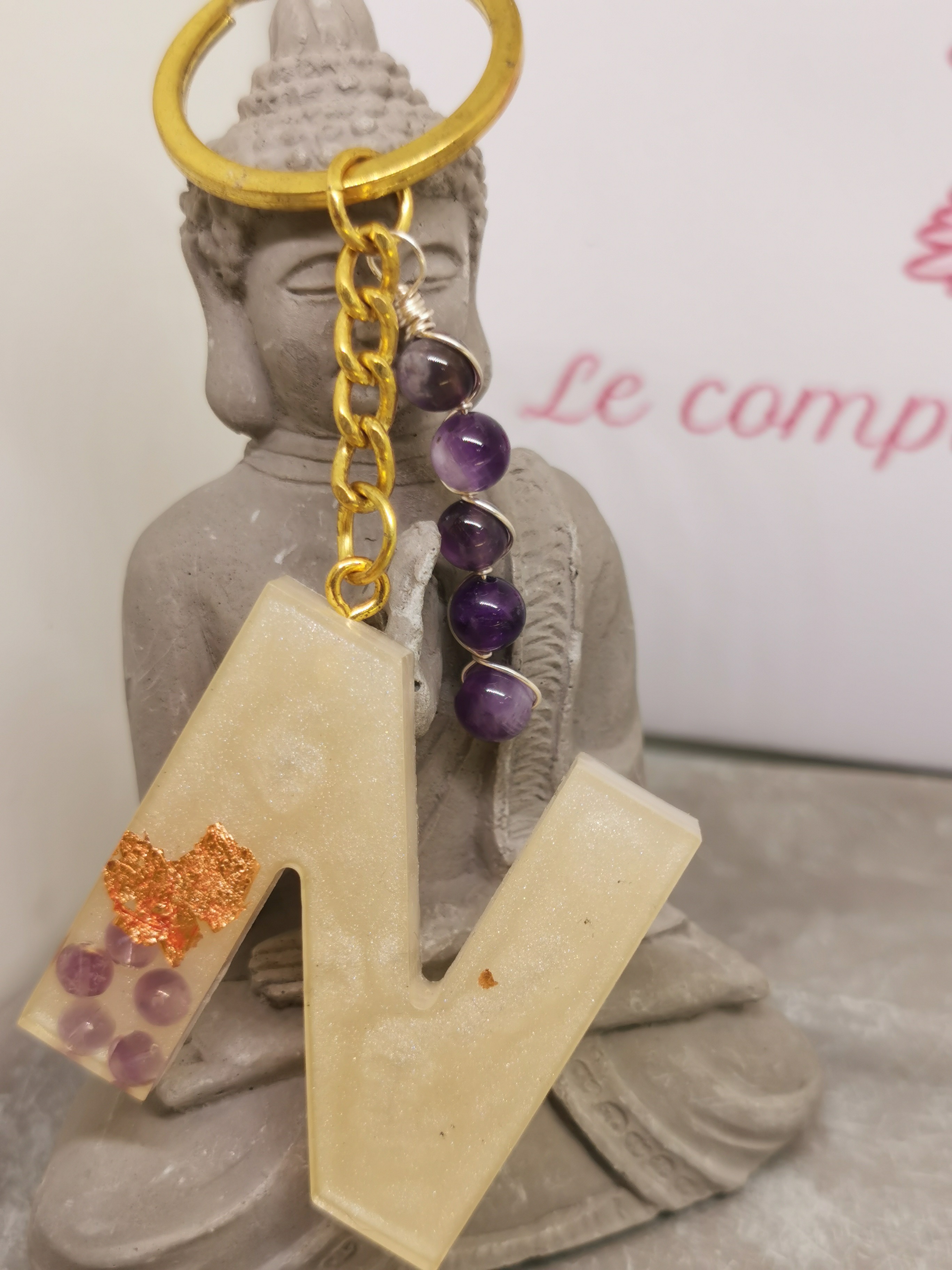Ce porte-clé lettre N en résine fait main est une pièce artisanale délicate et symbolique. Sa teinte dorée subtilement pailletée, sublimée par une feuille de cuivre et des inclusions d’améthyste, lui confère une élégance chaleureuse et spirituelle.