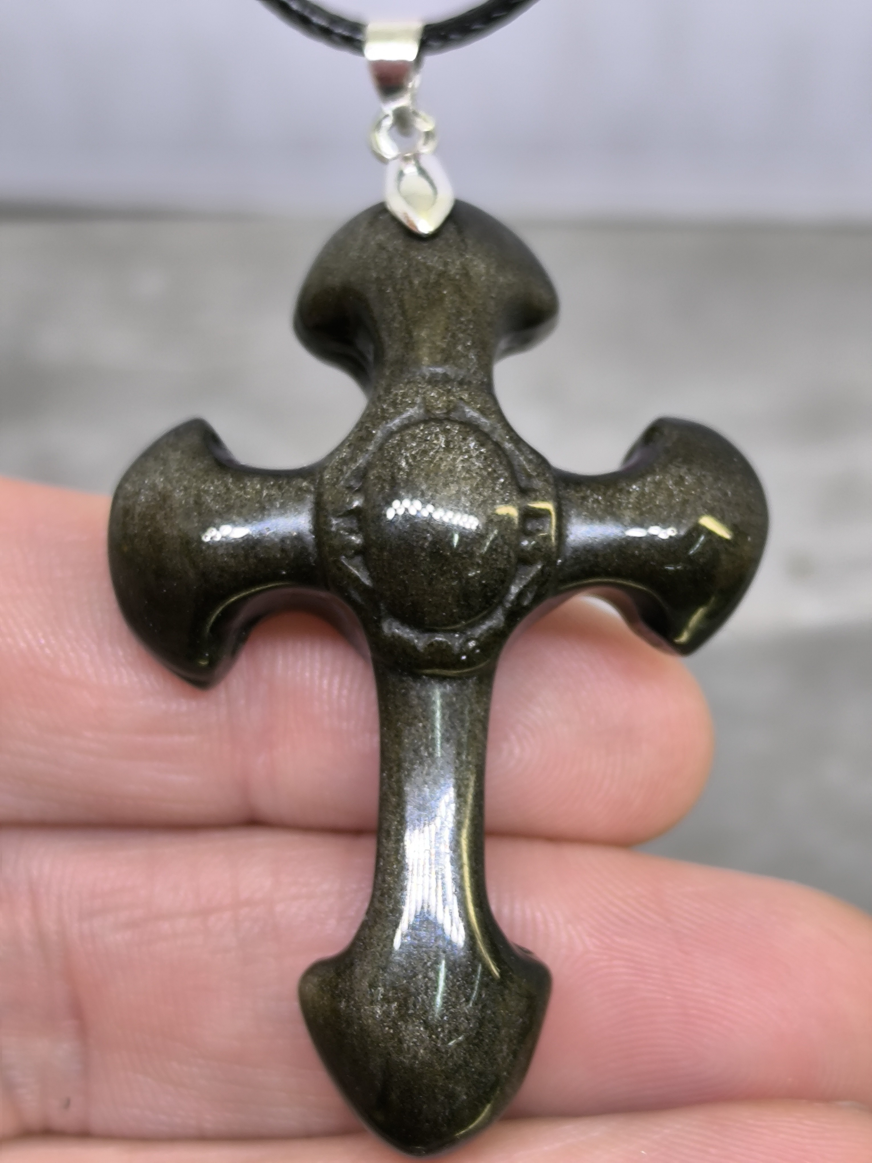 Ce collier en pierre naturelle met en valeur une magnifique croix sculptée dans une obsidienne dorée, pierre rare aux reflets subtils et fascinants. Chaque détail gravé dans la croix souligne le travail artisanal et apporte une dimension symbolique forte à ce bijou ésotérique.